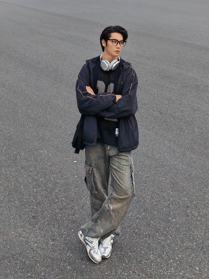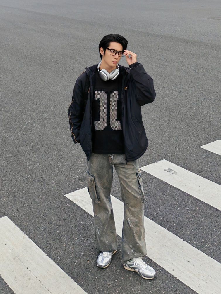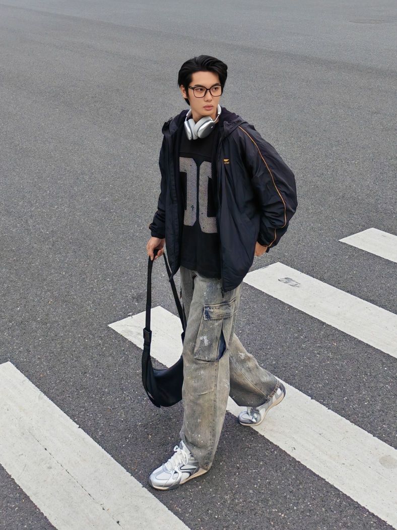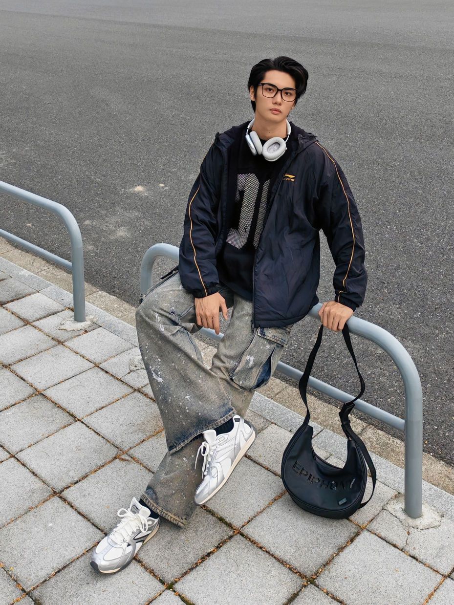 hello呀 这里是镭子的秋季穿搭分享 这套街头风穿搭太有层次感啦! 黑色夹克外套帅气又防风,内搭个性印花卫衣,细节满满。 泼墨阔腿牛仔裤复古又随性,搭配李宁 菲林Retro银白薄底鞋,利落出街。 挂脖耳机和黑色斜挎包,既实用又提升造型感。 眼镜点睛,整体松弛有度,通勤出街都超有范儿。