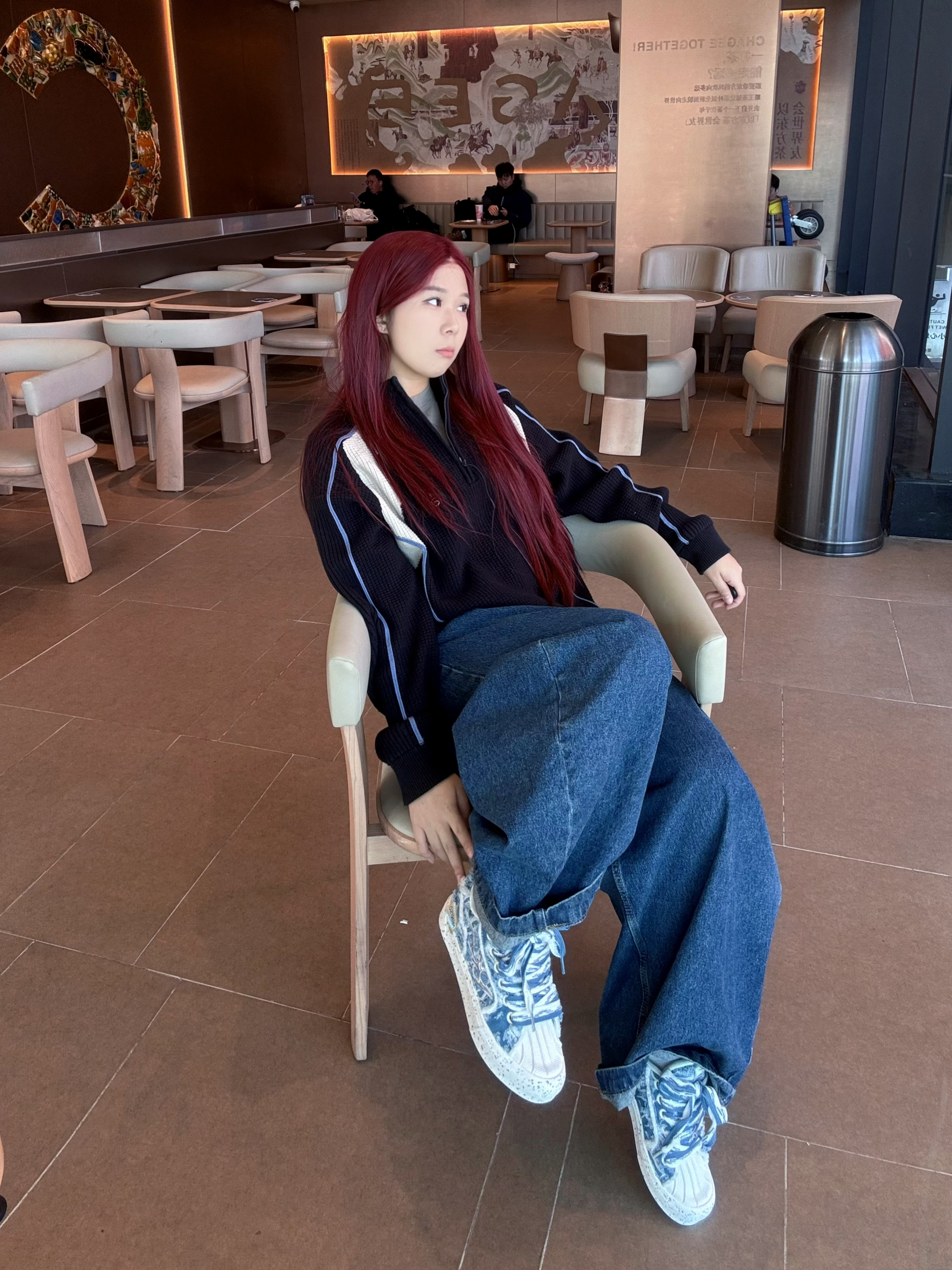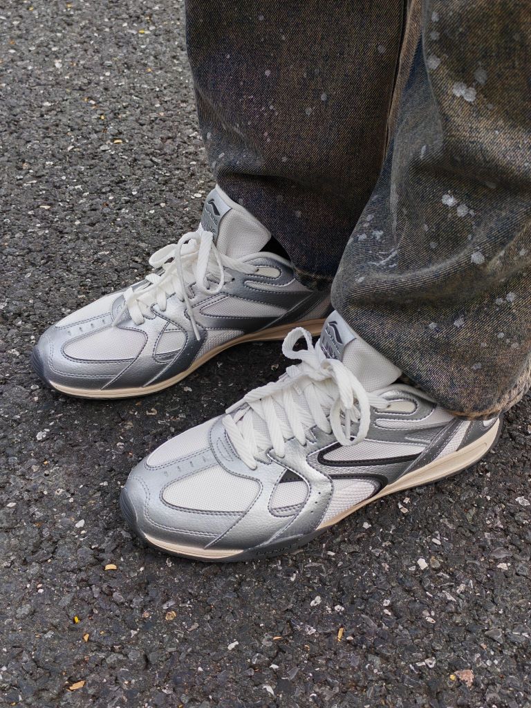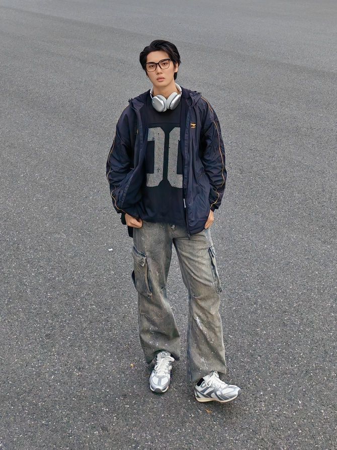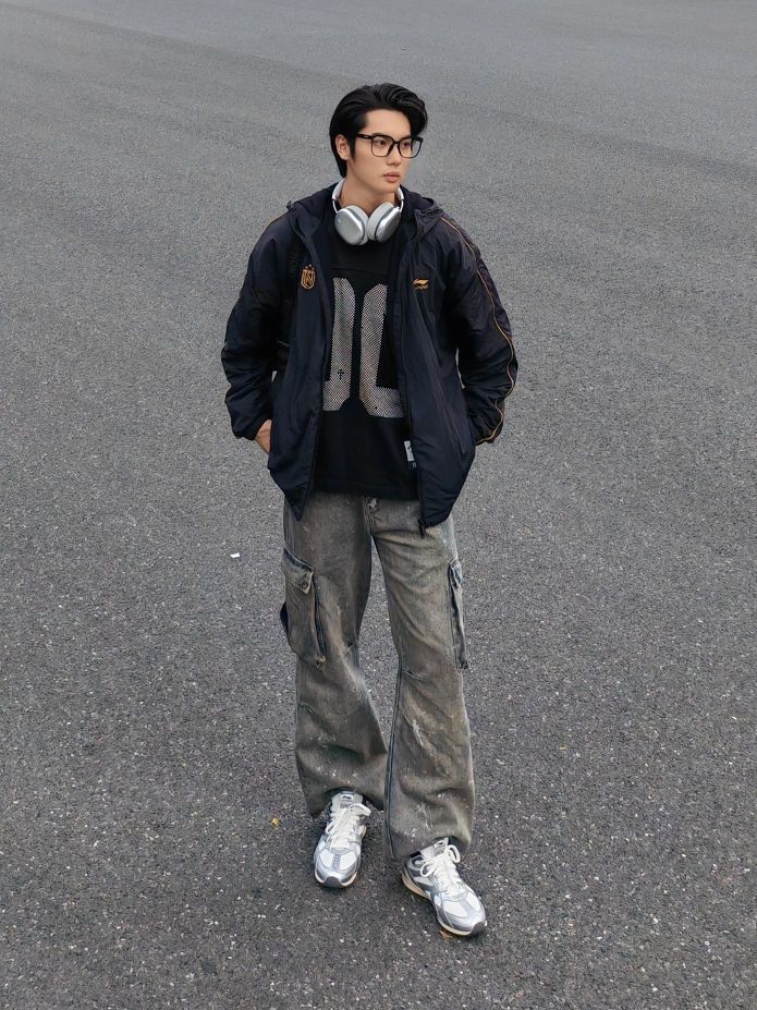 hello呀 这里是镭子的秋季穿搭分享 这套街头风穿搭太有层次感啦! 黑色夹克外套帅气又防风,内搭个性印花卫衣,细节满满。 泼墨阔腿牛仔裤复古又随性,搭配李宁 菲林Retro银白薄底鞋,利落出街。 挂脖耳机和黑色斜挎包,既实用又提升造型感。 眼镜点睛,整体松弛有度,通勤出街都超有范儿。
