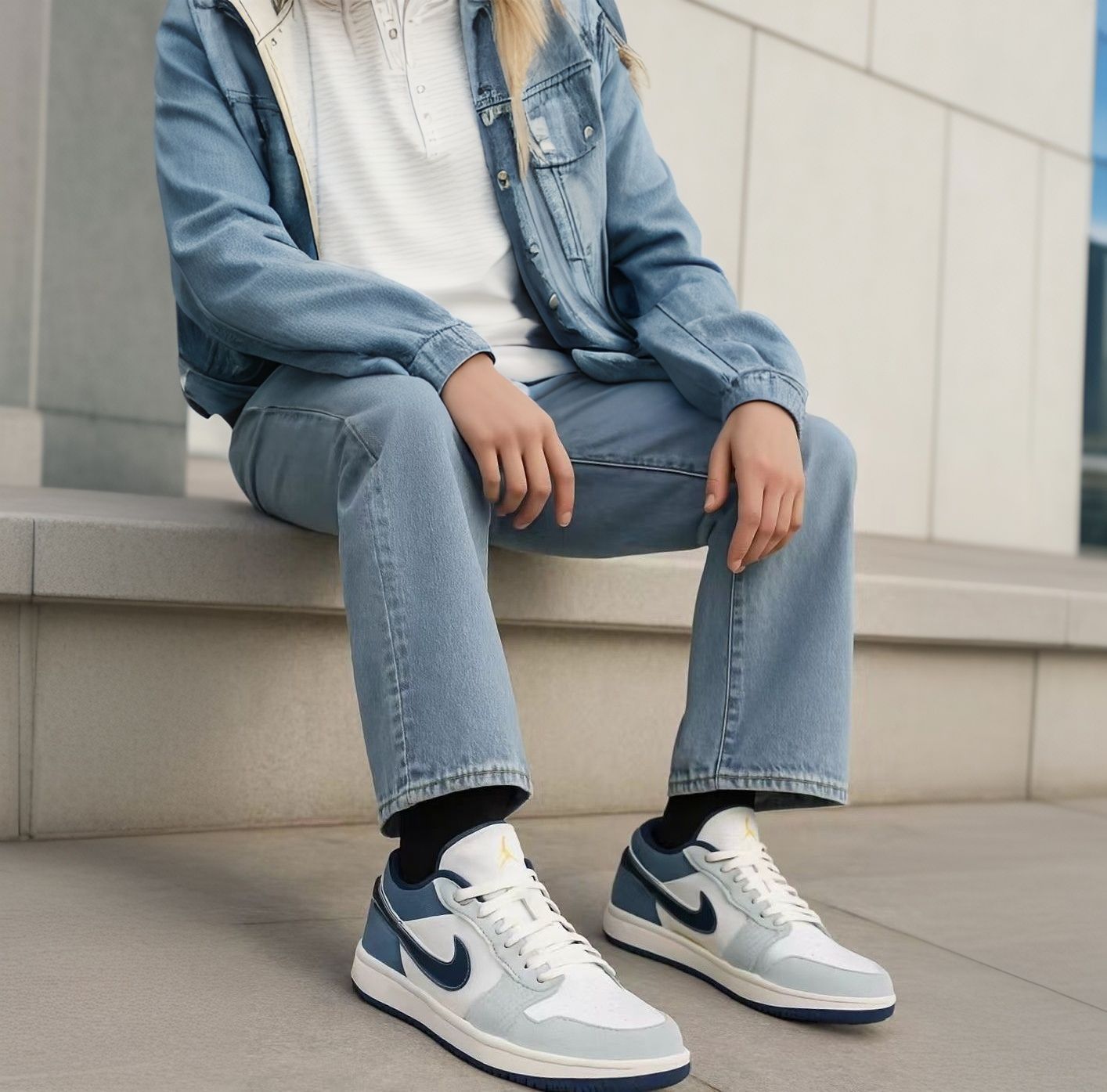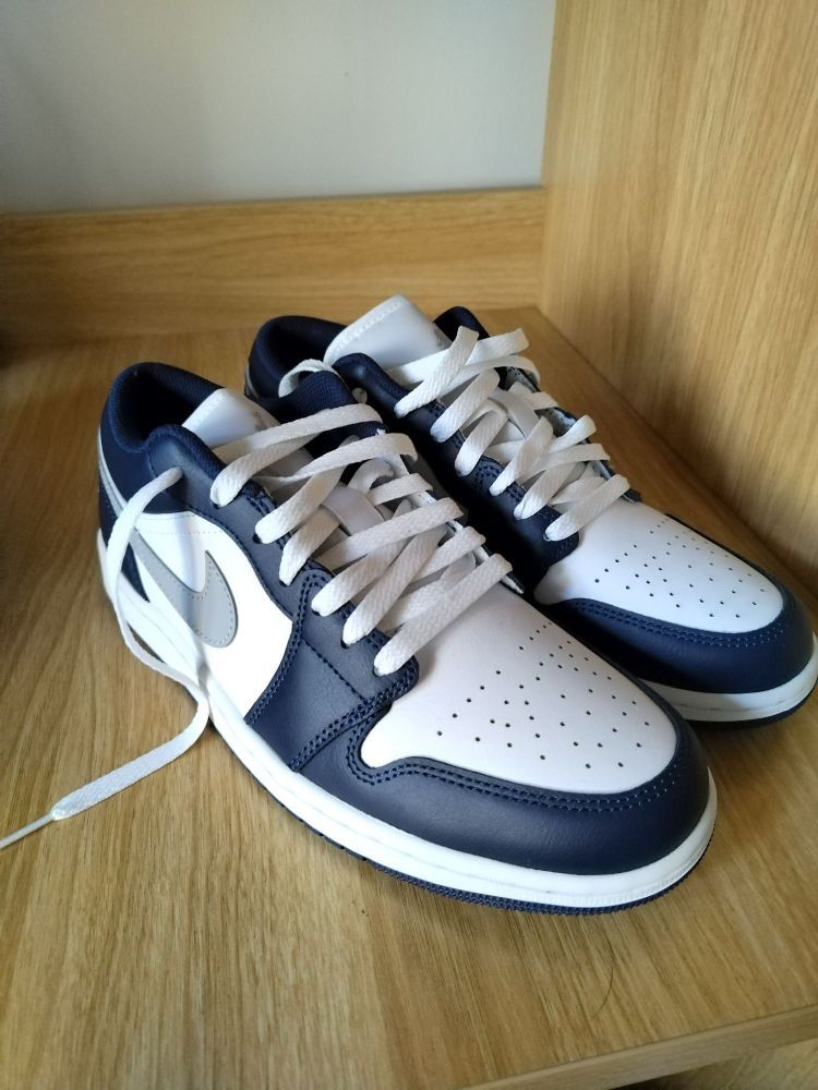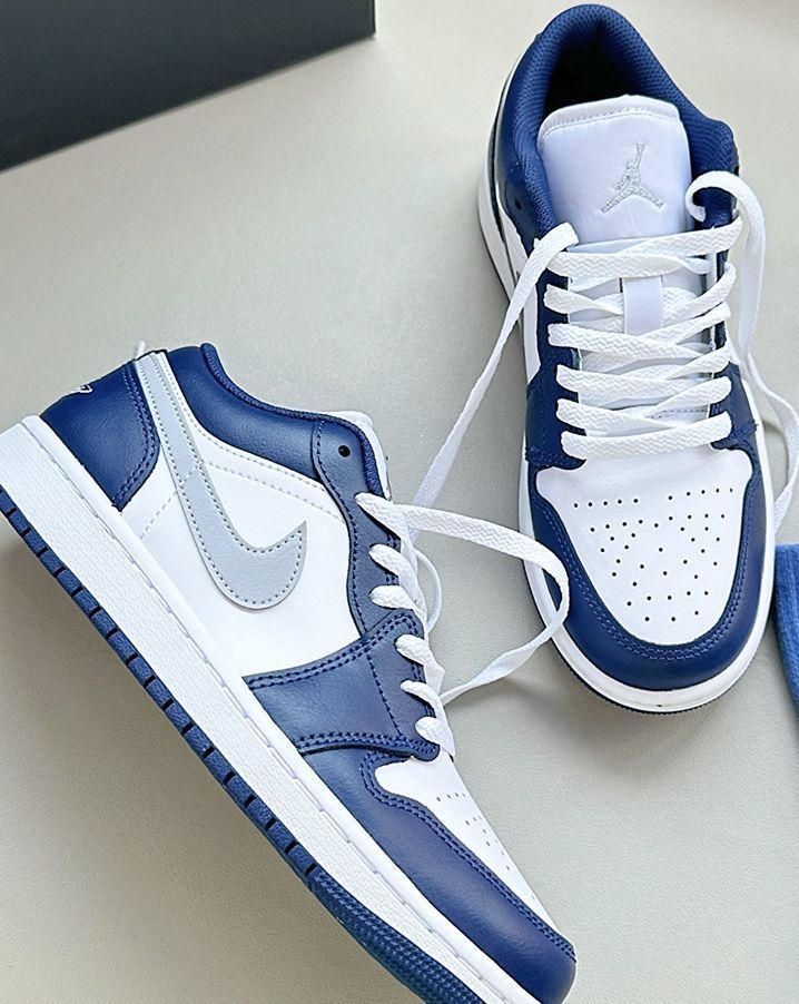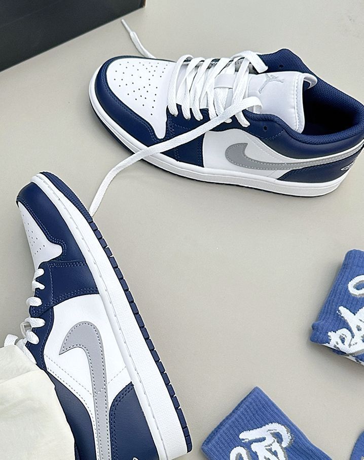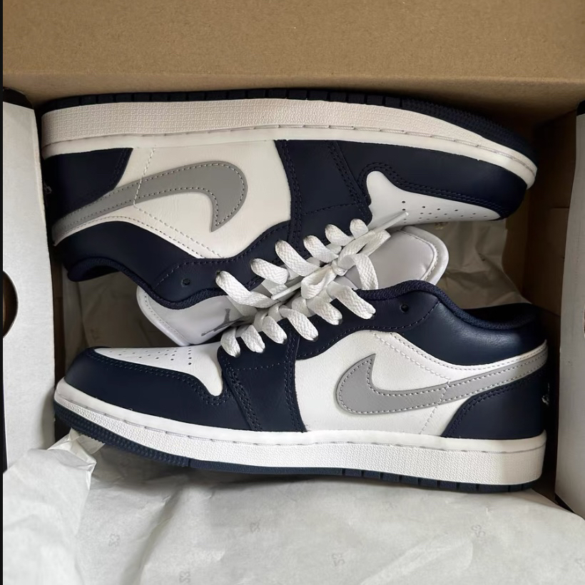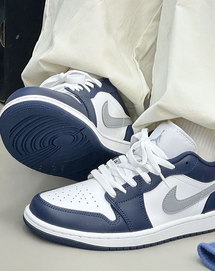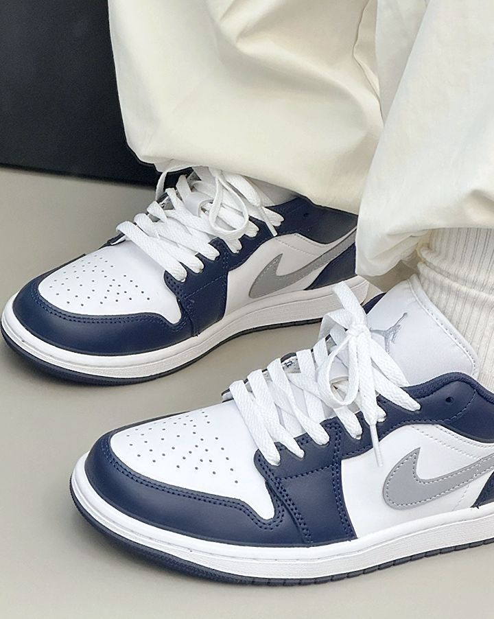 这双新出的海军蓝 AJ1 配色我个人挺喜欢的 干净的白搭配深邃的蓝 加上狼灰色的 Swoosh 整体清爽又耐看 皮质质感不错 低帮鞋型也容易搭配 我平时出门不知道穿什么的时候 常常会选它 配一条简单的运动裤或牛仔裤就挺合适的 是一双实穿度高,也不挑风格的日常鞋款