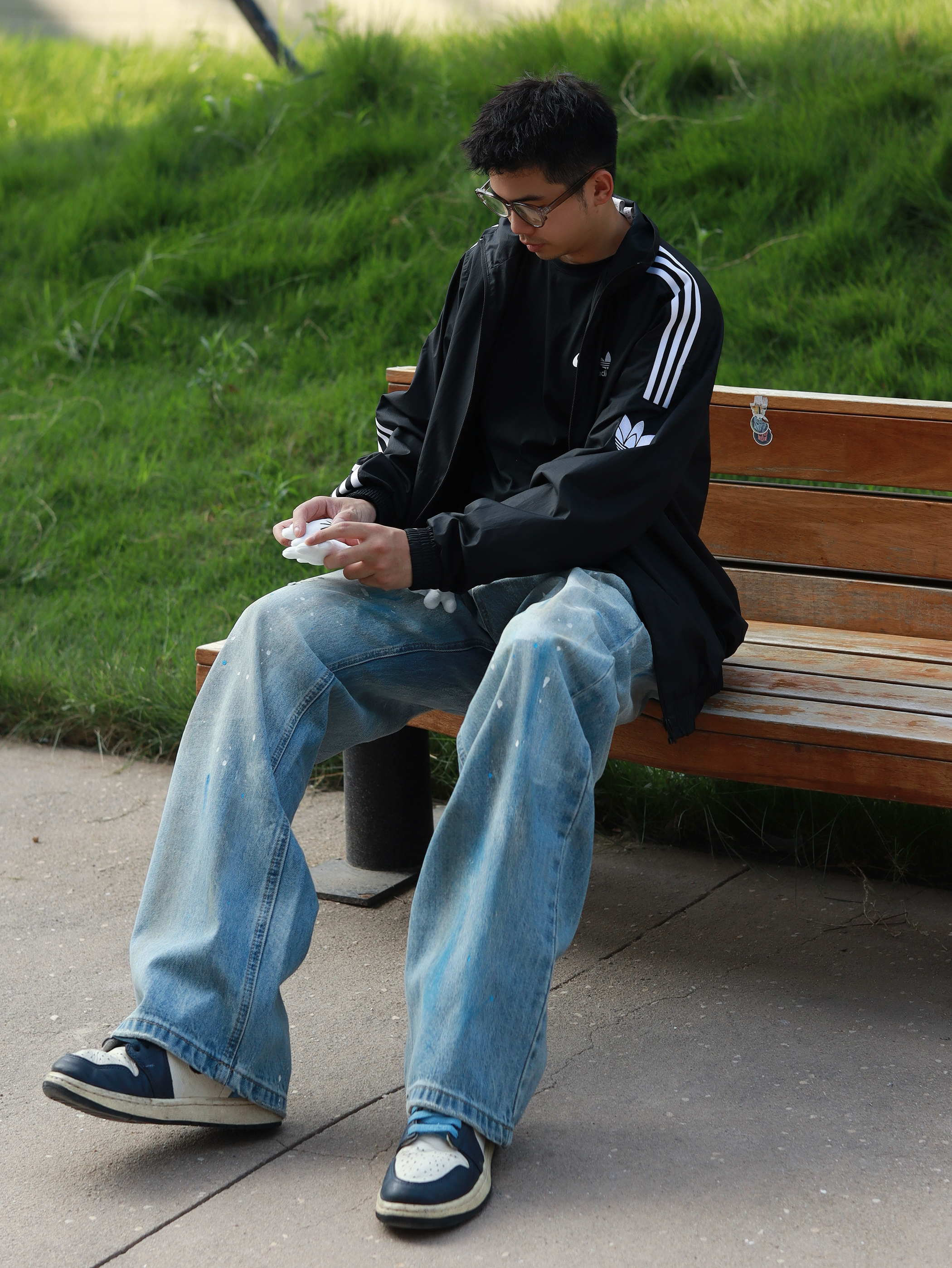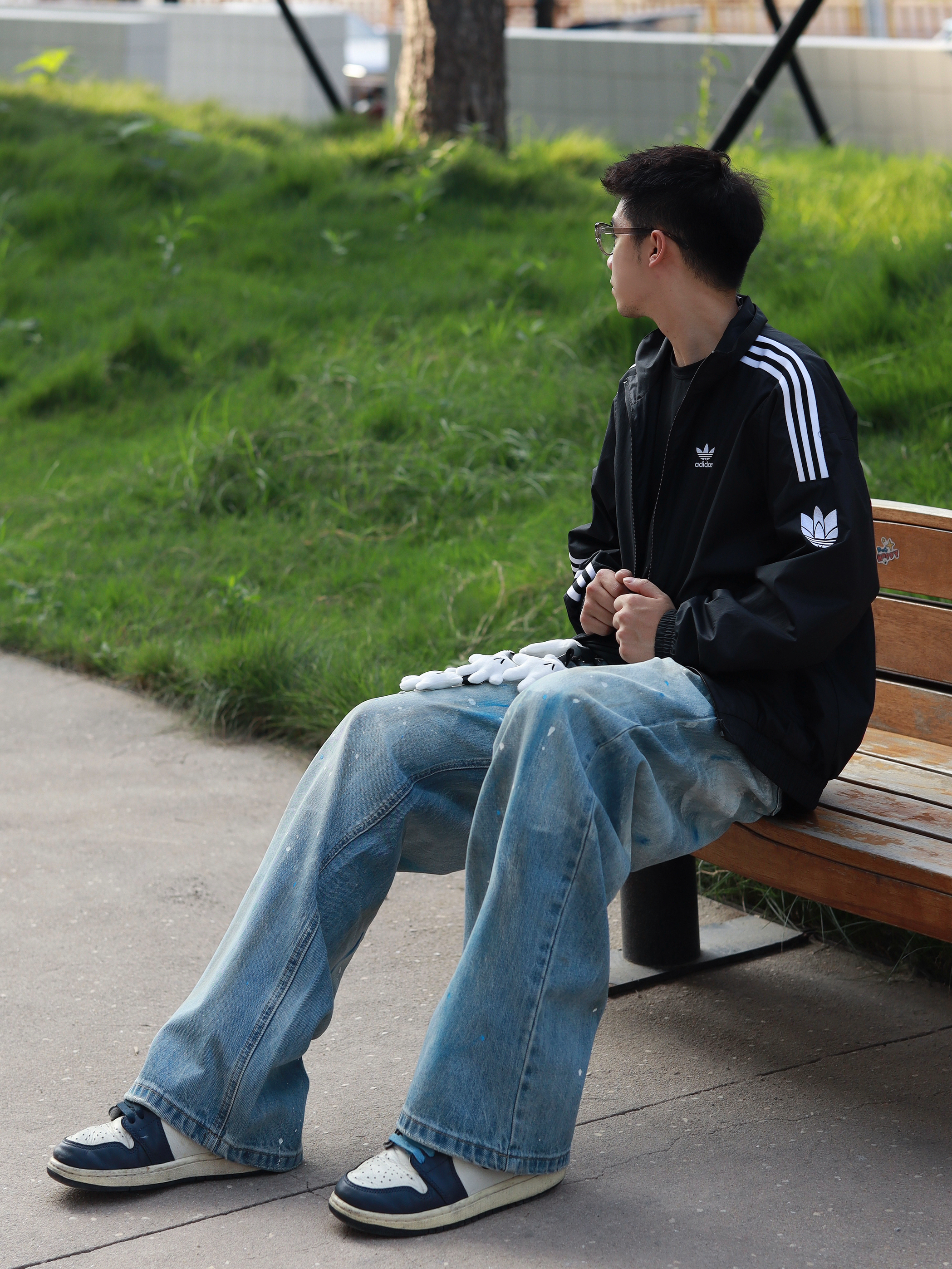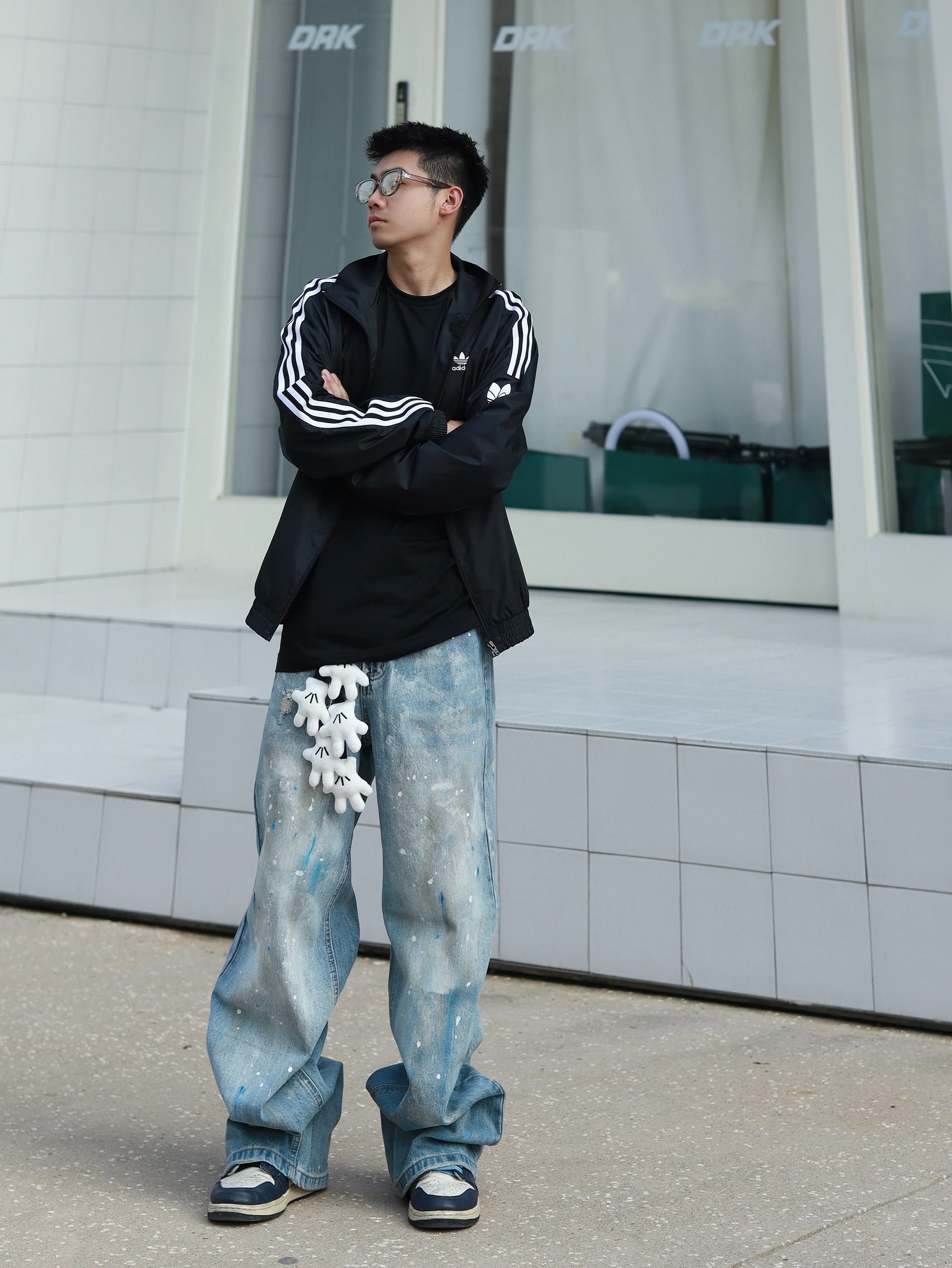 🗣️不会还有朋友没入秋吧 还是说入秋不知道怎么穿? 今天呢 是我一套个人的入秋穿搭公式 黑色三条杆外套搭配同色系内搭 下身牛仔裤👖 水洗复古款加上泼墨的设计我还挺喜欢的 宽松的版型挺修饰腿型,还有种慵懒的感觉 搭配了一个手套挂件~还挺吸睛的