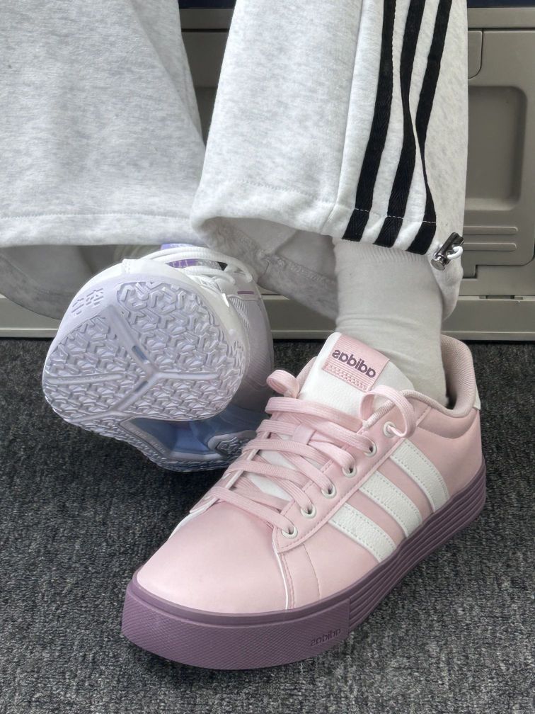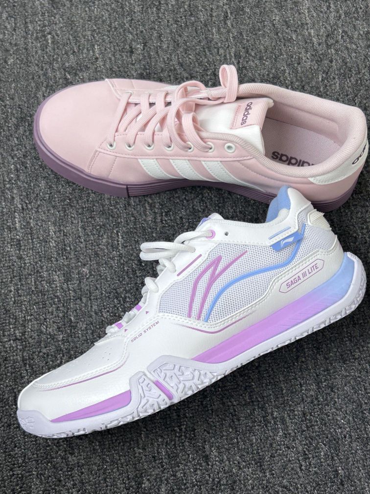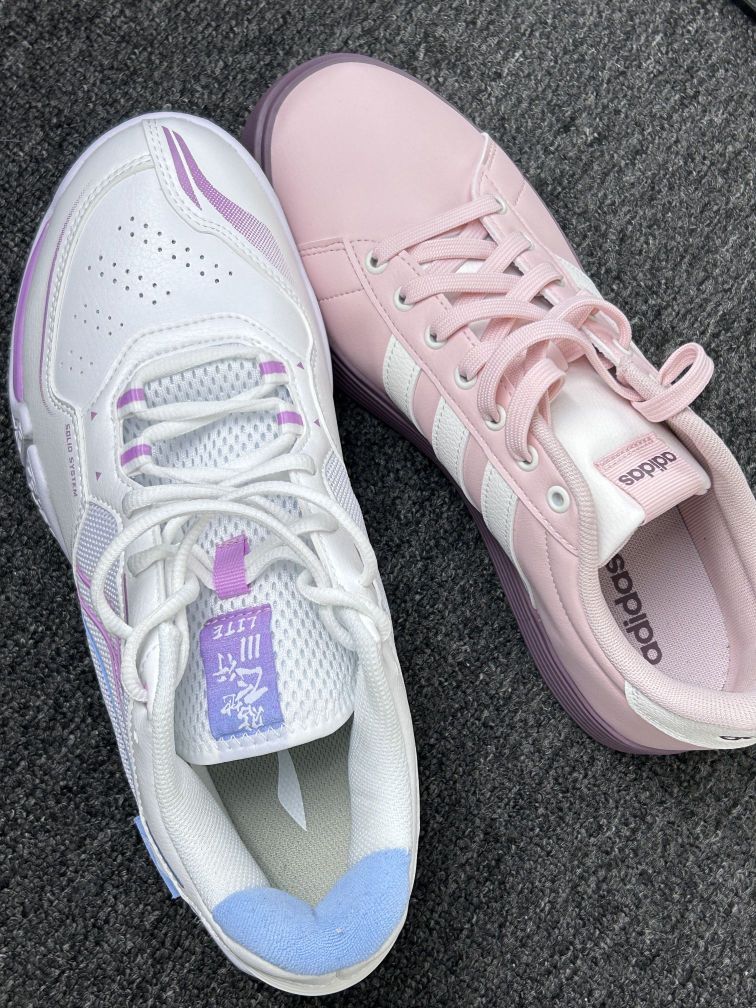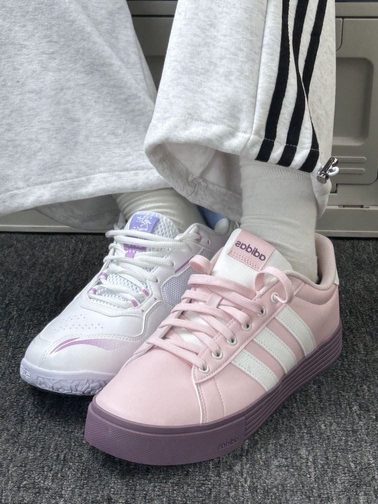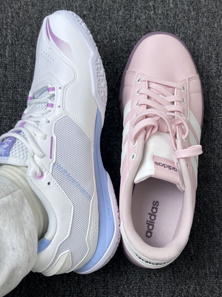 秋天穿这双“左右拼”,左脚李宁右脚阿迪,对比还挺明显的🍂。 李宁这边鞋面是网眼+皮面拼接,透气会比全皮的阿迪那只好点,早上赶地铁走快了,左脚没闷汗,右脚稍有点潮。鞋型上李宁偏窄,我正常脚穿久了脚趾有点挤,阿迪那只鞋头宽松些,但鞋底软度不如李宁,走石板路时右脚震感更明显。 颜色刚好贴秋——浅紫白配浅粉,搭焦糖色卫衣出门,落叶堆旁拍照不突兀。但缺点也直白:李宁鞋舌标穿了一周有点起边,阿迪鞋边容...