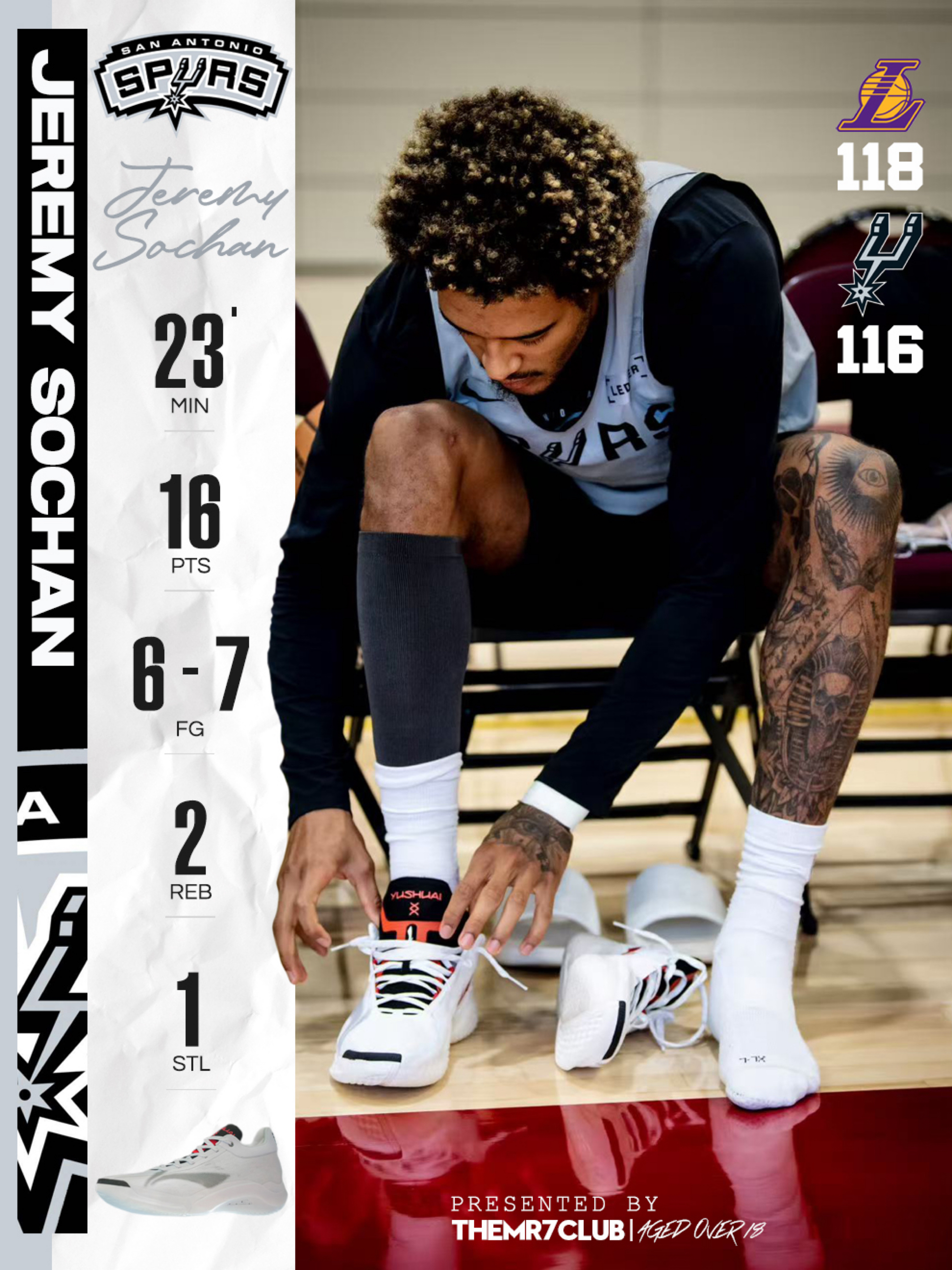马刺湖人这比赛本来想着湖人比输的,万万没想到打到最后这么刺激,尤其斯玛特最后时刻还给加个磅😂索汉出场23分钟,投篮7中6,拿到16分2篮板1抢断的数据。 帅小伙脚上还没有公开发布的驭帅20格外抢眼,之前只看到杨瀚森穿过的红色,这难道是要签了?