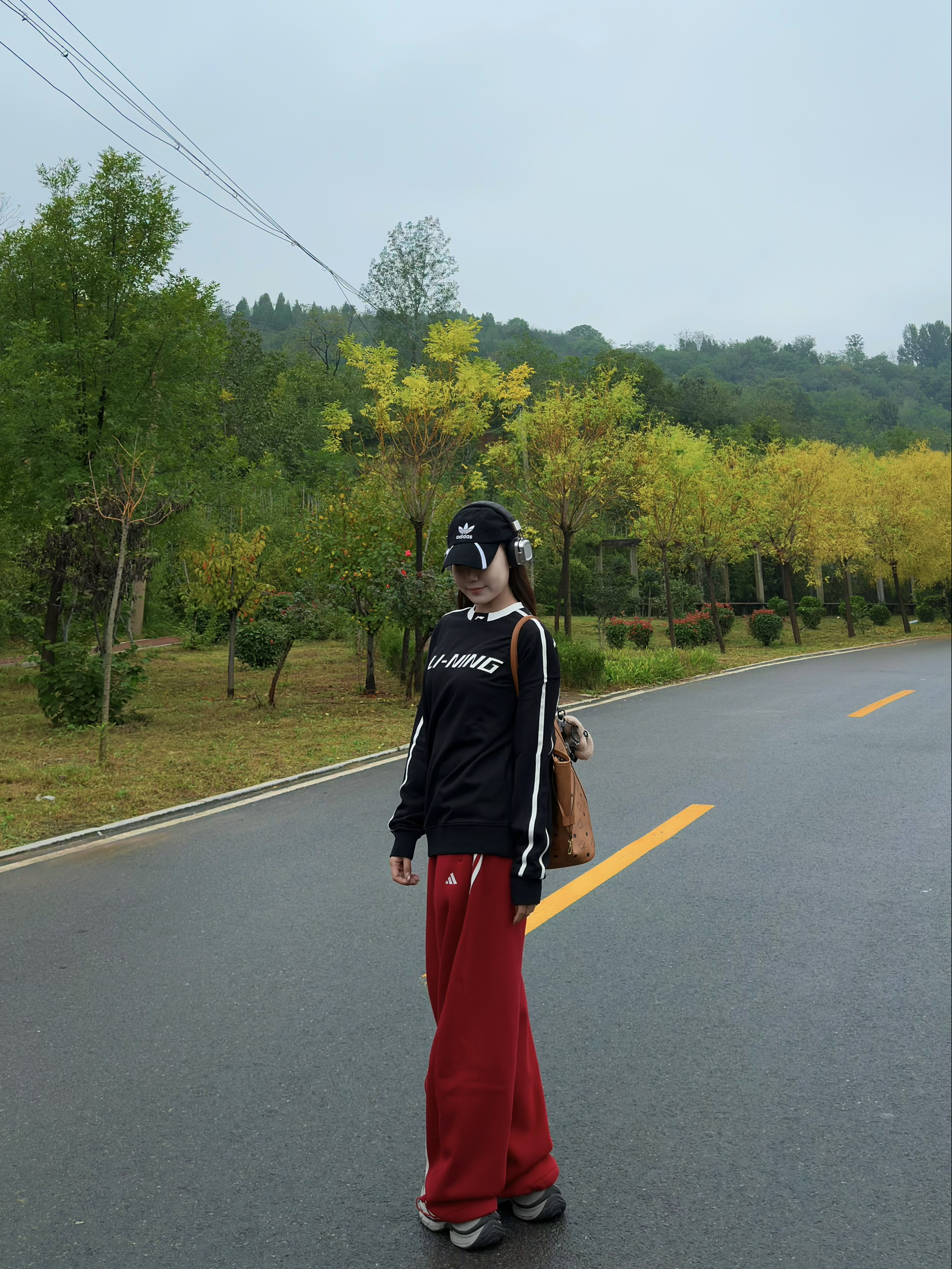 黑色卫衣,简约又有辨识度,宽松版型藏肉又舒服,秋日穿太戳我啦~ 搭配红色条纹运动裤,活力感直接拉满🌬️ 黑帽一戴,棕色老花包一挎,运动鞋一踩,松弛感瞬间到位💨 这种舒服又吸睛的穿搭,秋游、出街都超适配!