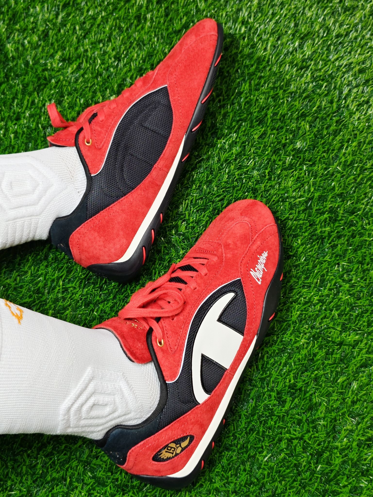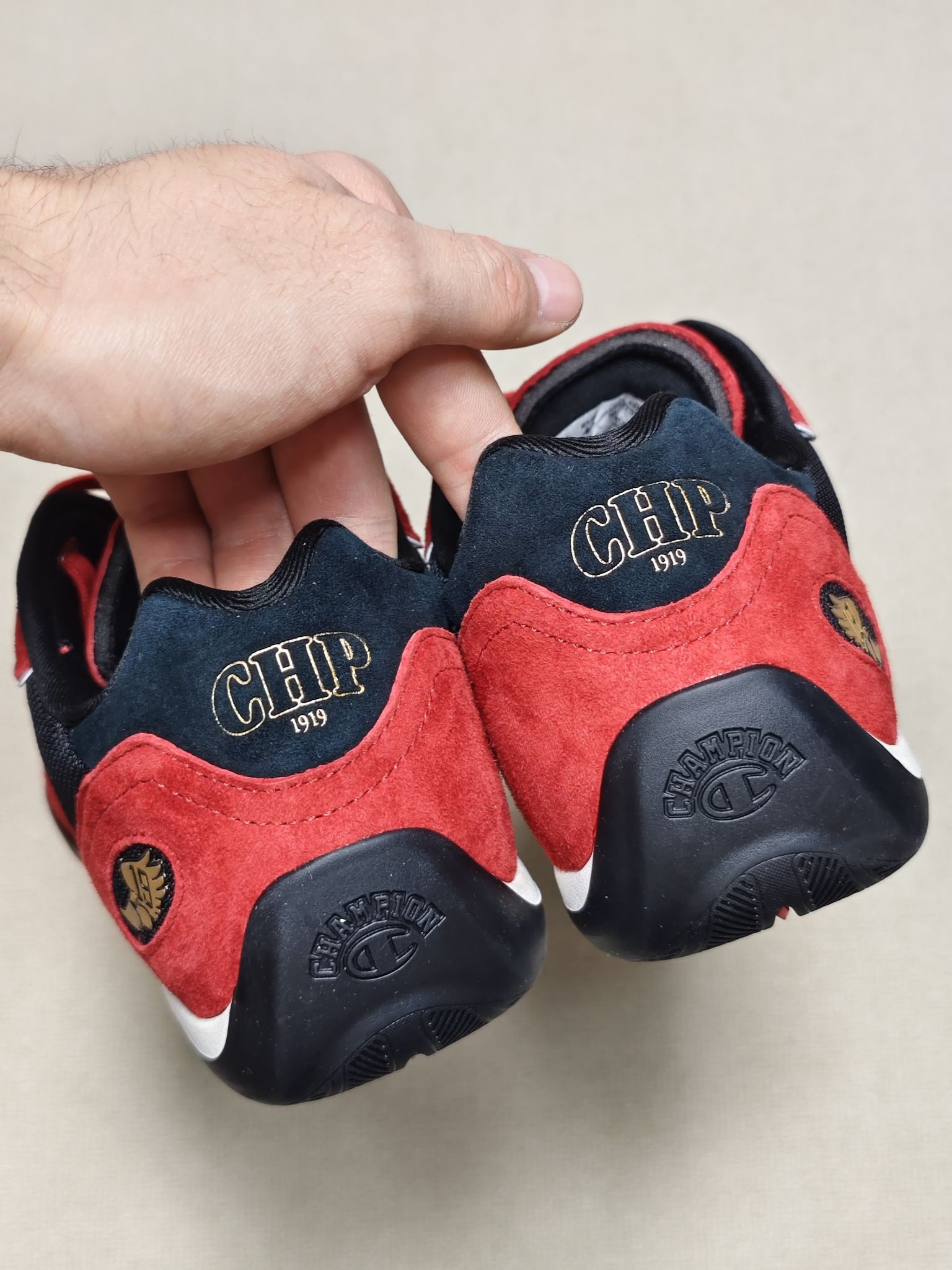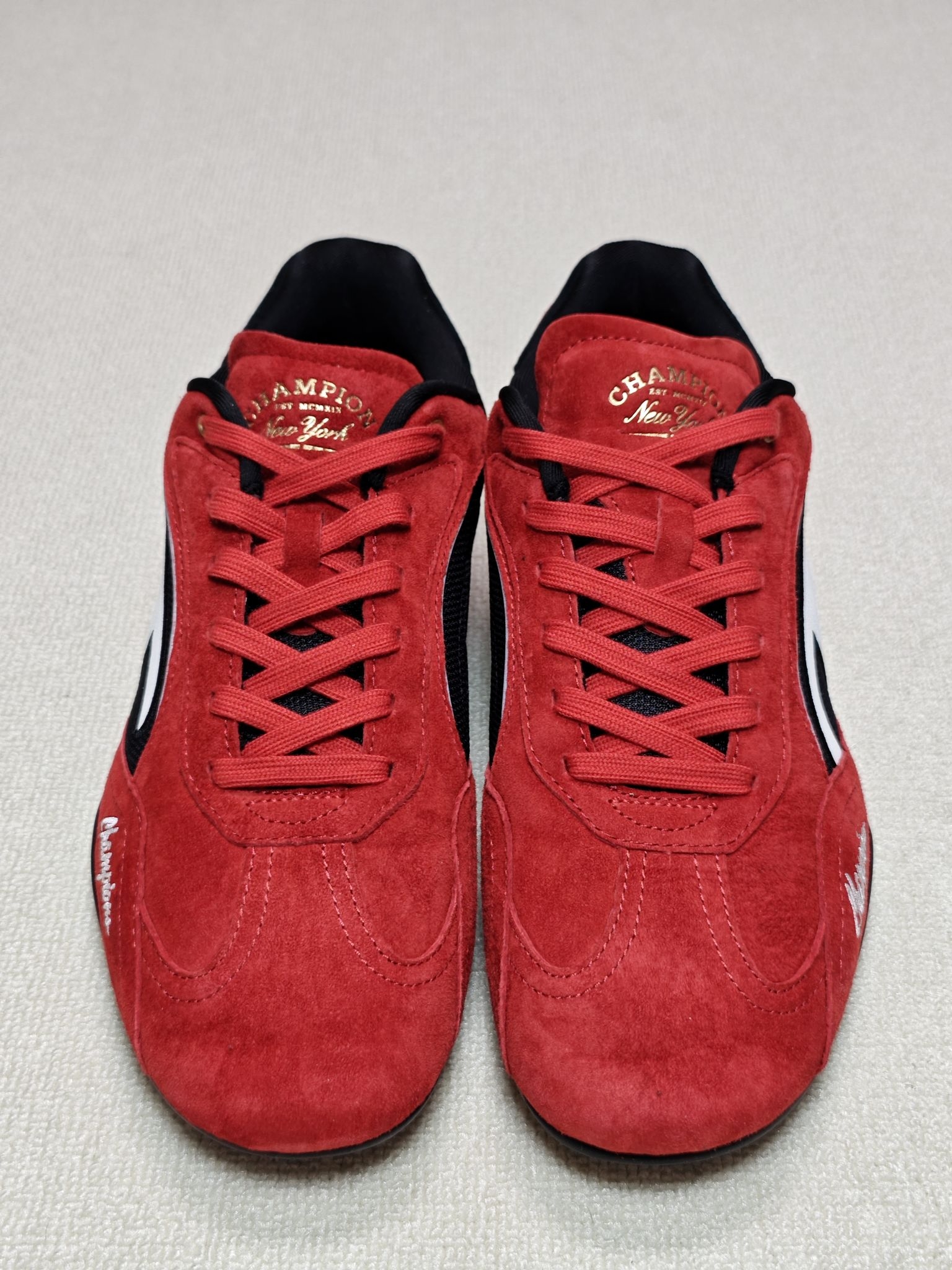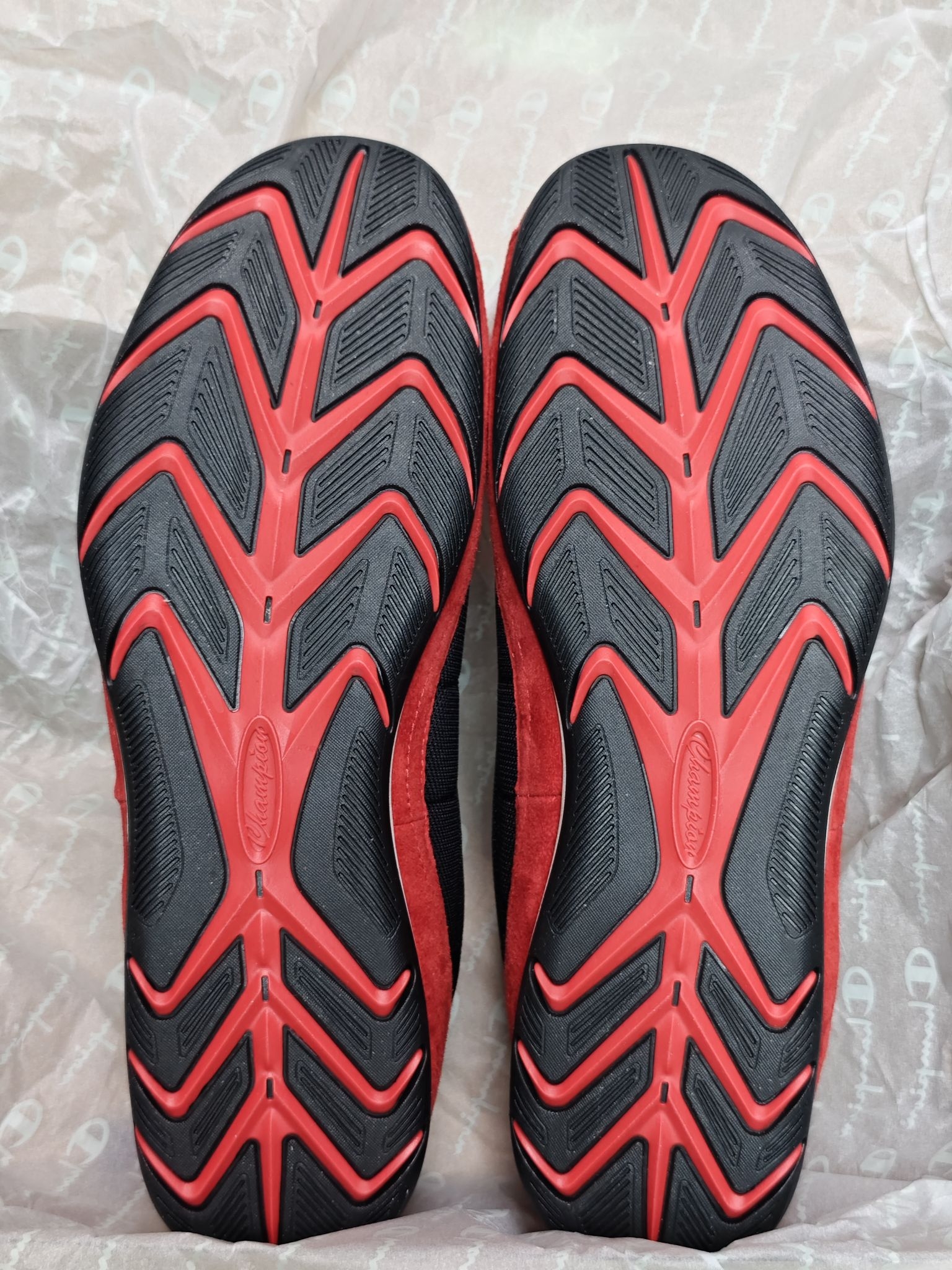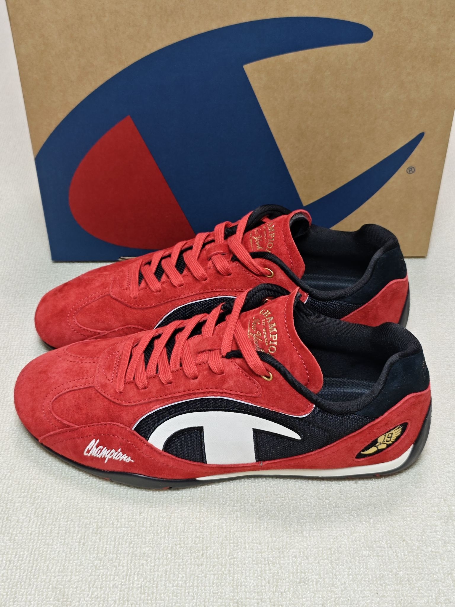 这双Champion赛车鞋鞋面采用翻毛皮+合成革的拼接设计,深红色部分是翻毛皮,白色的Champion Logo是合成革材质,翻毛皮刷色感还是不错的😎 上脚第一感受鞋子重量很轻,脚掌与鞋垫的贴合度很好,脚感偏韧弹,上脚复古风满满 鞋底采用仿生结构橡胶材质大底,在水泥地抓地很好,这双鞋尺码偏大,建议选小半码到一码 需要注意的是鞋面的深红色翻毛皮沾水容易掉色🤔