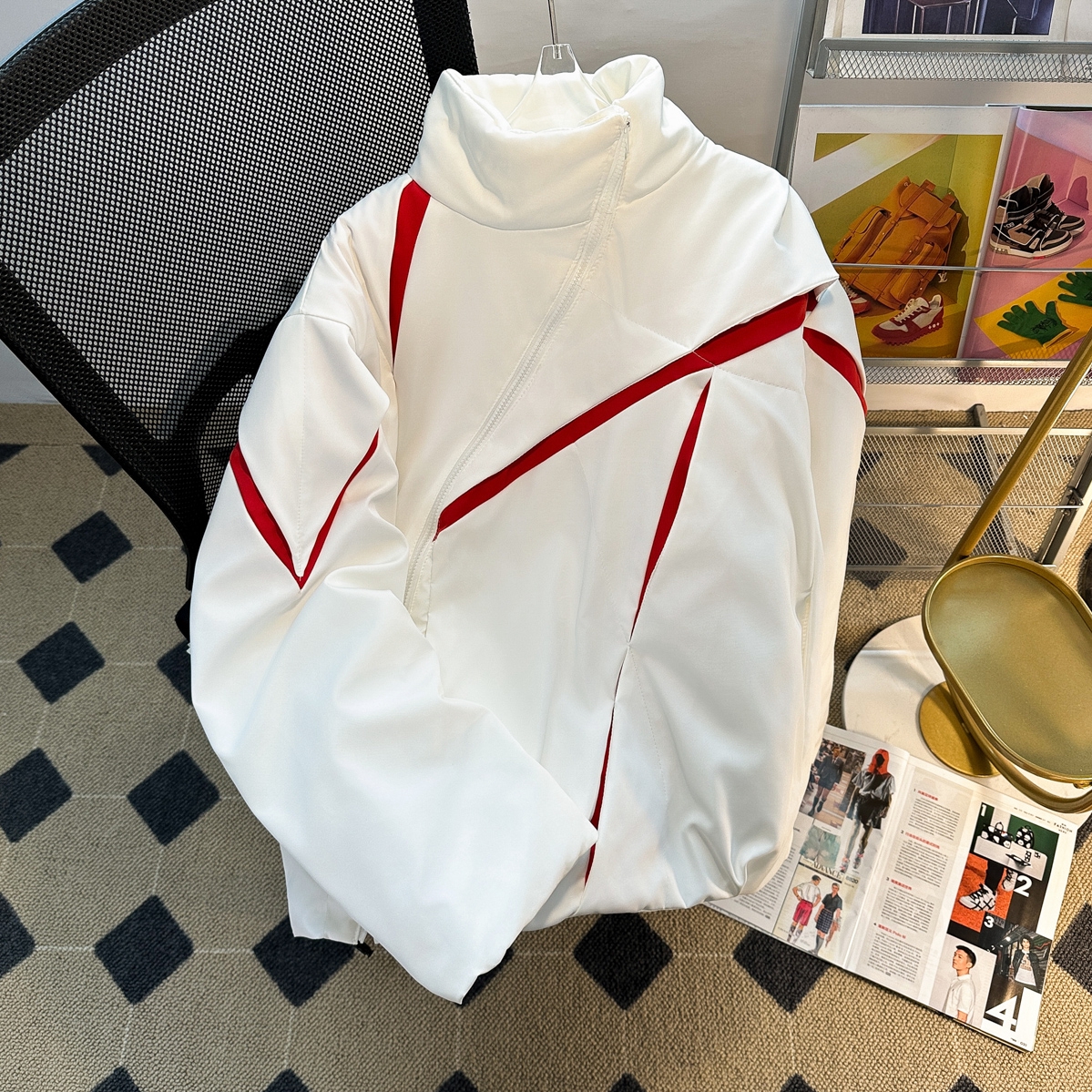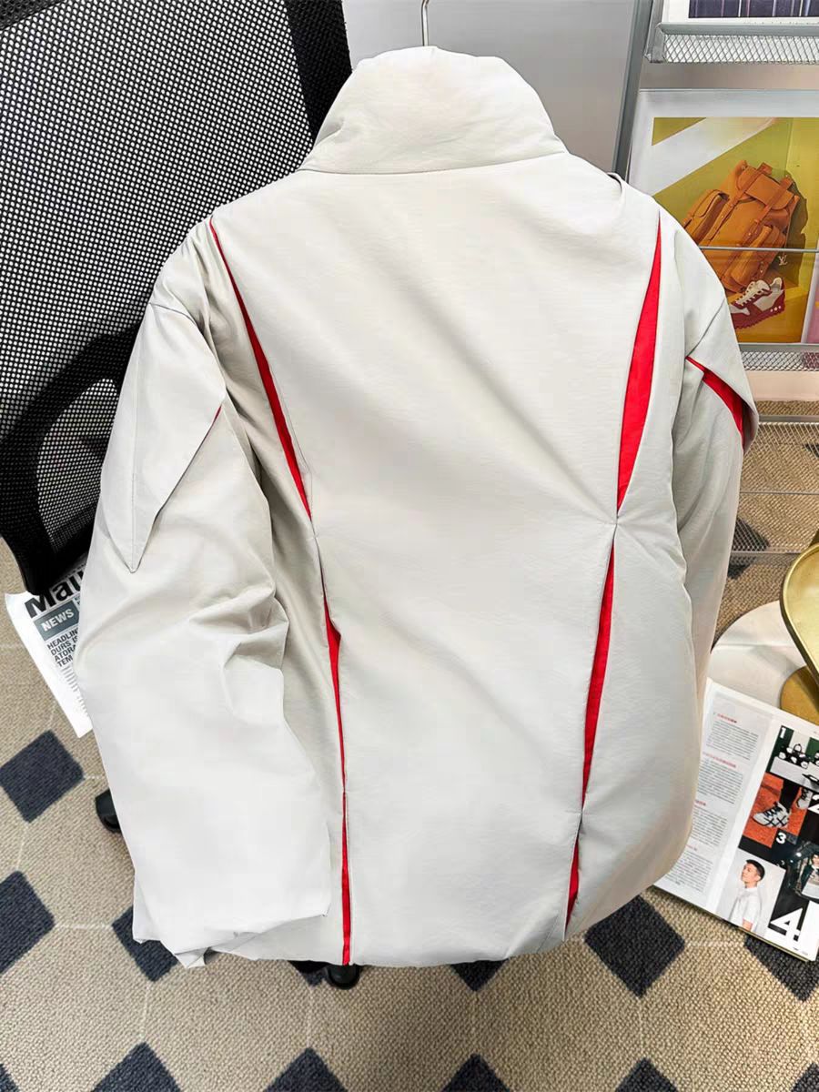 这件浅灰撞红线条的立领棉服,绝对是冬日潮人必备!斜拉链+几何红边设计,打破沉闷超有未来感,蓬松版型保暖又藏肉。日常出街或通勤穿,轻松拿捏简约高级的氛围感,谁穿谁是行走的时髦模板~