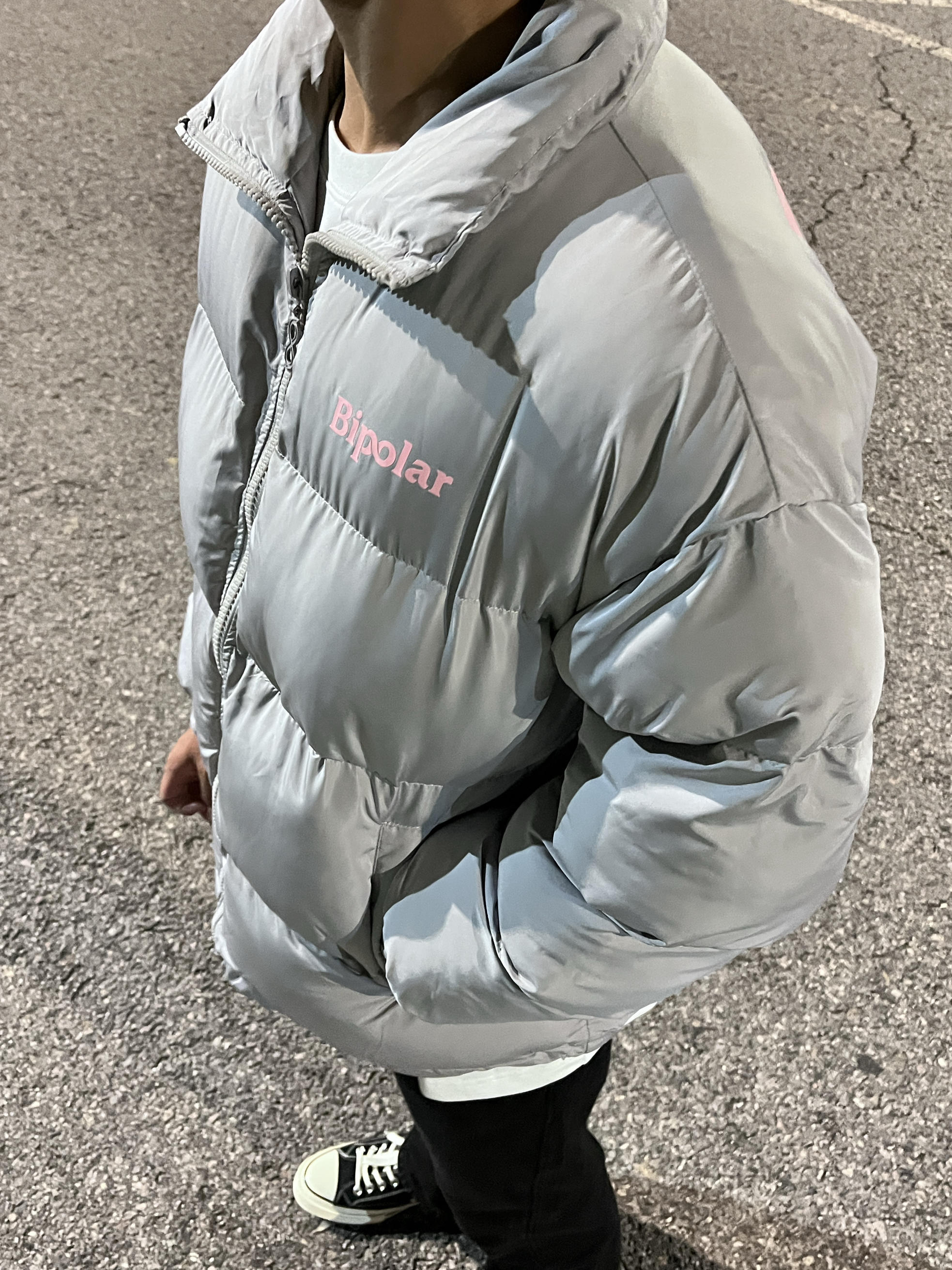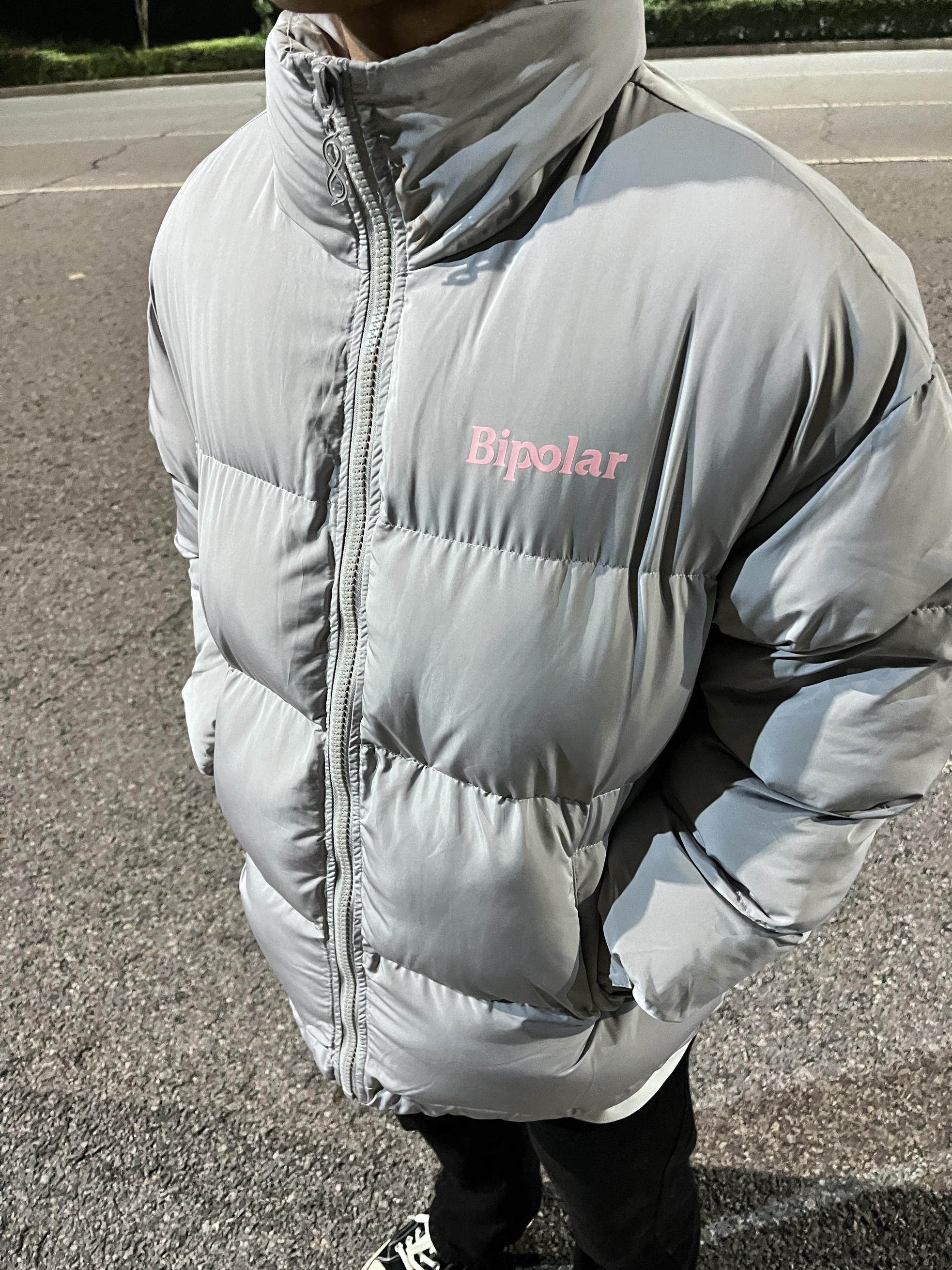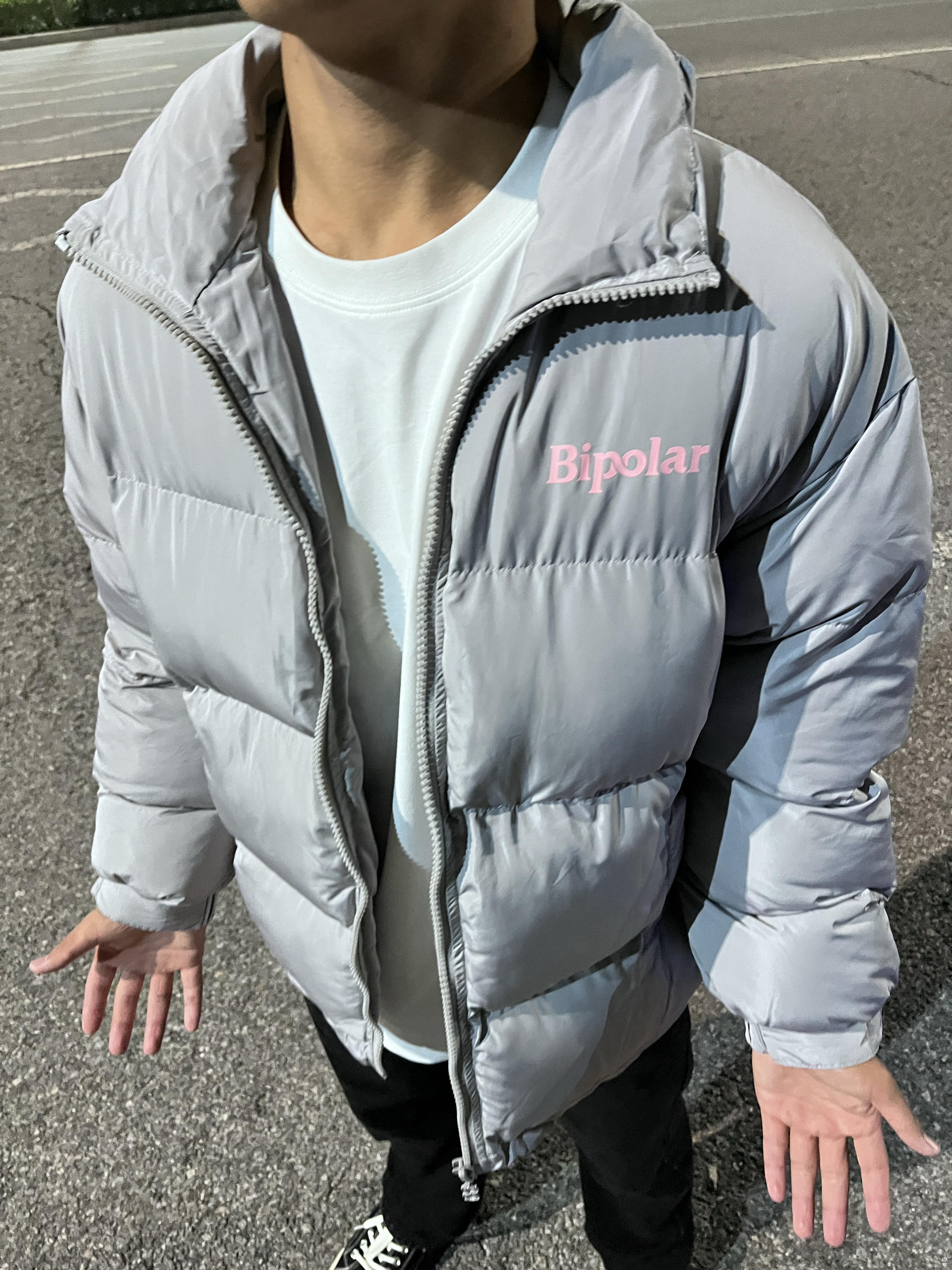 在棉服里浅灰色可以说是很小众啦 北方里面可以再叠穿一件白色卫衣 很有少年感 下半身搭配了黑色拉链牛仔裤 不规则拉链酷酷的很有设计感 版型也很nice 没错 BIPOLAR 家这款棉服深得我心! 衣服整体是浅灰色与粉色字母Logo印花搭配 这么高级的颜色首次尝试小众的基础上 更增添了几分时尚 身短袖长的设计多了几分大气 喜欢中性的女孩子不用犹豫就可冲冲 @识货穿搭君