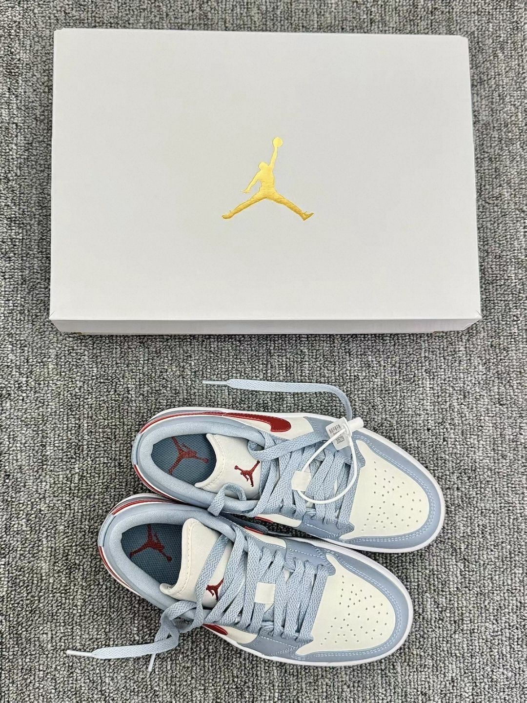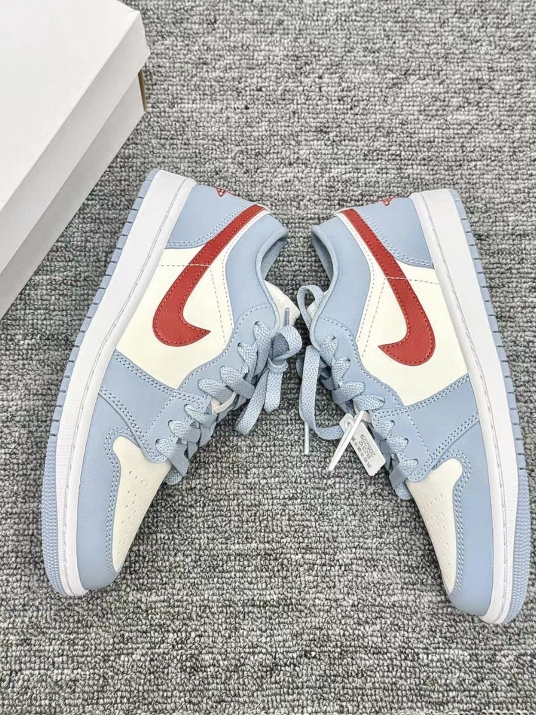 “谁懂啊!这双AJ1 Low的蓝白红配色直接戳中春日松弛感💙 淡奶蓝+米白打底,再用复古红勾边点缀,像把海盐和樱桃揉进了鞋里~ 低帮显脚踝细,皮质软乎乎的,搭牛仔裤/短裙都能一键出片! 踩一天街脚也不酸,日常通勤+周末出游玩全拿捏,这波颜值舒适度双在线✨”