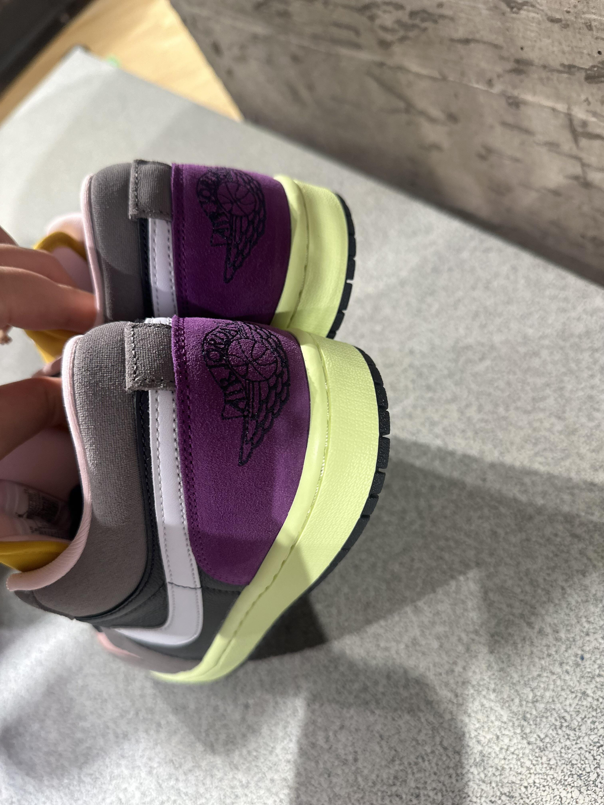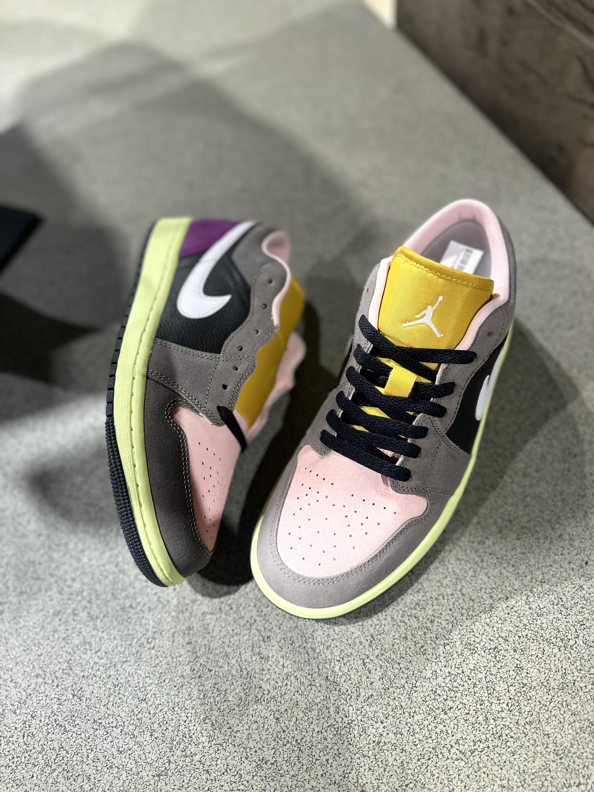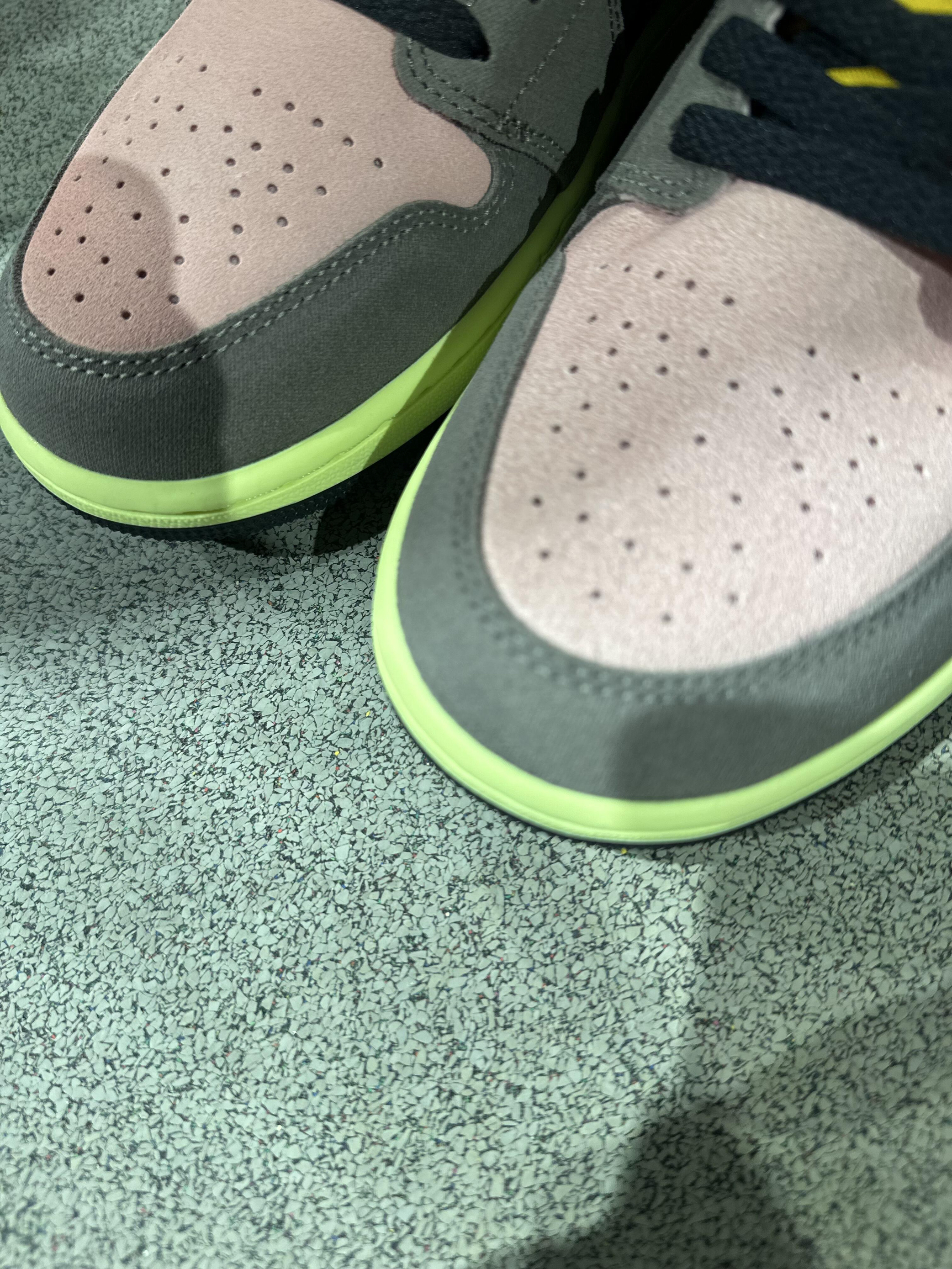 开箱看到这双鞋的瞬间直接被戳中——柔粉碰烟灰,再泼上一抹明黄+荧光绿底,像把打翻的马卡龙调色盘裹进了球鞋里,麂皮质感软乎乎的,是那种“穿去甜品店够甜,踩去潮牌店够酷”的双面款🍧 🔍 为啥能戳中“风格纠结党”?这几点太懂需求 • 「软到踩云的舒适感」:打破“AJ板鞋硬磨脚”的痛点!鞋身是细腻麂皮+透气孔拼接,摸起来软乎乎不硌脚,夏天穿也能透风;低帮版型裹脚不压踝,小粗腿穿也能显利落,暴走一下午都...