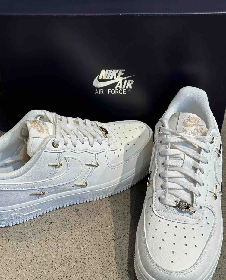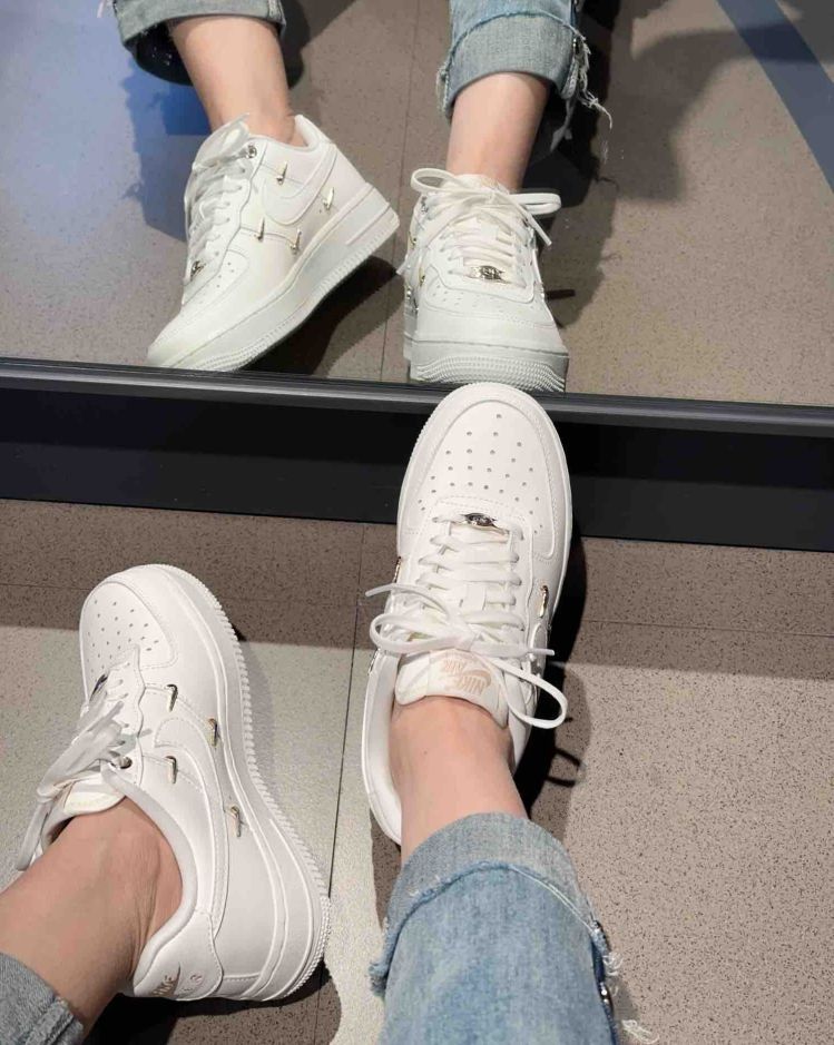 基础款AF1的纯白底色本来就干净百搭,加上这几个金色的金属小装饰,一下就从“普通小白鞋”变成了“有点小心机的精致款”——不夸张但又能让人注意到细节,配牛仔裤、裙子都好看,属于“低调里带点贵气”的类型,日常穿或者稍微正式点的场合都能hold住,颜值和实用性都在线~
