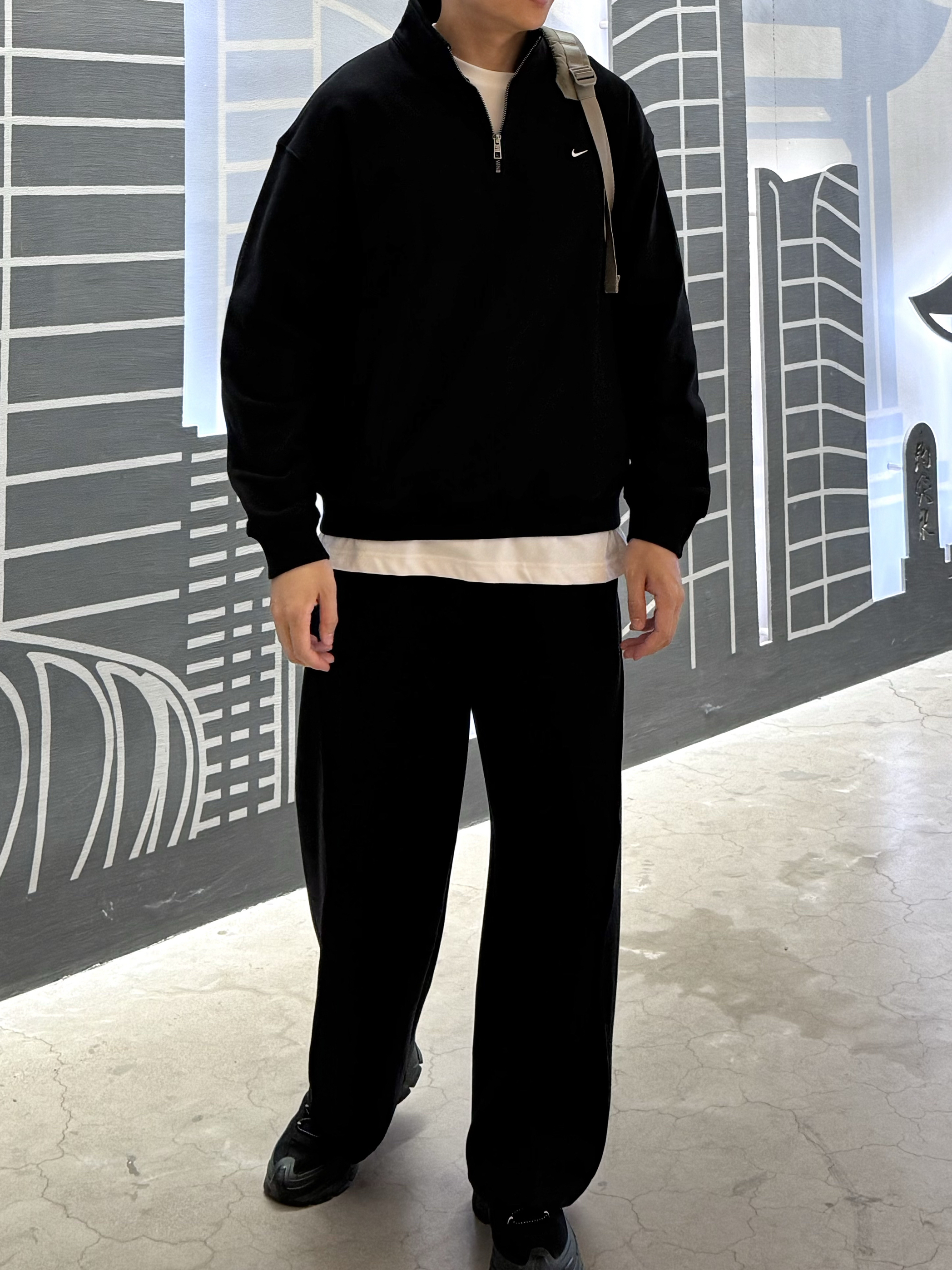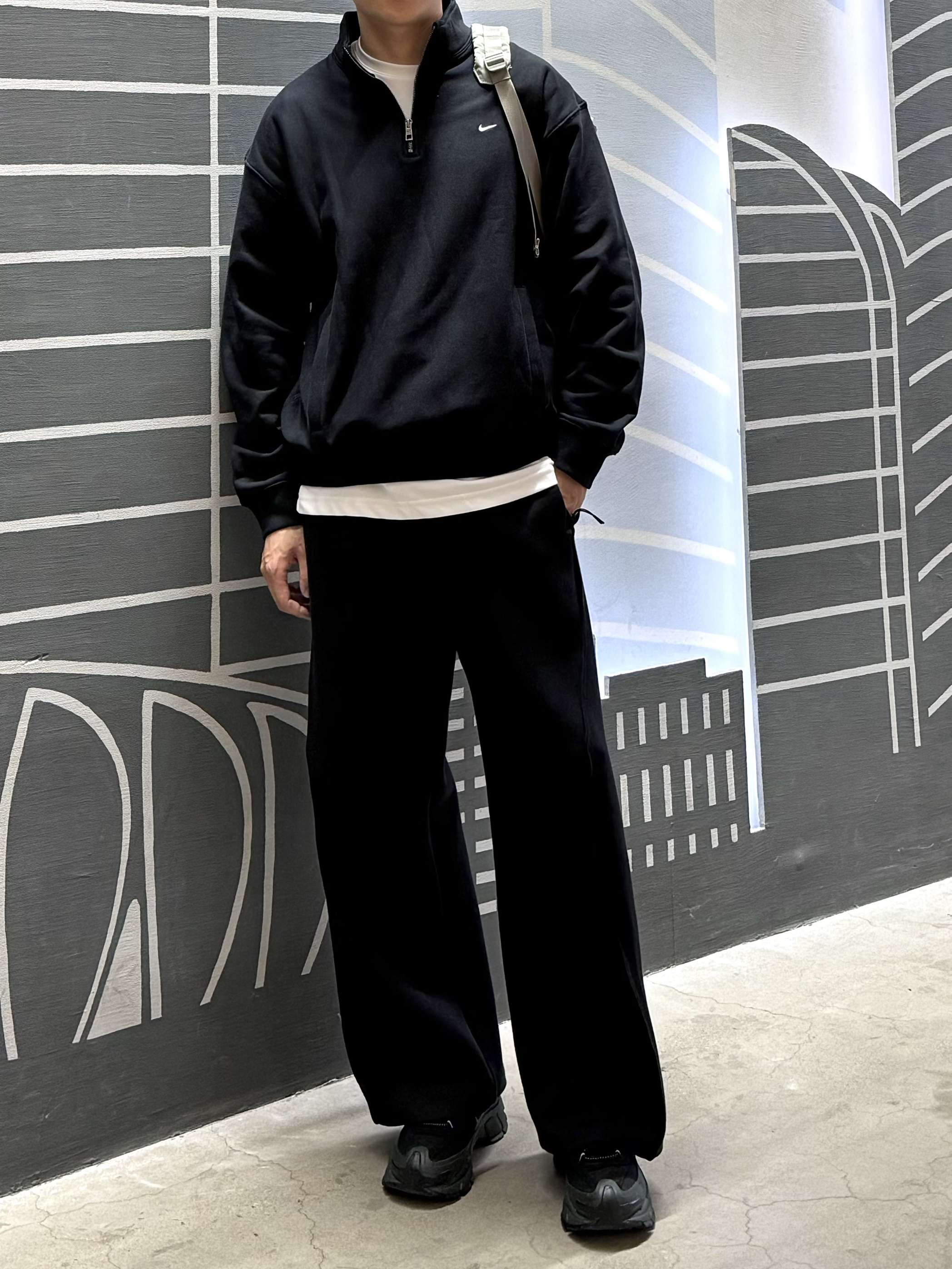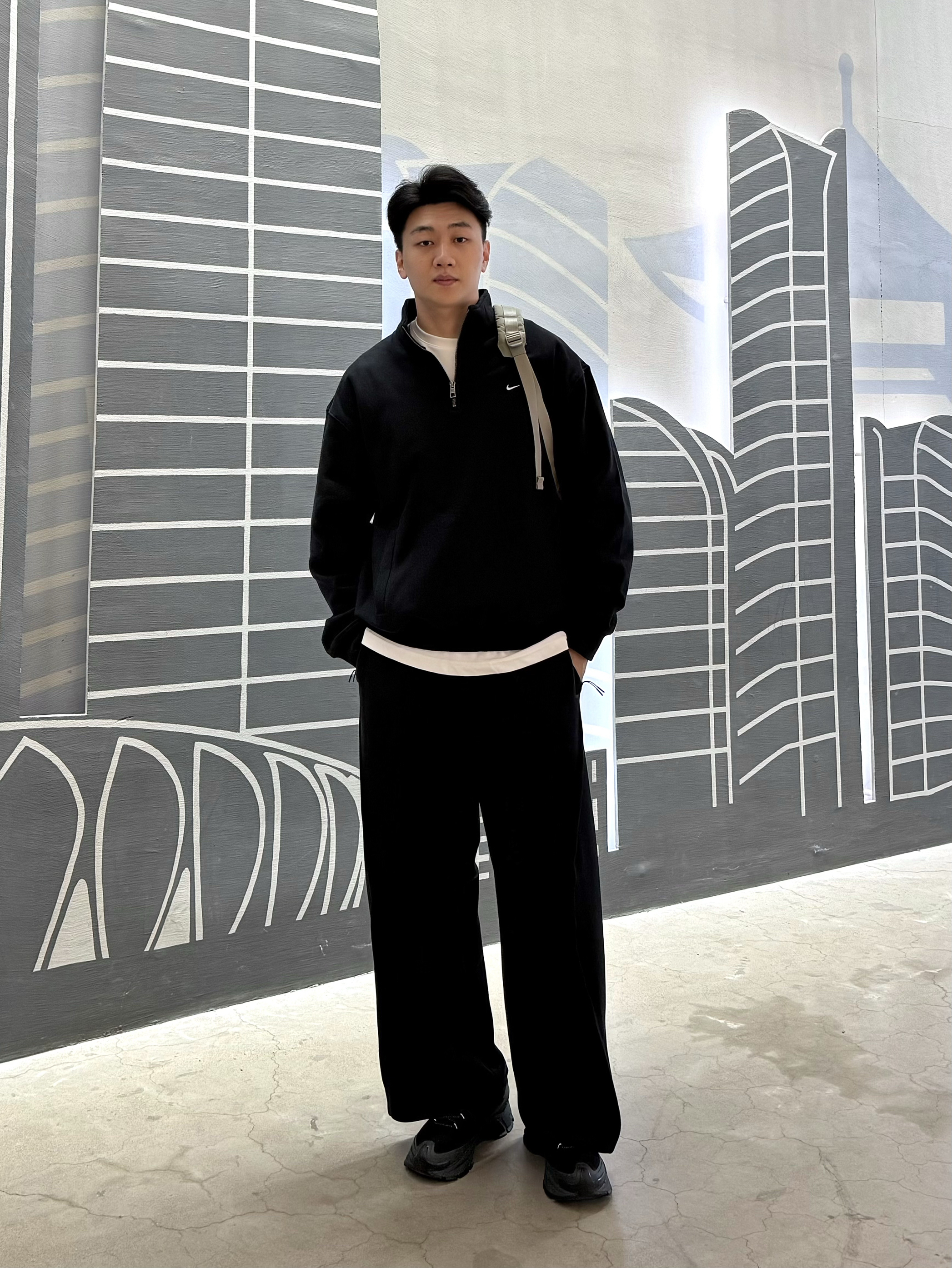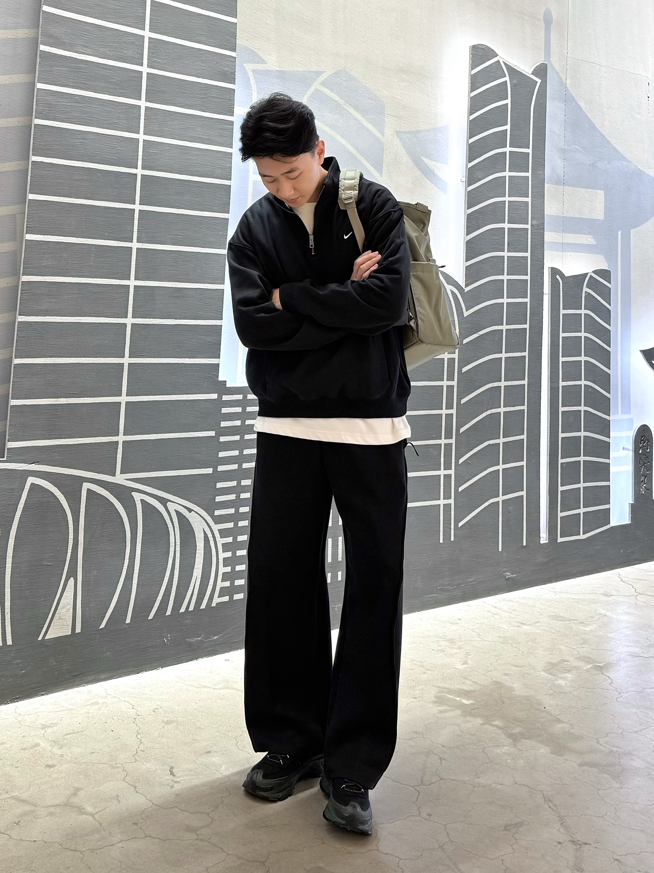 今天带你学习基础款卫衣的N种打开方式! 又入手了Nike半拉链秋冬卫衣,比较厚实的棉料搭配上内里绒毛,过冬这件完全OK!整体的感觉是比较宽松的~再搭配一条宽松阔腿裤,记得穿一双厚底鞋,这样层次感才更足!🖤