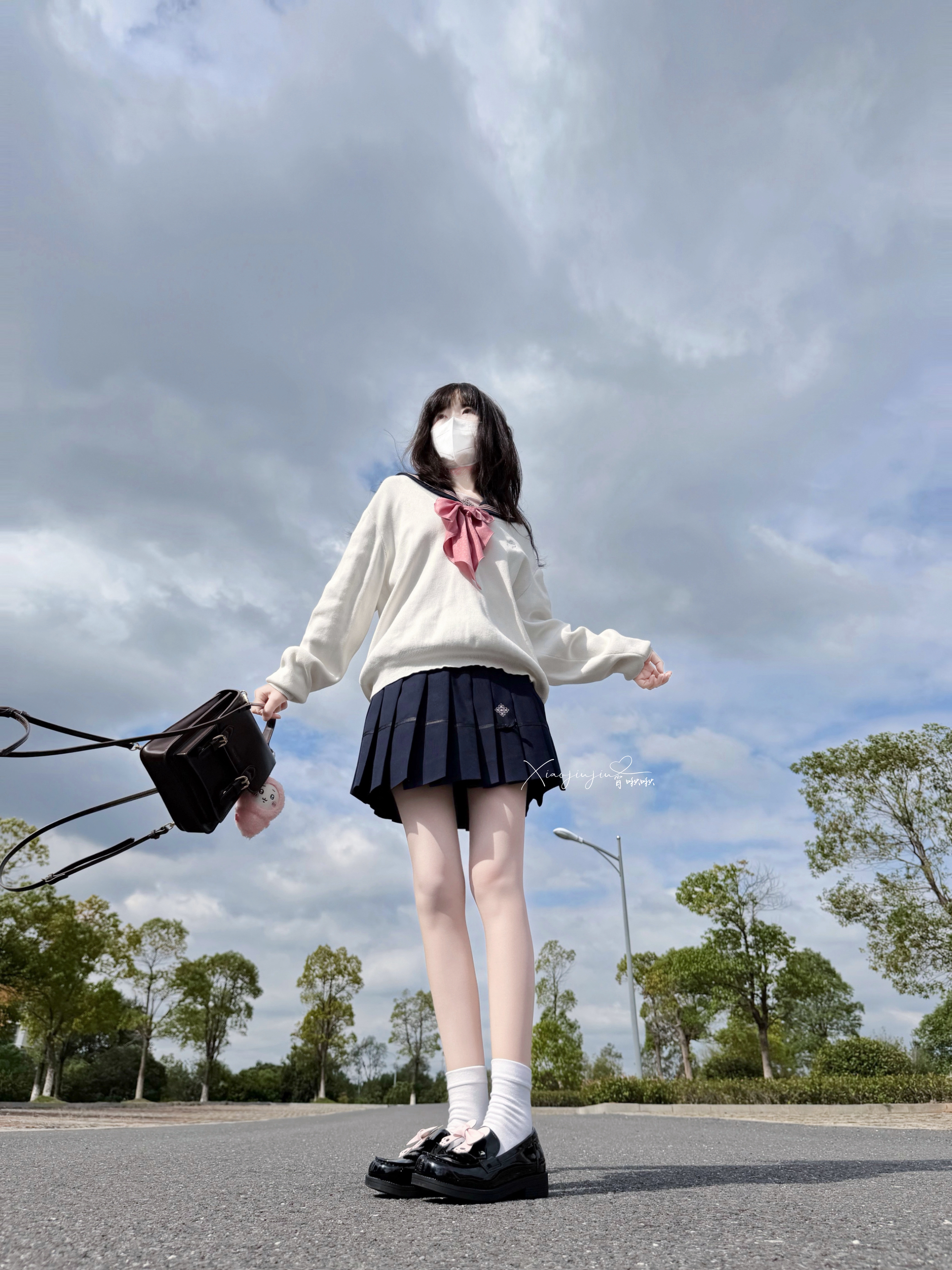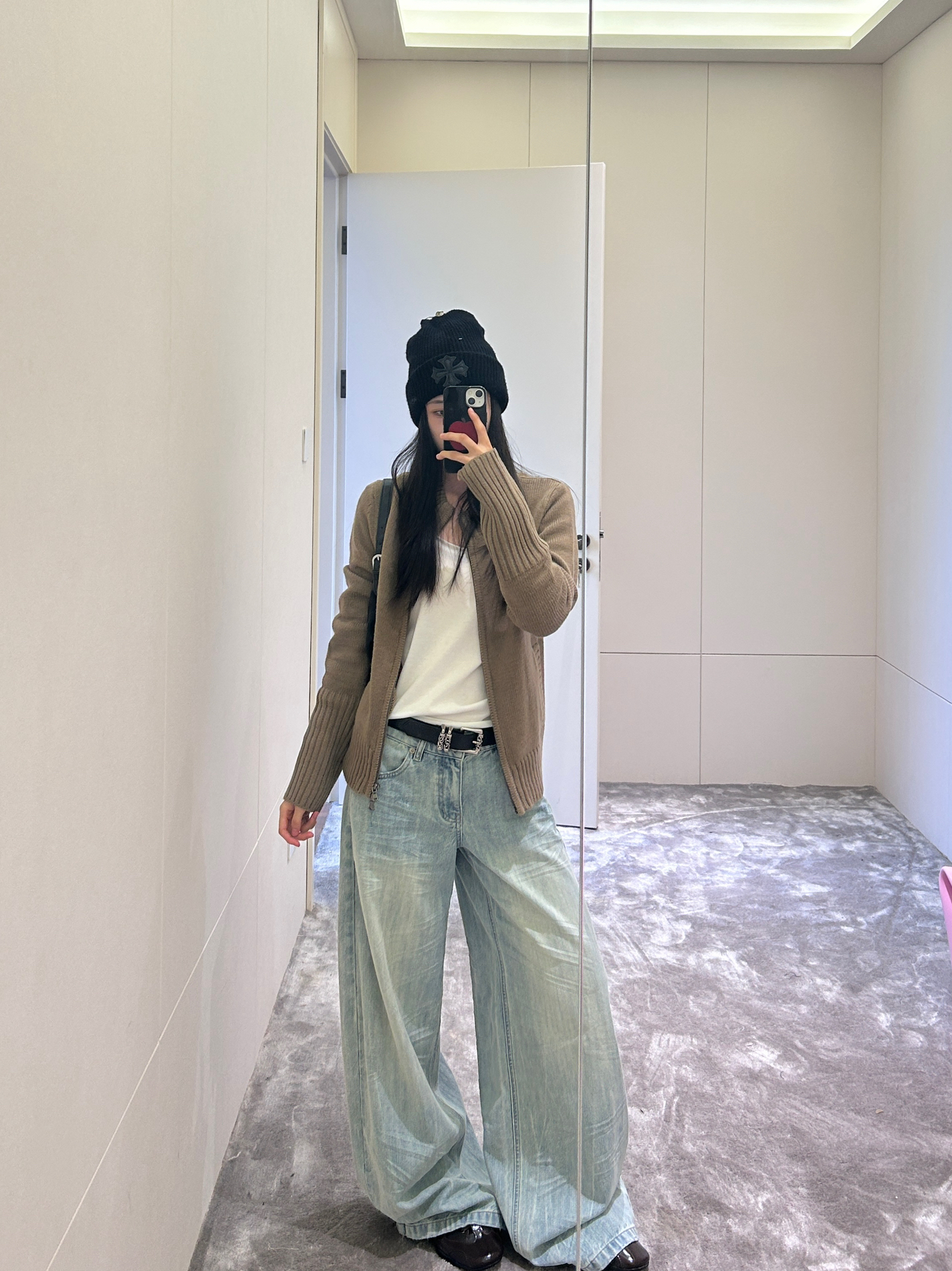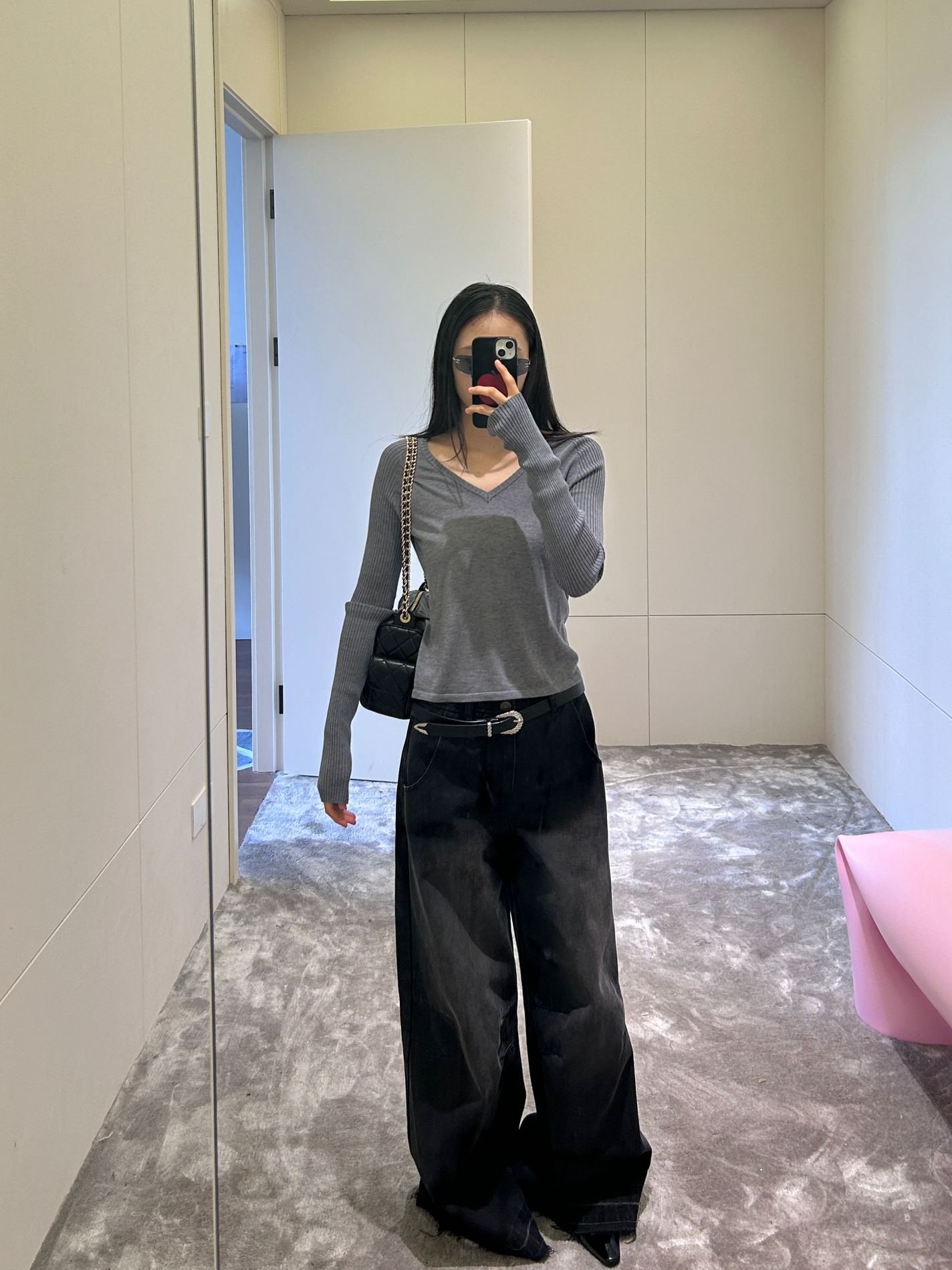 烟灰色V领针织衫裹满温柔,修身款刚好衬出纤细线条; 配渐变阔腿裤自带慵懒滤镜,金属扣皮带一掐,把“随性不垮”的比例焊得稳稳的~ 链条包+尖头鞋是细节里的精致,整套低调又耐看,属于日常不出错的质感穿搭~
