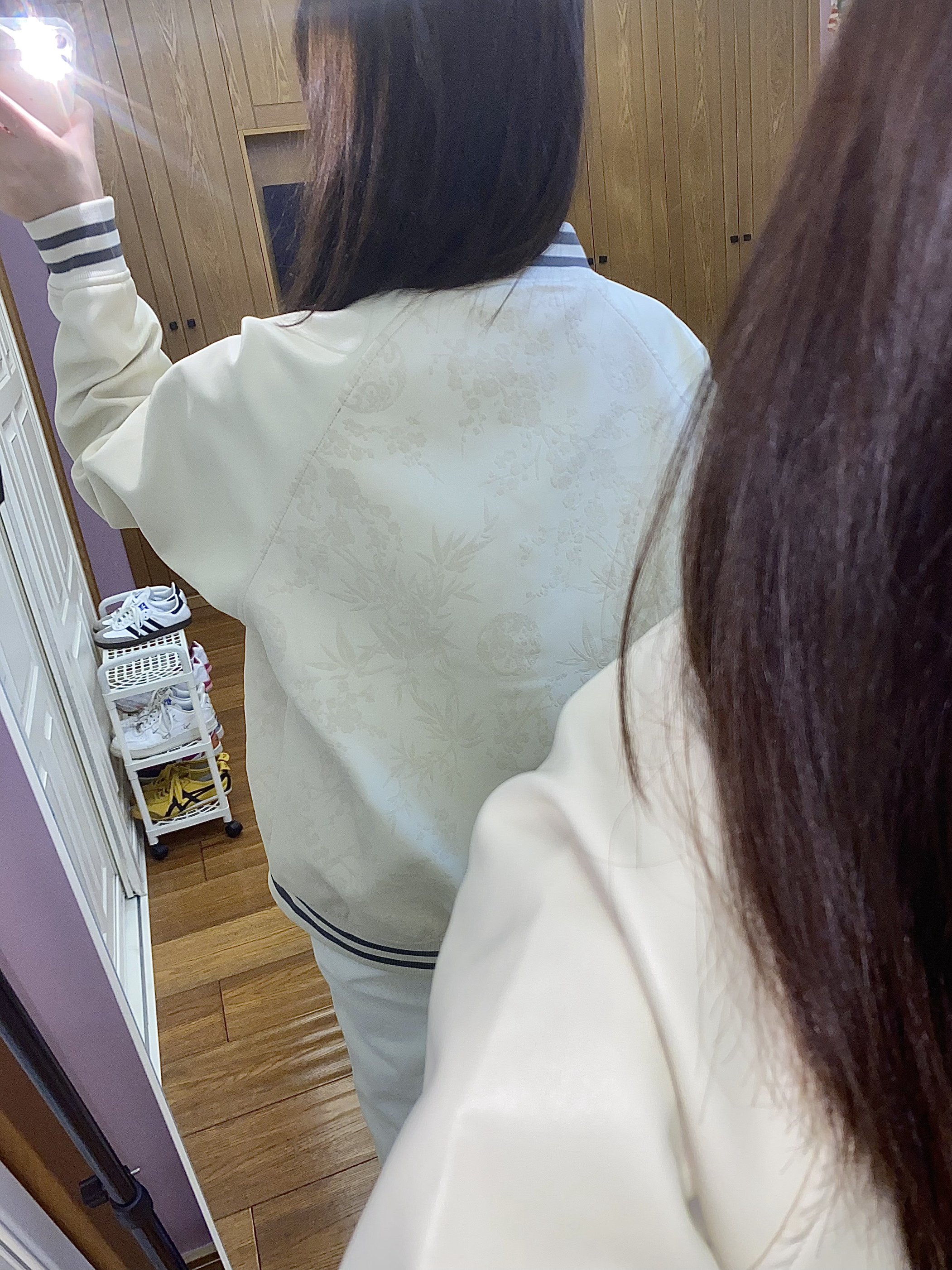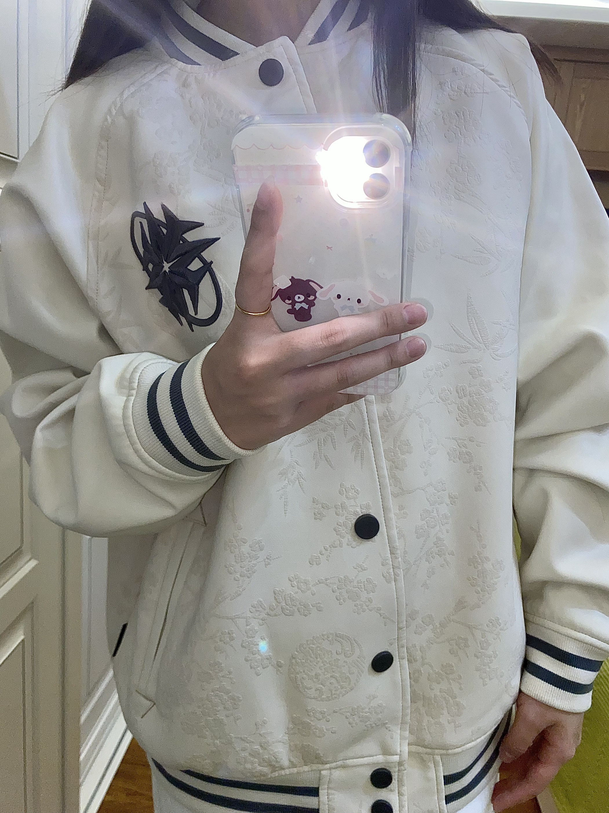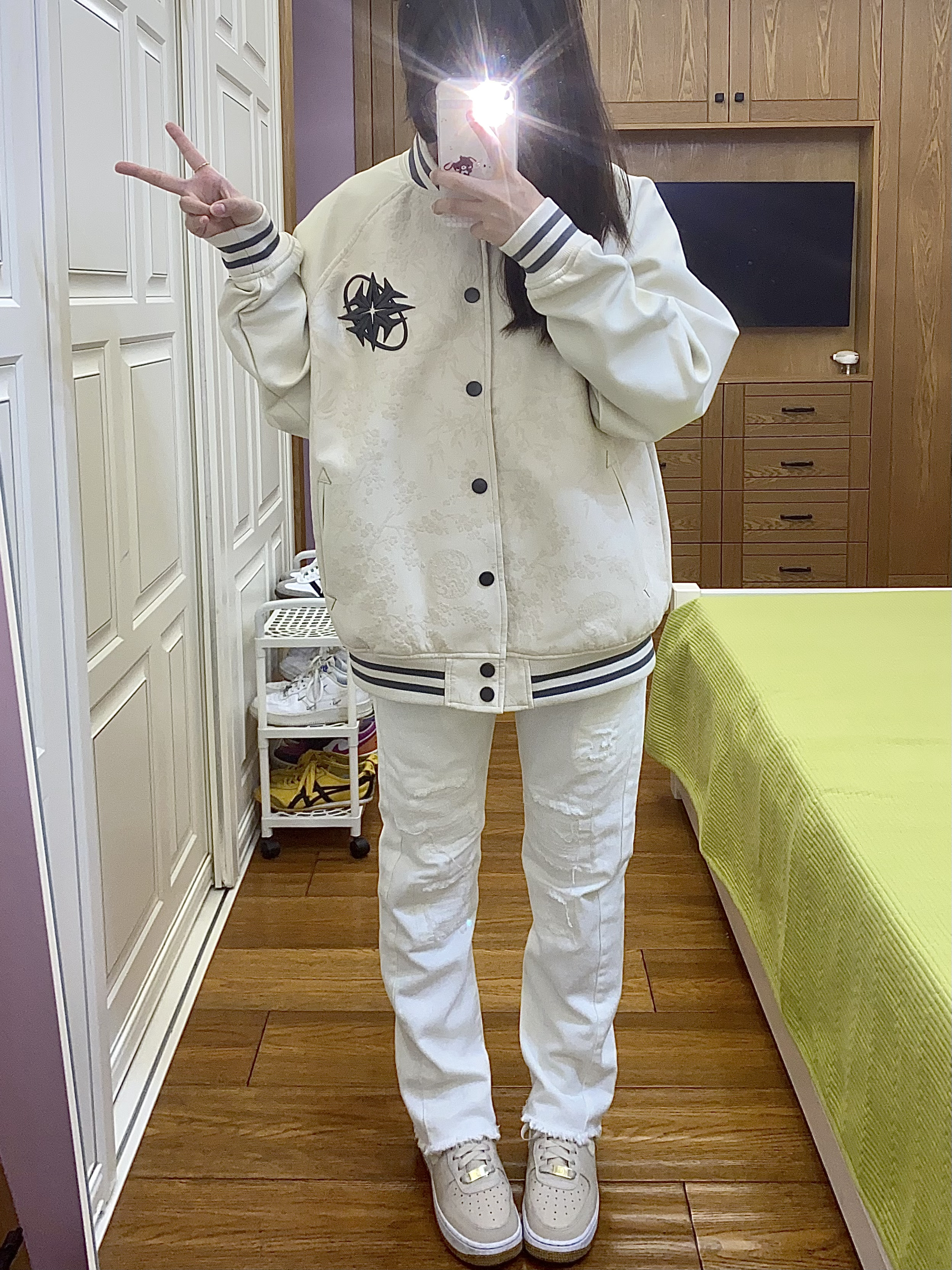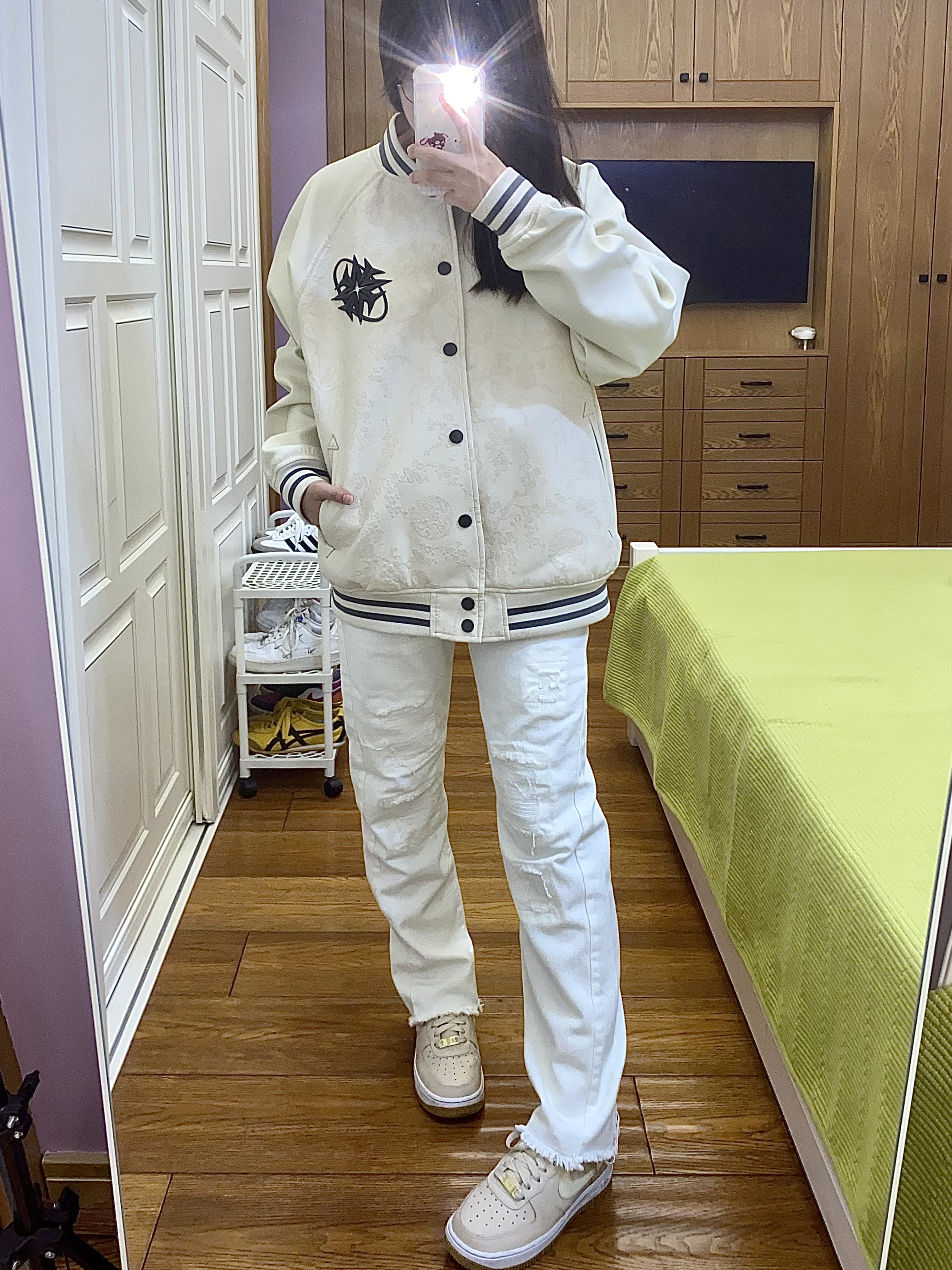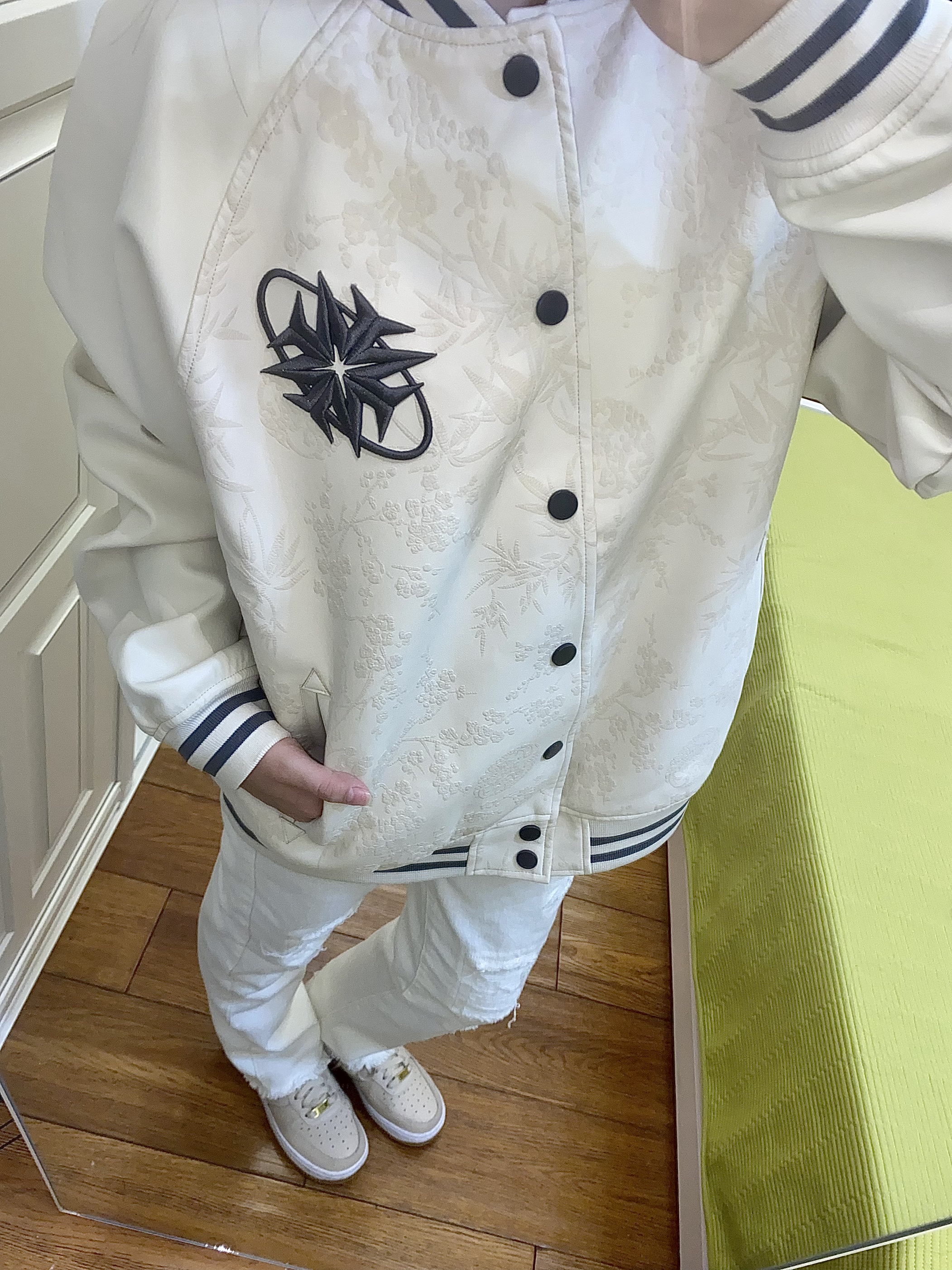这件棒球服真的很重工! 整体的皮质浮雕设计非常高级时尚 而且皮质的很耐脏呢~ 前后都有花卉图案装饰 前面是一个排扣也很方便穿脱 我搭配了一条白色系裤子和米色鞋子很适配呀