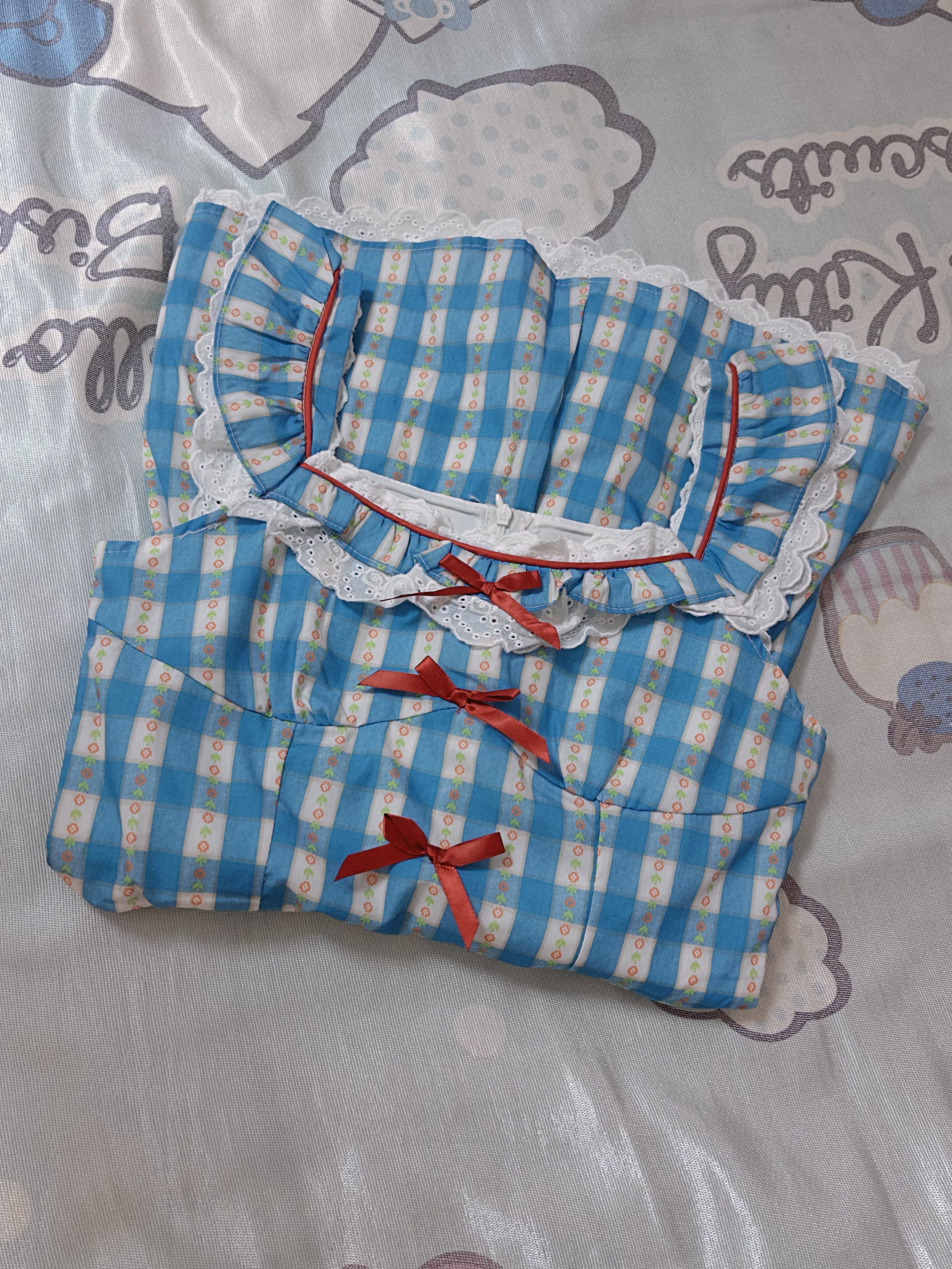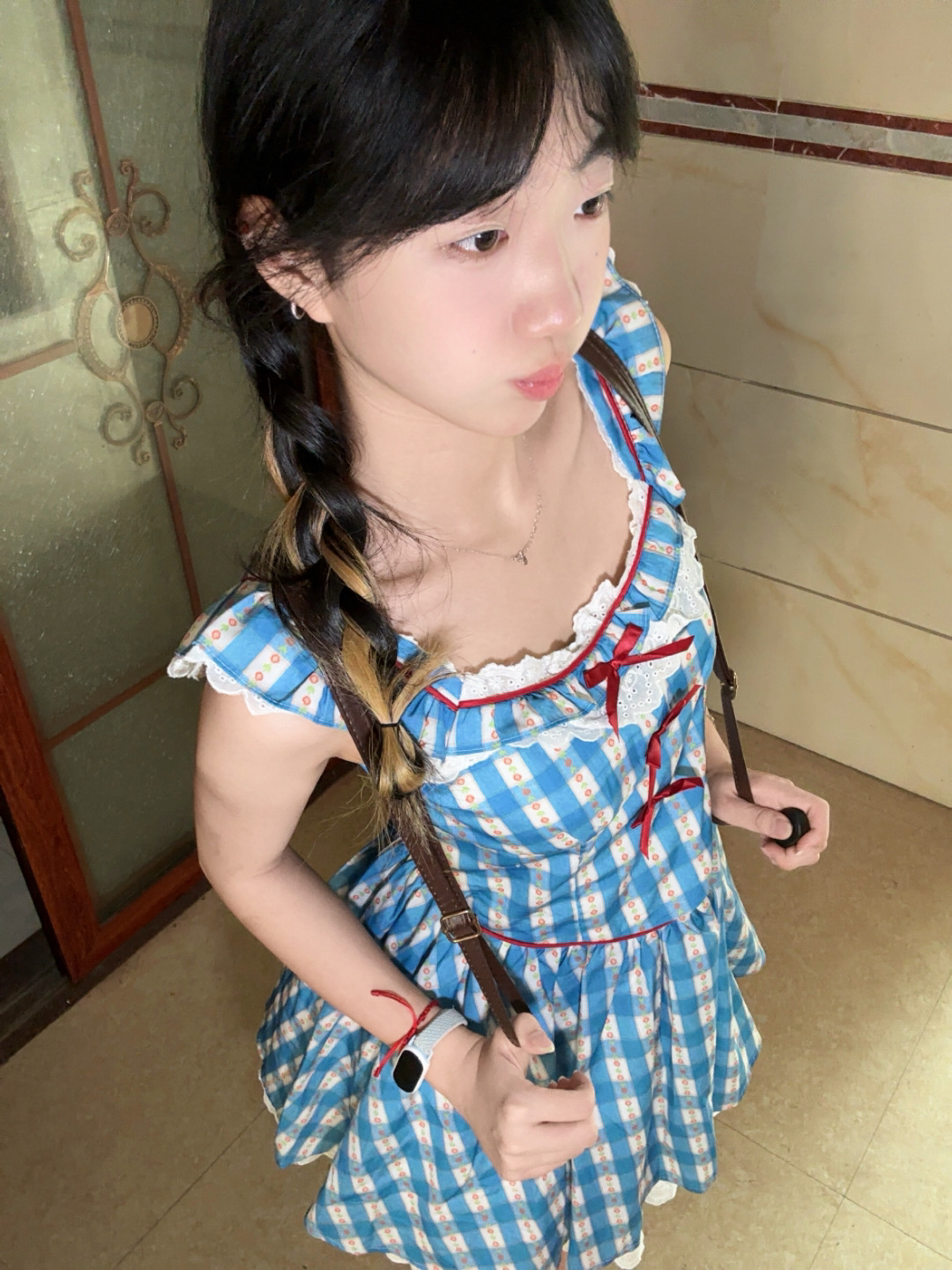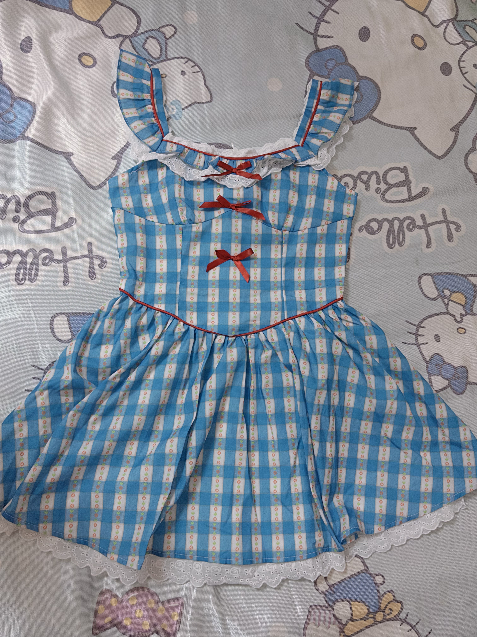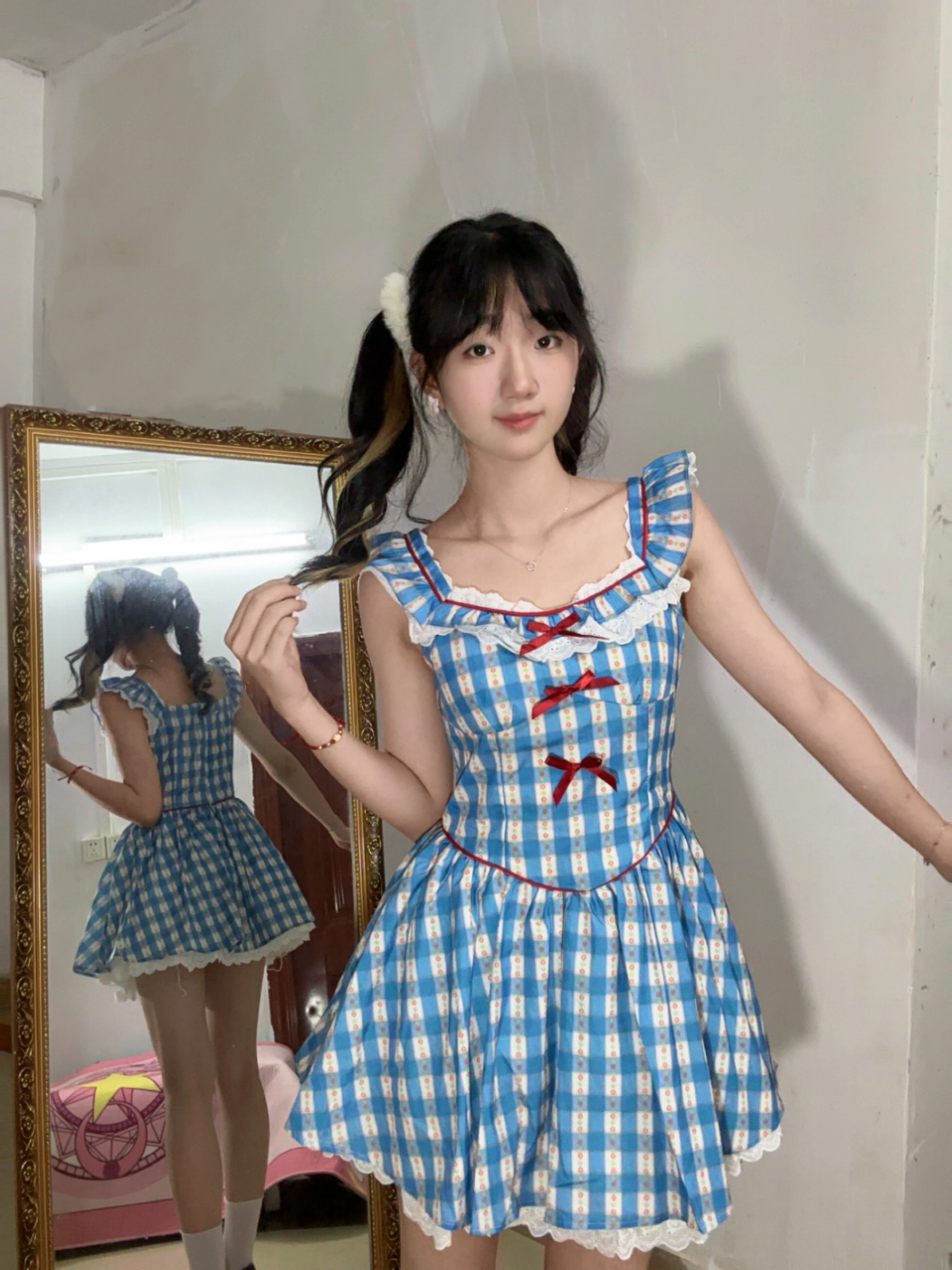 超超可爱的蓝白格子连衣裙,红色蝴蝶结配饰再加上白色花边,要成为最耀眼的那一个咯 面料轻薄透气很适合夏天,搭配小皮鞋去公园拍照超有氛围感~