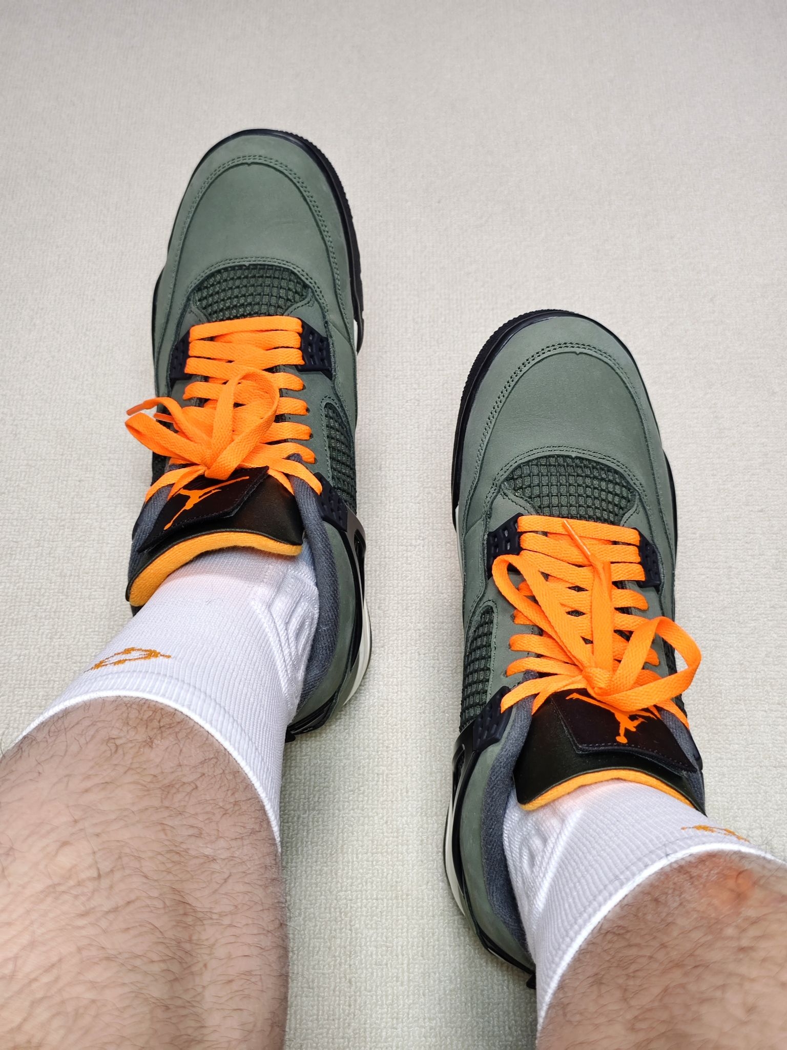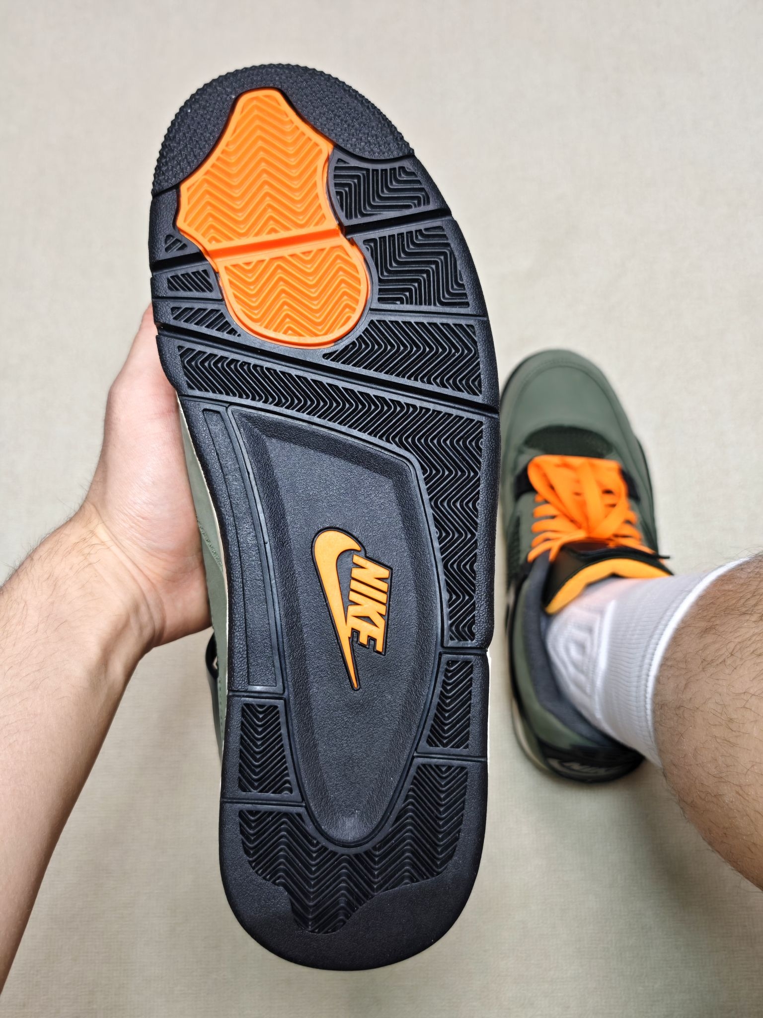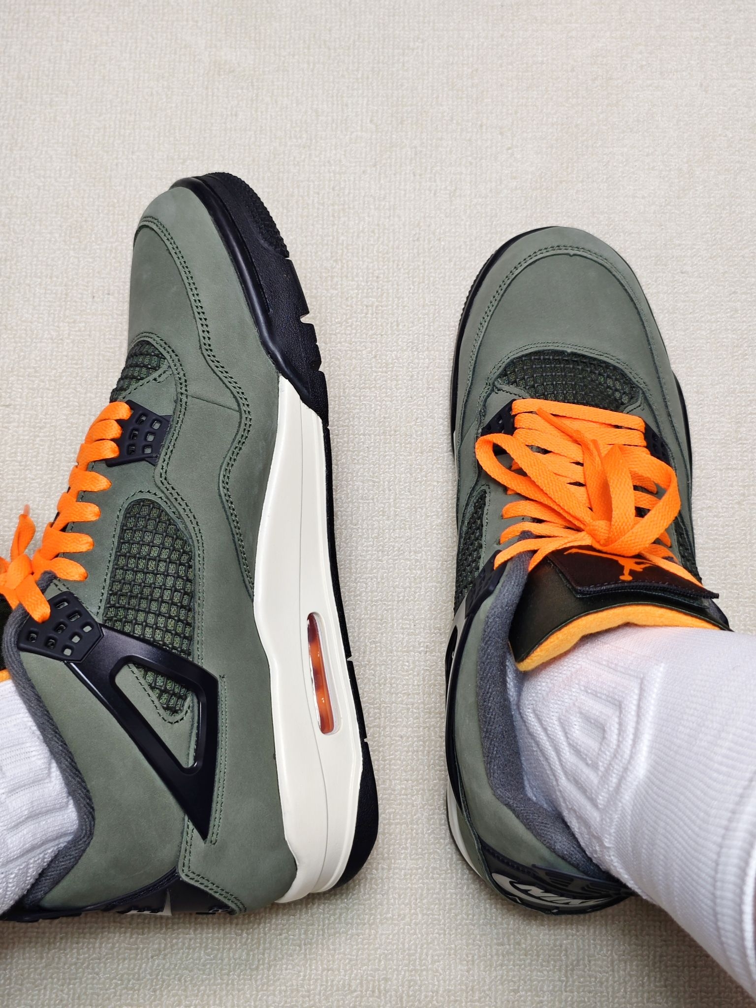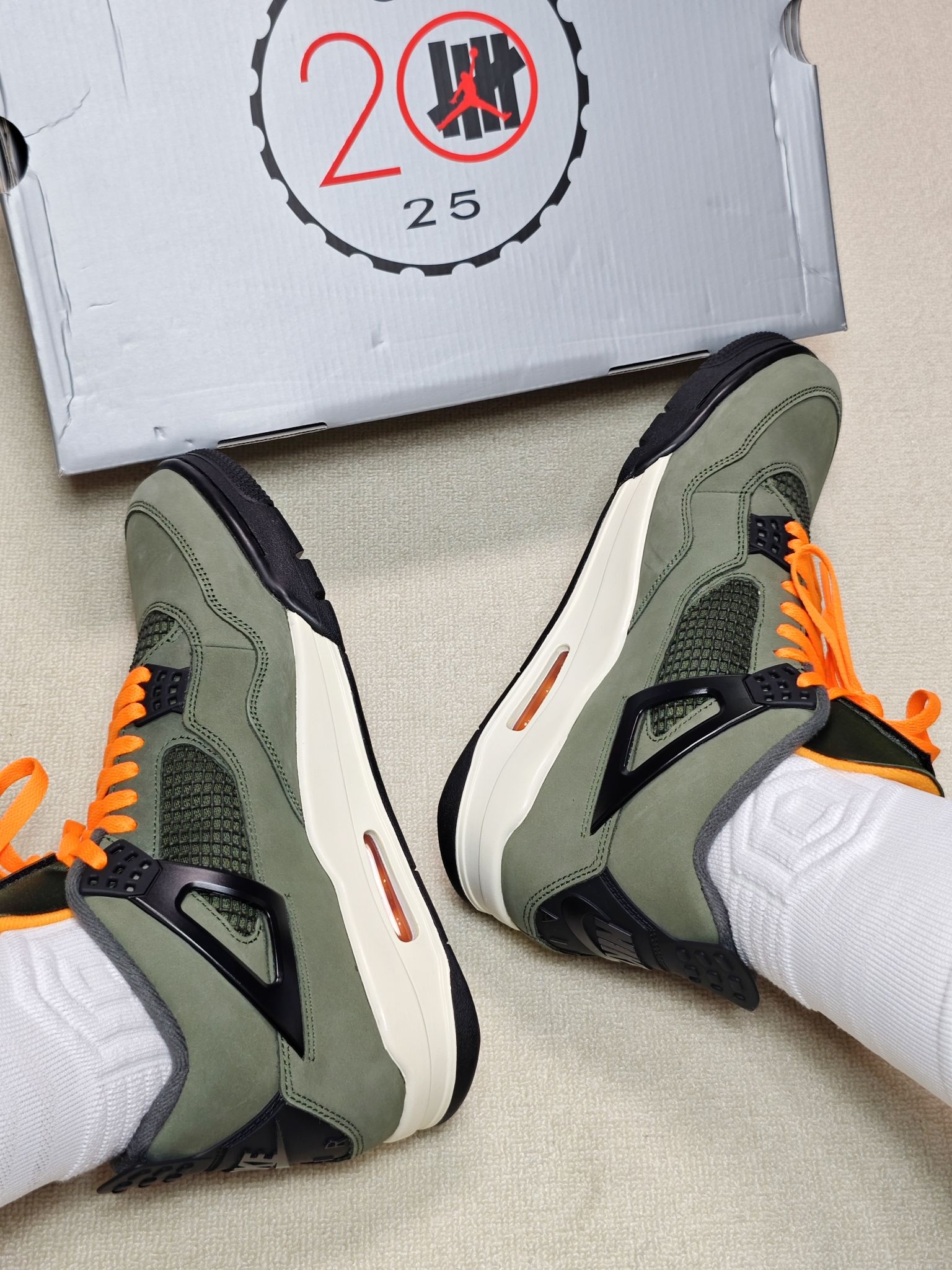 双十一给大家分享一双2025年复刻的Undefeated联名AJ4😎 军绿色麂皮鞋面质感不错,军绿色与橙色的撞色设计凸显个性,日常可搭配工装裤和牛仔裤 采用前后掌Air Sole气垫缓震,在后跟处有可视化气垫开窗,上脚脚感韧弹,大体重穿着也不震脚 全掌人字纹纹路橡胶大底抓地和耐磨很好,尺码偏小建议选大半码到一码😉