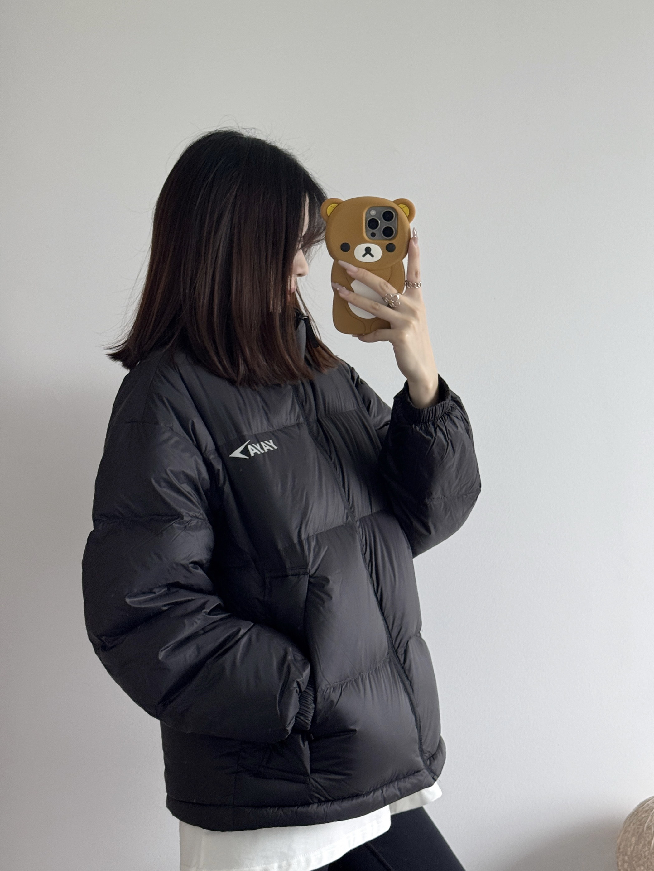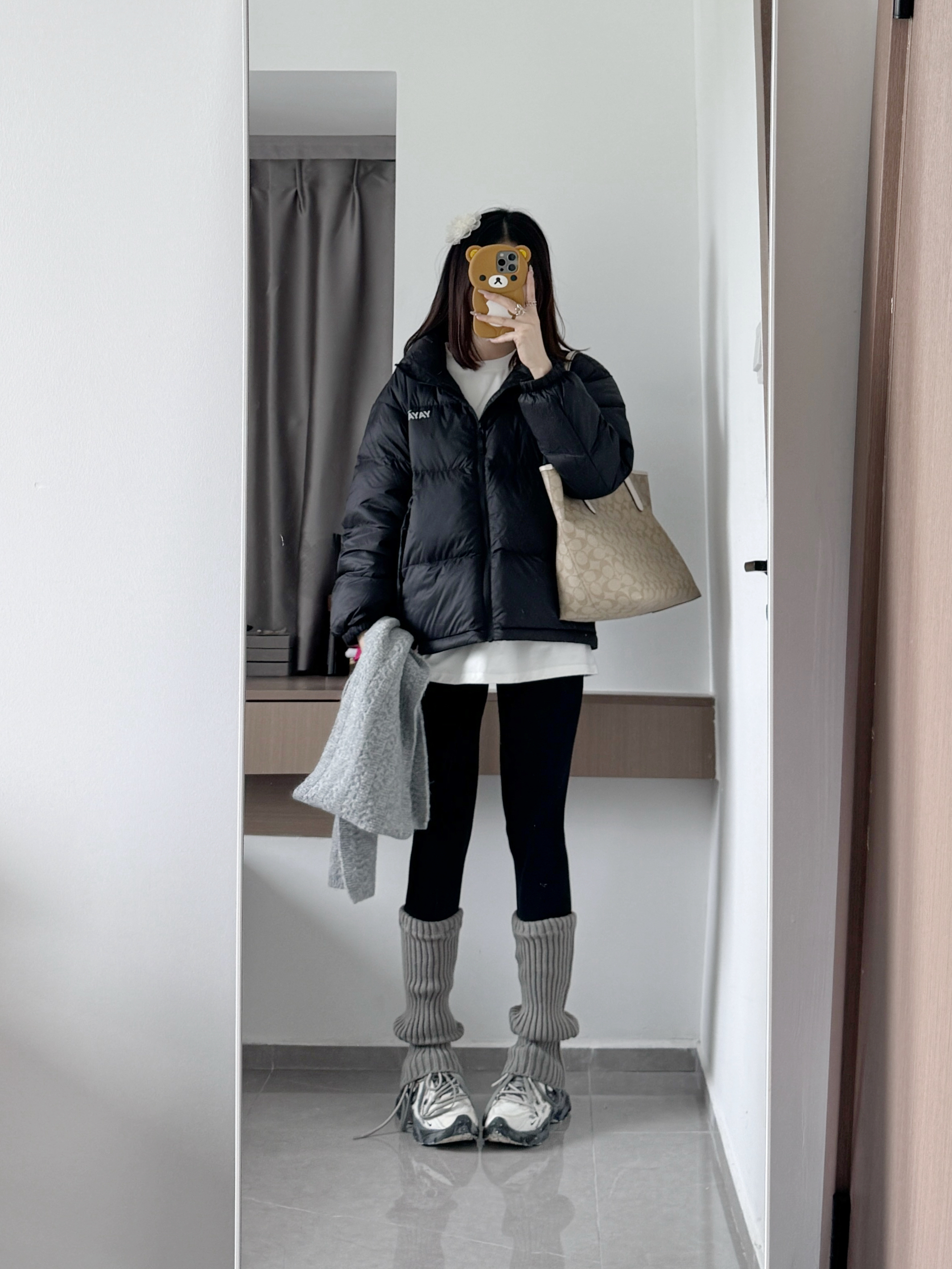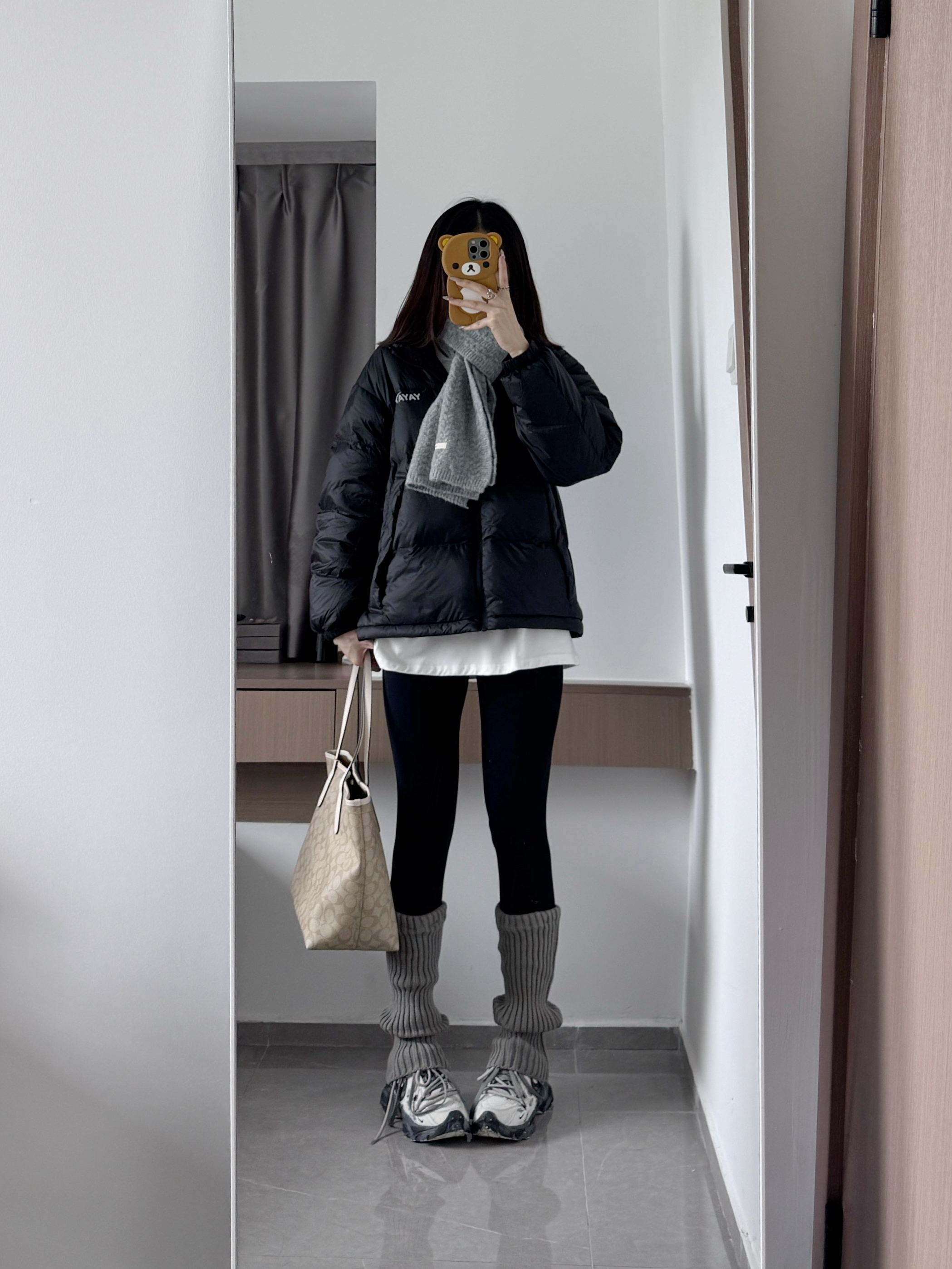 冬天真的离不开羽绒服呀✌️ 黑色尊滴很百搭而且还耐脏~ 鸭绒填充上身好轻好软好暖和! 版型很好长度也很适合 不会压个子哦 搭配围巾一套韩女氛围感拉满啦🥰