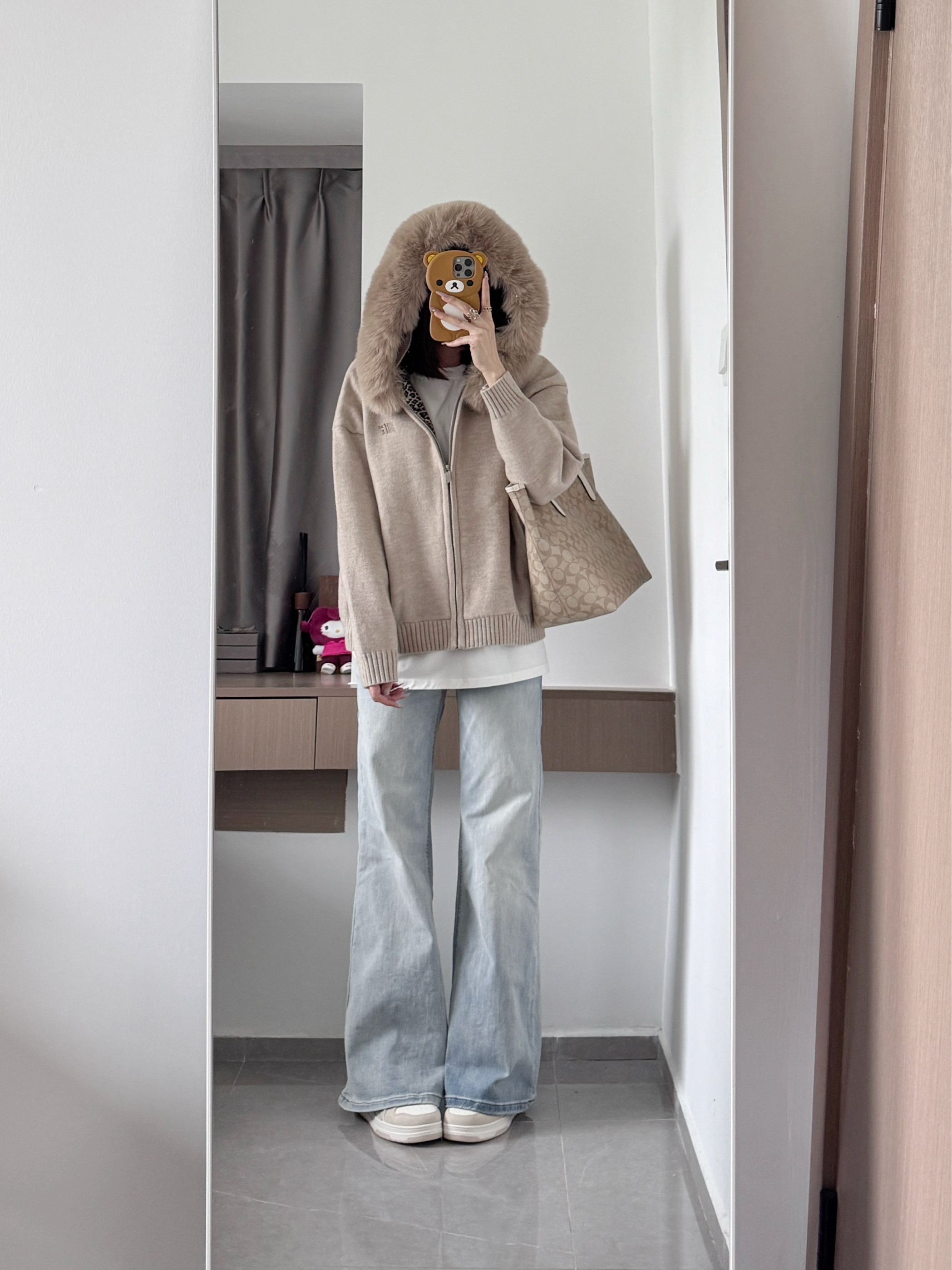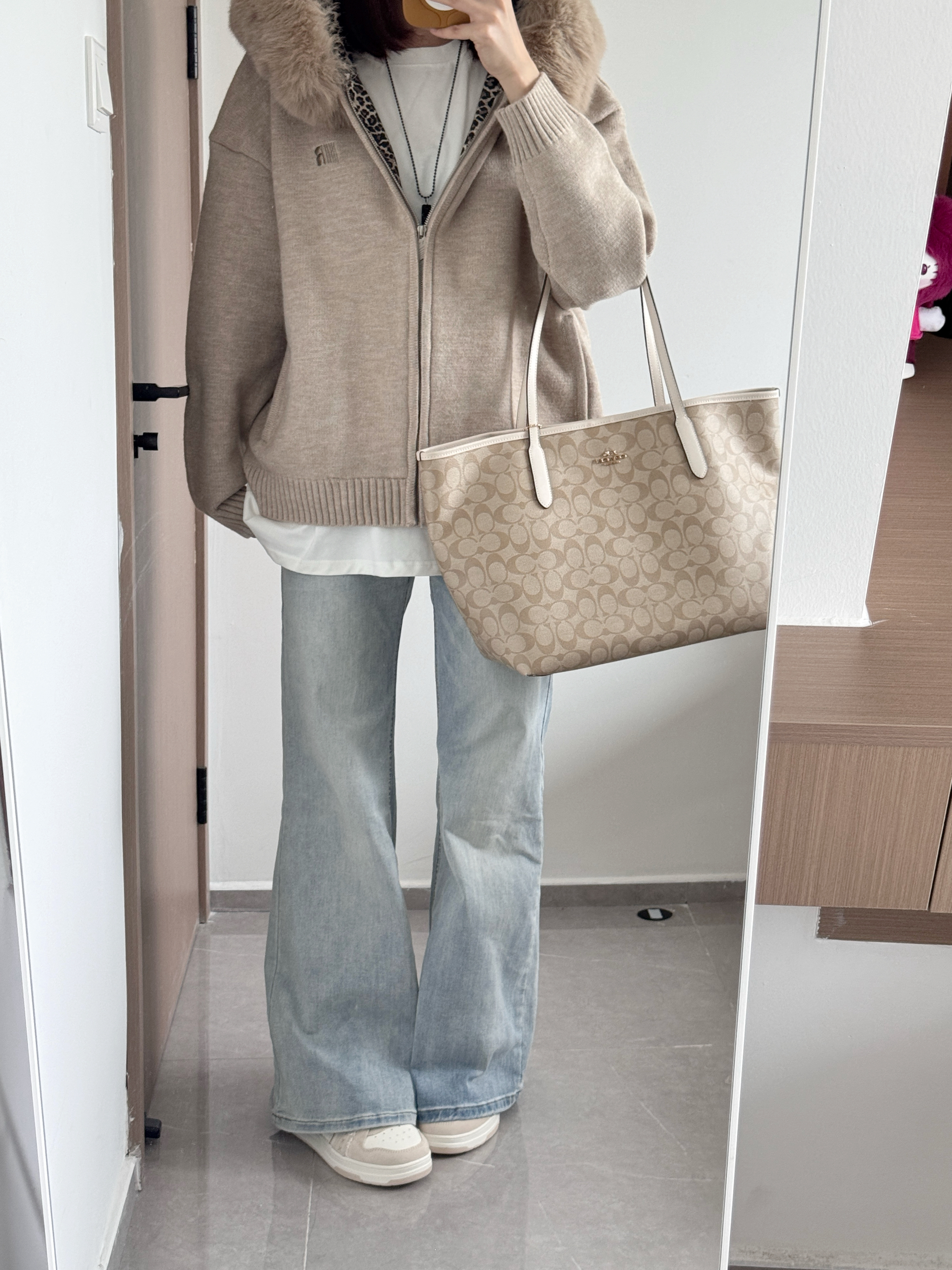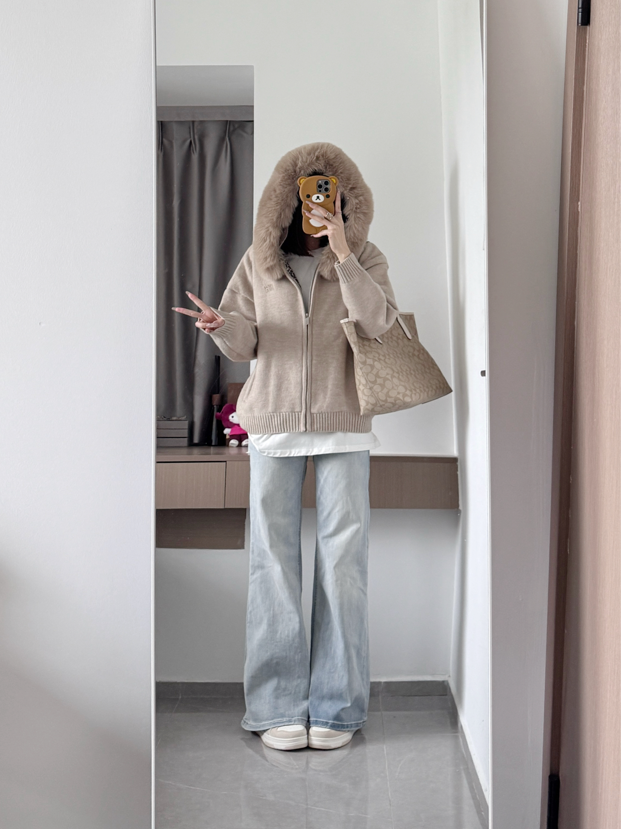 🤎卡其开衫毛衣就是秋冬氛围感的神~ 大毛领暖乎乎的好有安全感! 内衬豹纹一下子就甜酷起来啦🥰 搭配微喇牛仔裤一套韩系松弛感十足
