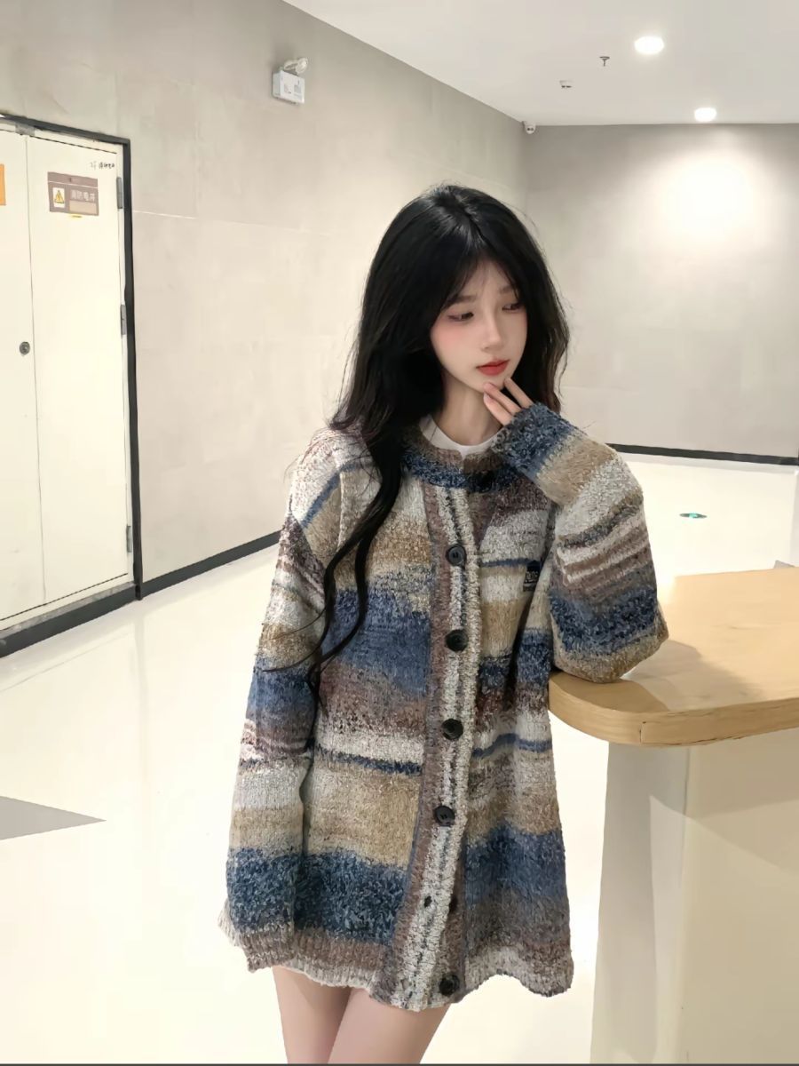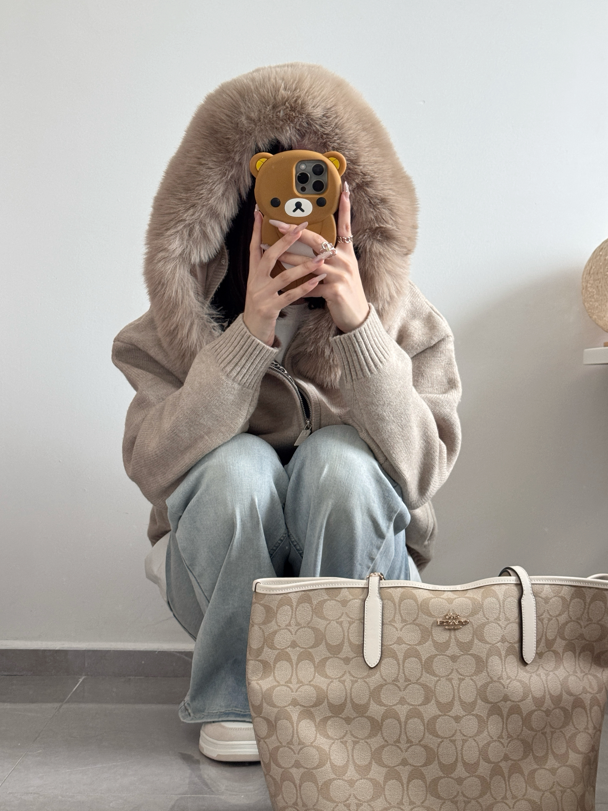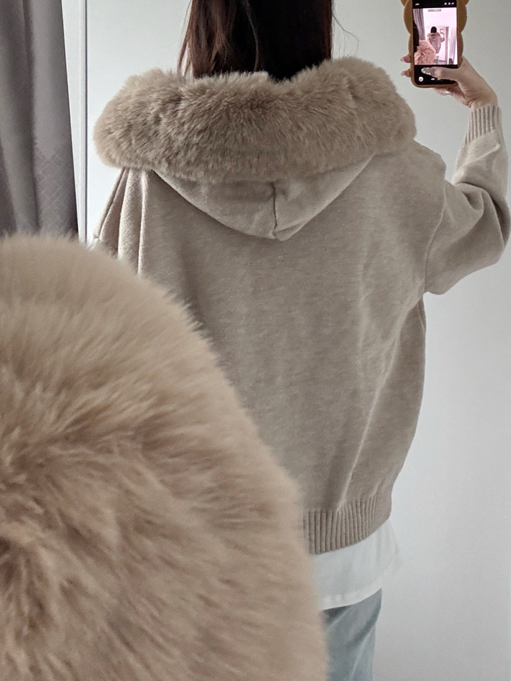 🤎卡其开衫毛衣就是秋冬氛围感的神~ 大毛领暖乎乎的好有安全感! 内衬豹纹一下子就甜酷起来啦🥰 搭配微喇牛仔裤一套韩系松弛感十足