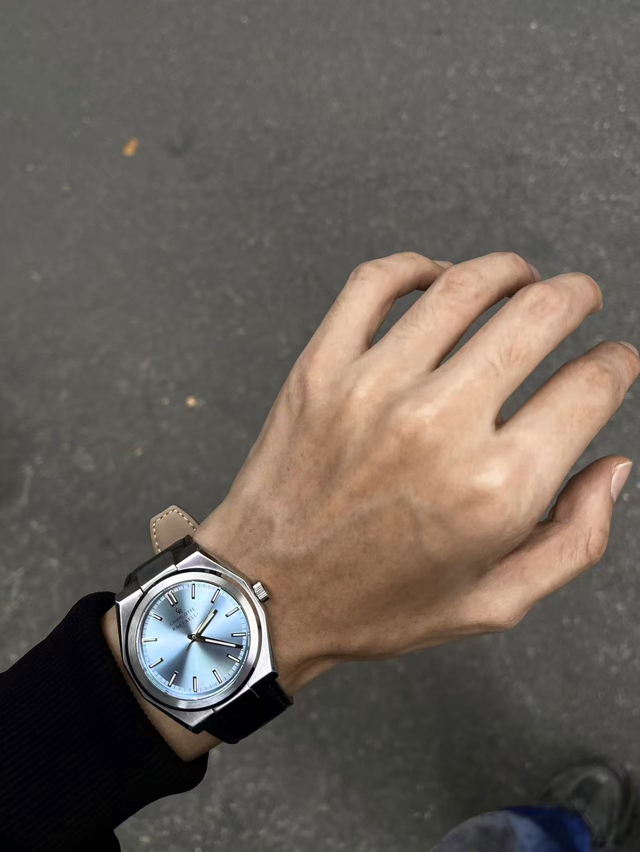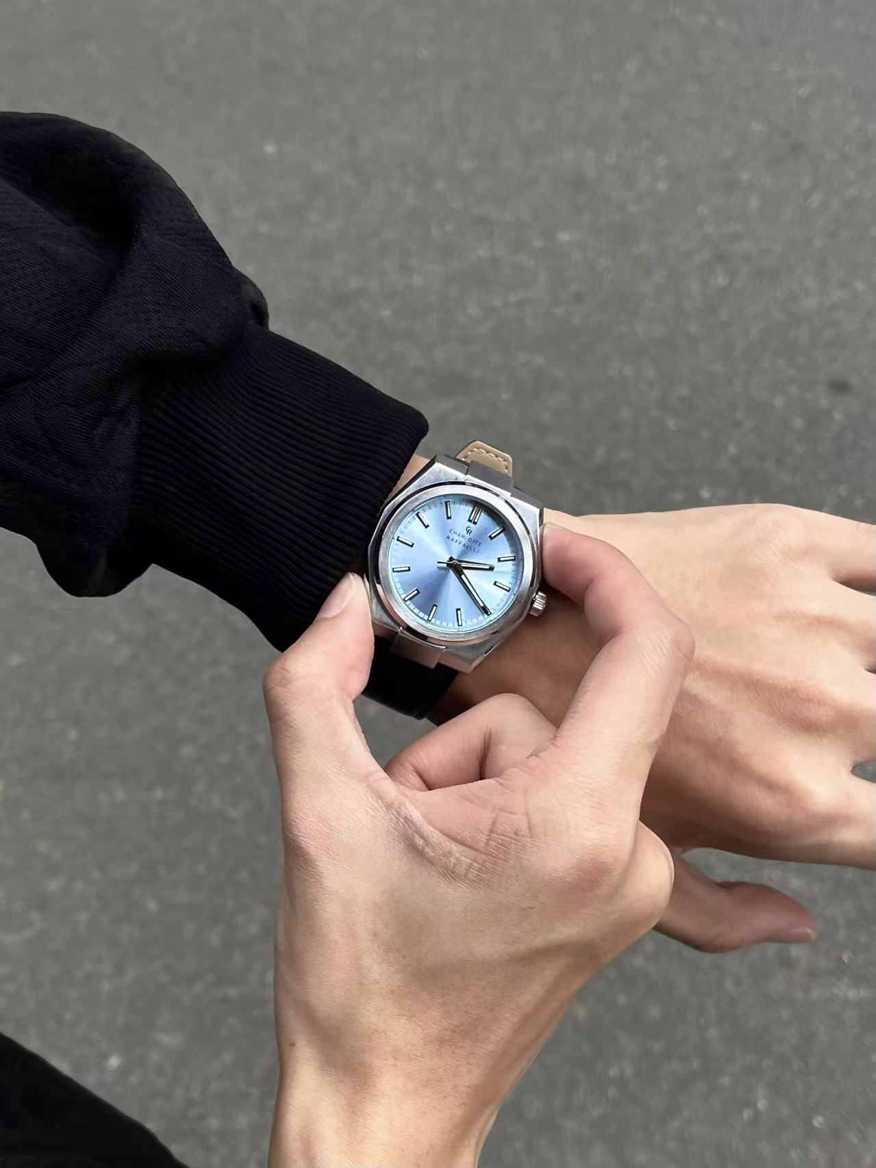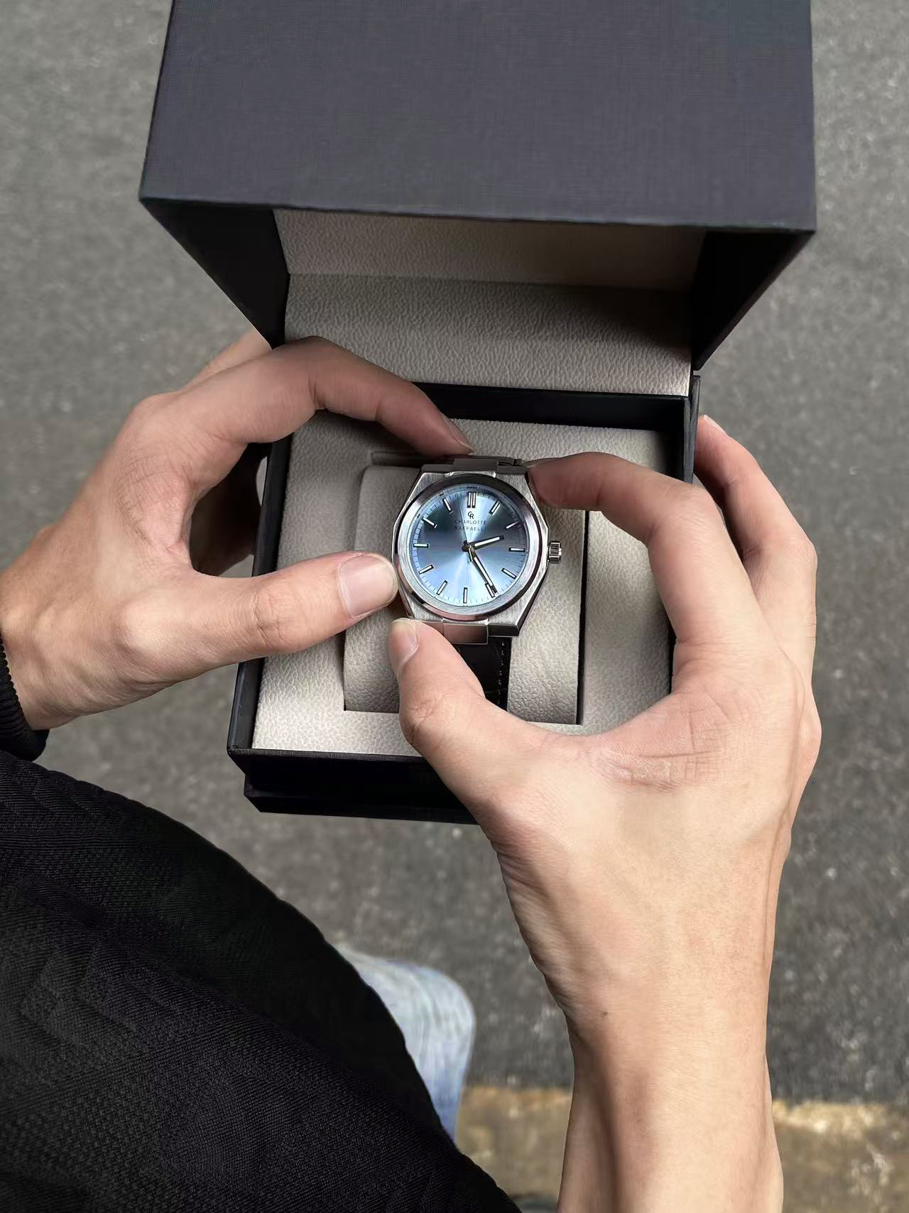 6G入秋一套简单cleanfit穿搭拿捏住😶🌫️ 黑色polo卫衣搭配一条水洗牛仔裤👁️ 点睛之笔的配饰来自 #CharlotteRaffaelli/夏洛特拉斐利 的蓝色之眼手表🔥 渐变的蓝色表盘搭配皮革表带颜值感拉满💎 上手效果没得说一字帅🗡️ 不管是做日常通勤或者是凹造型都是很棒的选择🐟