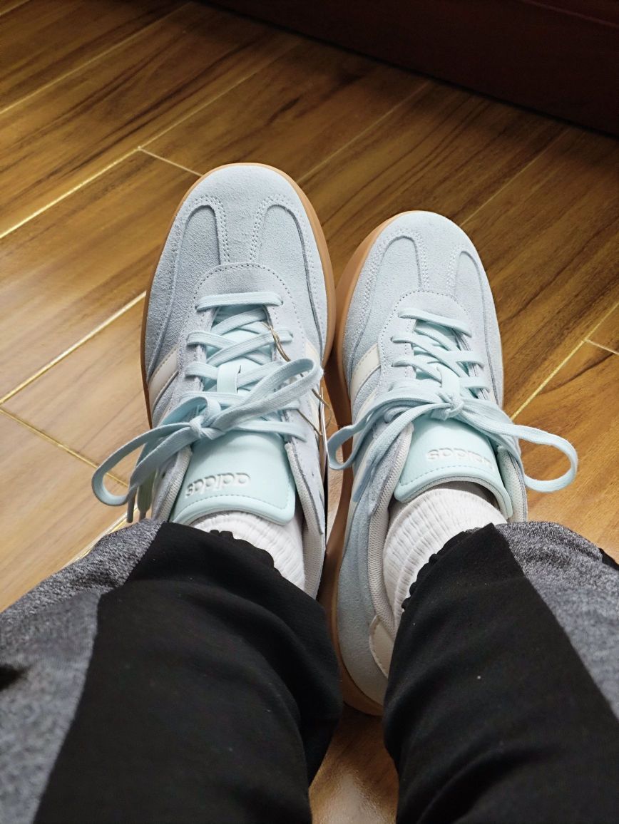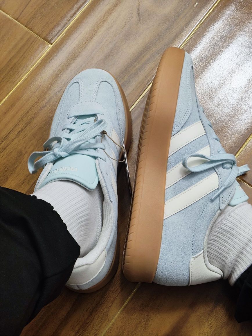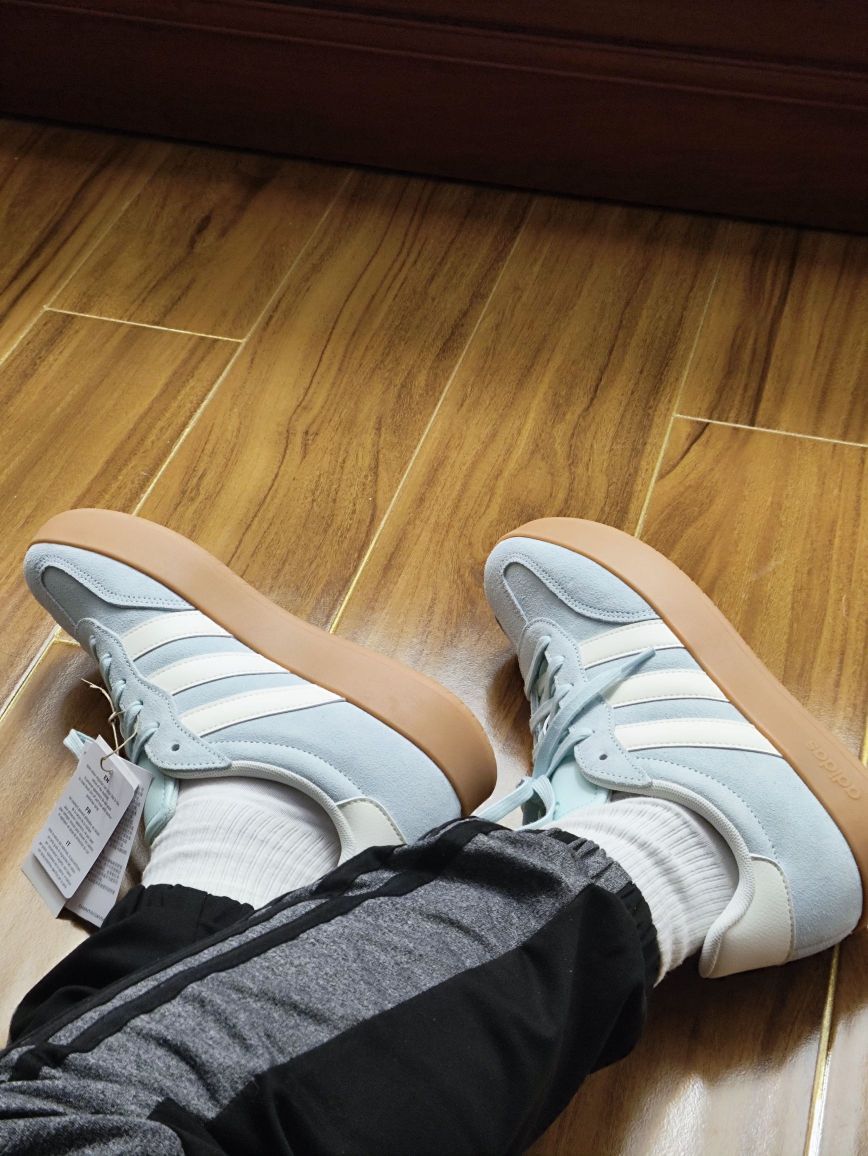 谁懂啊!我真的被这双奶蓝阿迪德训鞋狠狠戳中💘~ 浅蓝麂皮拼接皮革,摸起来软fufu☁️,搭配白条纹+浅棕鞋底,复古感直接拉满,逛街上脚还被问链接,我真的超开心呀🥰! 上脚体验我太满意了✨! 鞋型超贴我的亚洲脚型,前掌不挤脚,新鞋直接穿不用磨合,包裹感超足👌~ 鞋垫软硬刚好,我每天暴走1万步都不累,穿几天鞋底更软弹,越穿越爱❤️! 30℃穿也不闷脚,透气性我觉得ok,橡胶底抓地力超棒,通勤、健身...