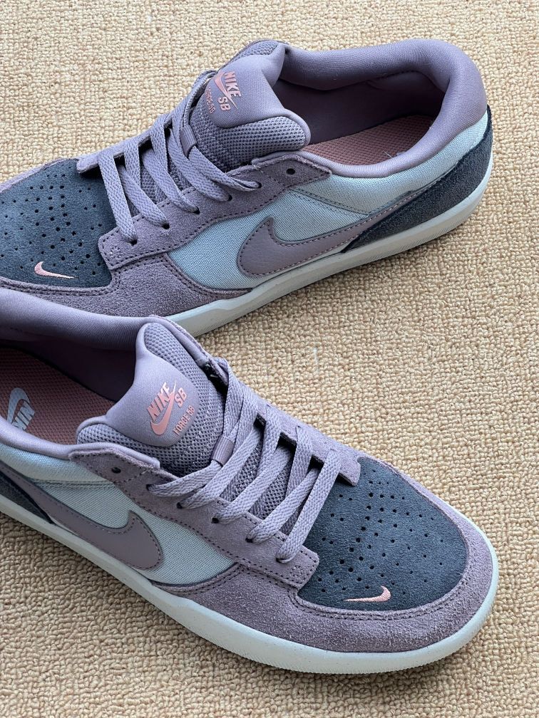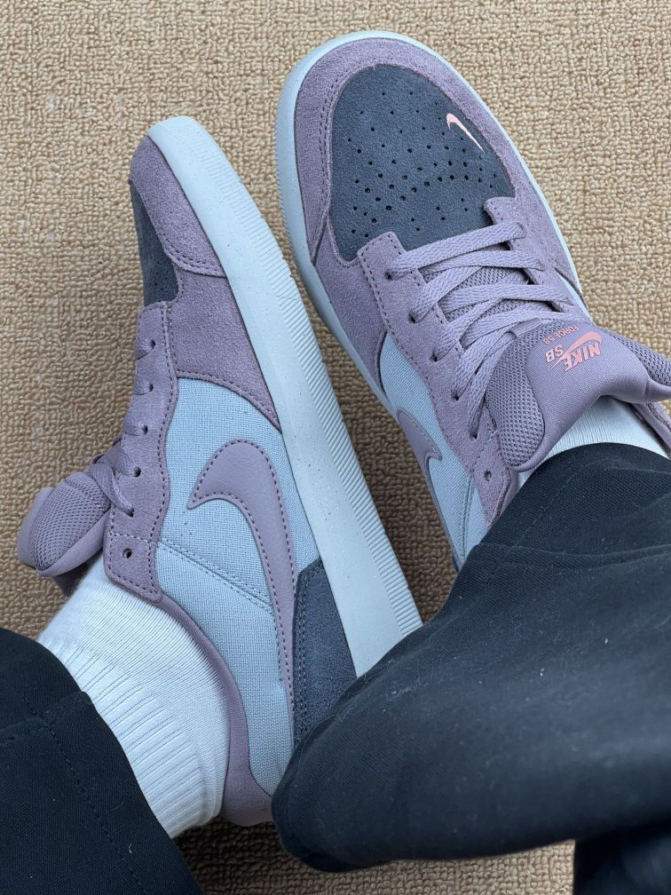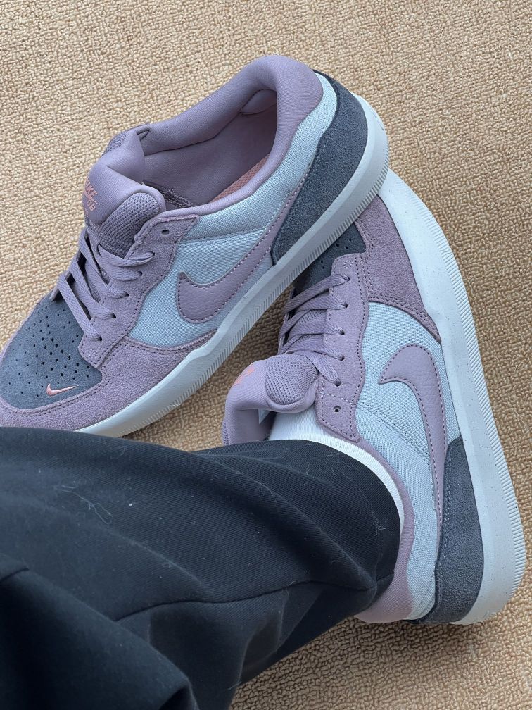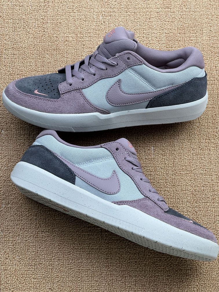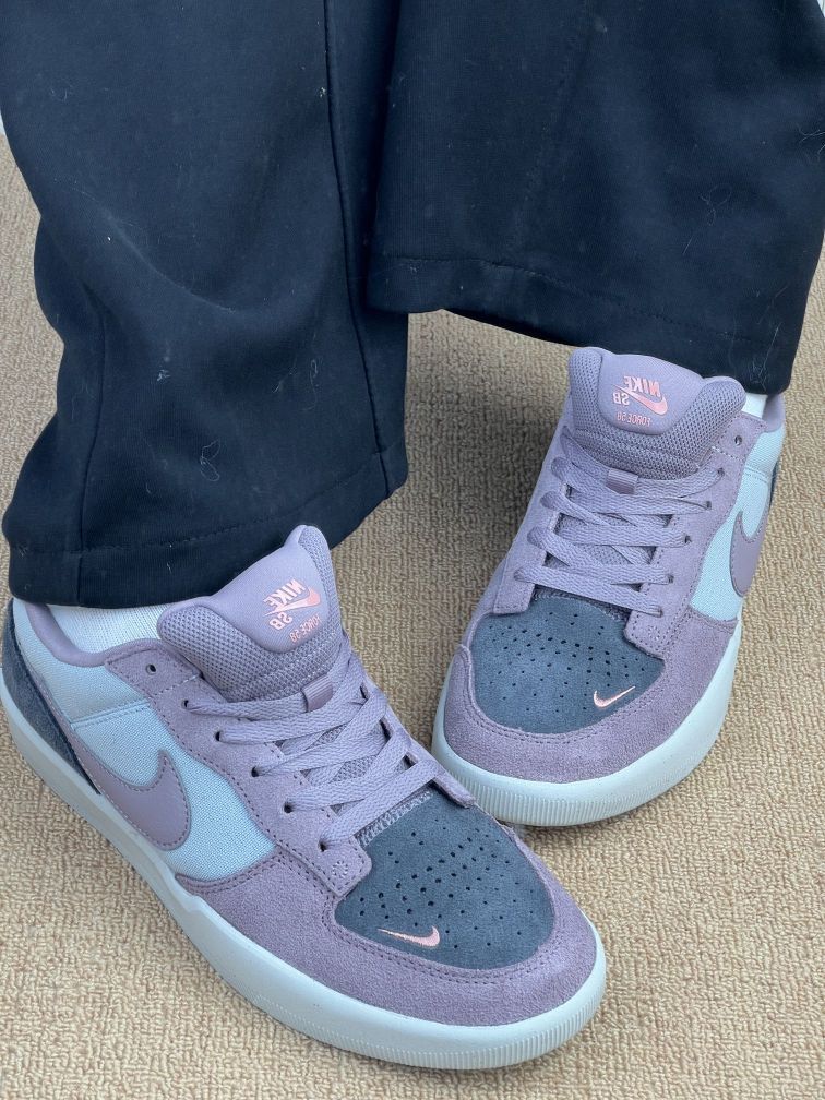 这双Nike SB Force 58上脚一周,说说真实感受: 首先是颜值,低饱和度的紫灰调确实顺眼,麂皮+网布的拼接摸着手感还行,但麂皮部分沾灰挺明显的(穿了两天鞋头就有点显脏😅),得常擦。 脚感属于“够用但不惊艳”,鞋垫软度一般,走半小时以上脚底会有点酸,不过滑板或者日常短穿没压力。鞋型偏窄,我正常脚型穿厚袜子会有点挤,宽脚可能得选大半码。 细节上,鞋舌的粉色Logo挺耐看,但鞋帮内...