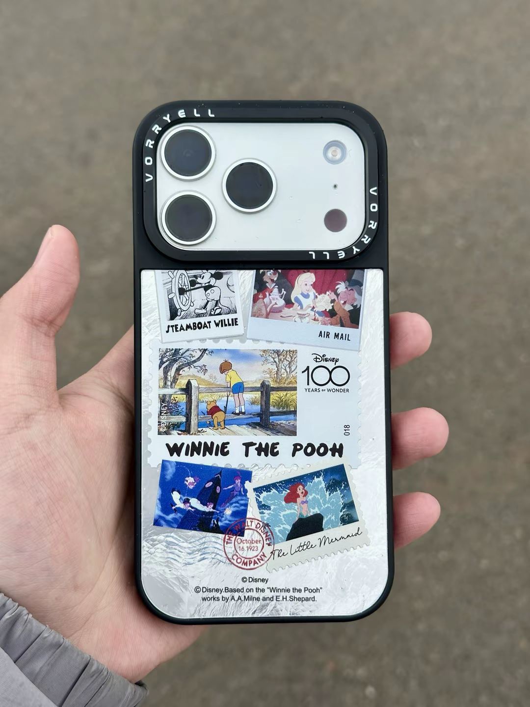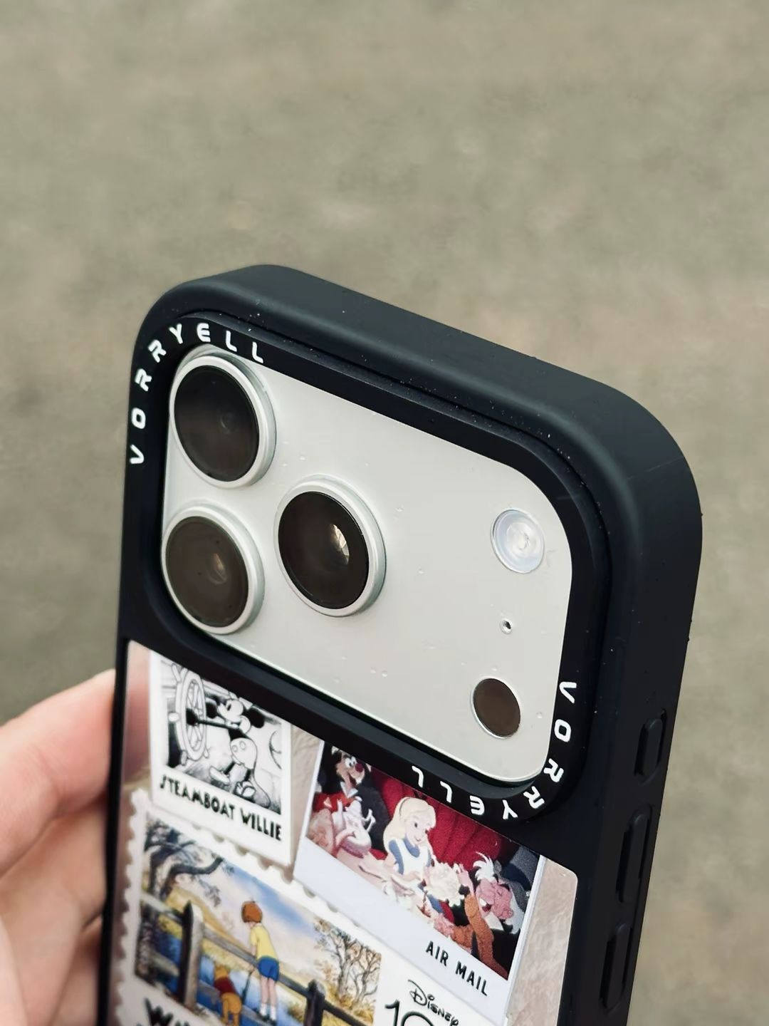 没想到我的17pro也是穿上迪斯尼的衣服啦! 吼吼看啊哈哈哈哈,银色手机真的是百搭啊~ 尤其这个黑色边框,跟银色镜头模组形成鲜明对比 更突出高级感了,真的好看呢 按键也都是独立的,按的很舒服,相机按键也是做了全包处理的,很安心,整体的包裹感很舒服 上面邮票的小设计是真好看呢,还得是迪斯尼出品~