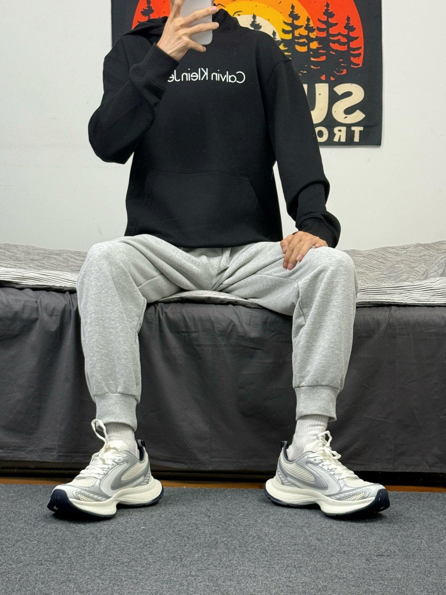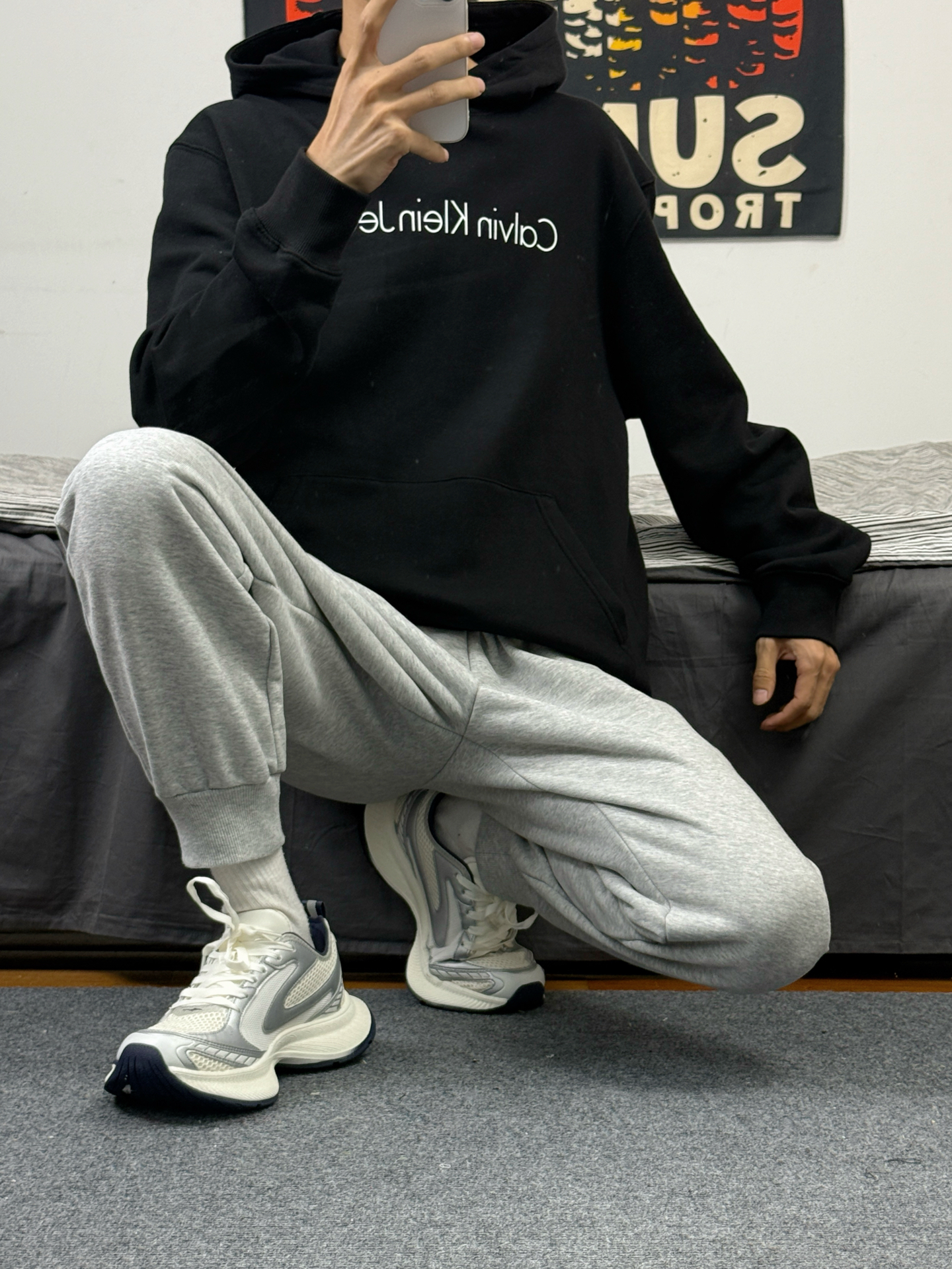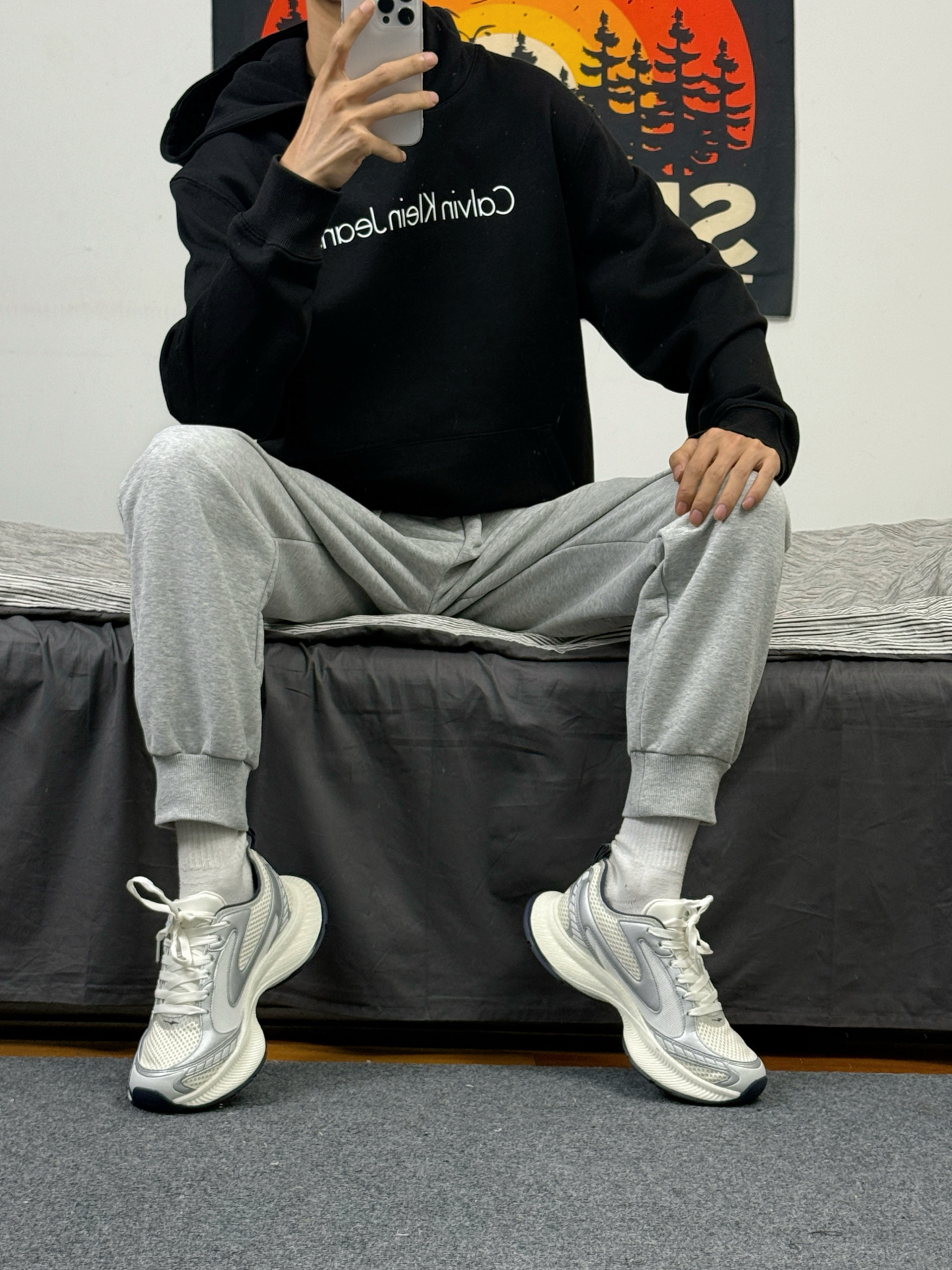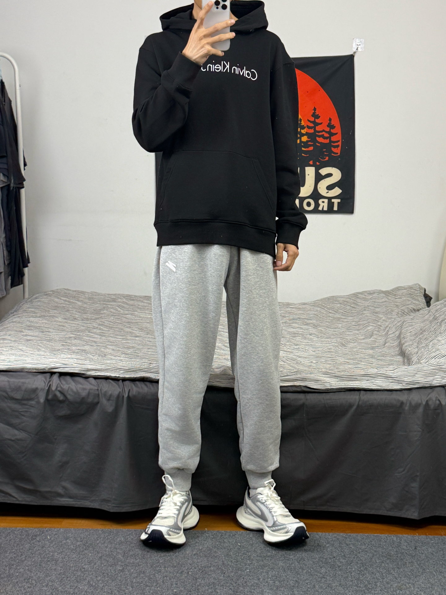 身高174体重48kg 今日上身 黑色卫衣+灰裤子+生活休闲鞋 上身搭配的黑色卫衣 胸口有简约logo设计 上身简约百搭 174/48kg 上身m码 裤子搭配的灰色束腿裤 美式复古风格,内里做了加厚设计 穿在身上保暖还舒适,主要特别显腿长 174/48kg 上身m码 穿在身上保暖还舒适 👟搭配的 鸿星尔克 家的生活休闲鞋 千禧年的款式,银白配色特别吸引眼球 鞋面都是网眼设计,比较透气舒适 防滑...