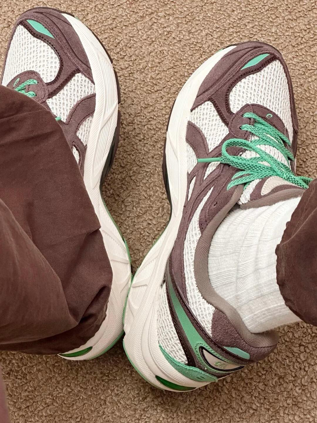 刚摸到鞋的瞬间就被戳中——不是沉闷的运动款,是像把秋日的松咖(深棕)、晨雾的白(网面)和溪涧的薄荷(亮绿)揉在一起,网布拼麂皮的质感裹着线条感鞋身,像把“不被定义的野”揣进了鞋里,硬核又藏着点松弛的少年气。 👉 它直接治好了“复古跑鞋的通病” 总愁“复古鞋太笨重、机能款难搭日常”?这双刚好卡在「轻软+有细节」的点上: • 脚感buff:透气网面让脚像裹在风里,夏天穿不闷汗;中底是“软但不塌”...