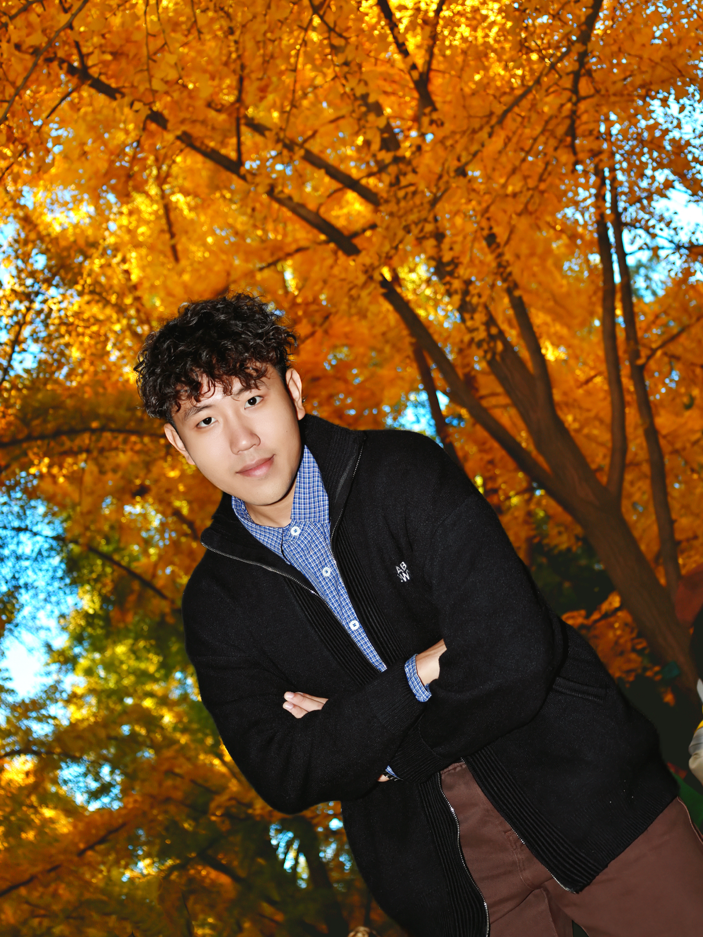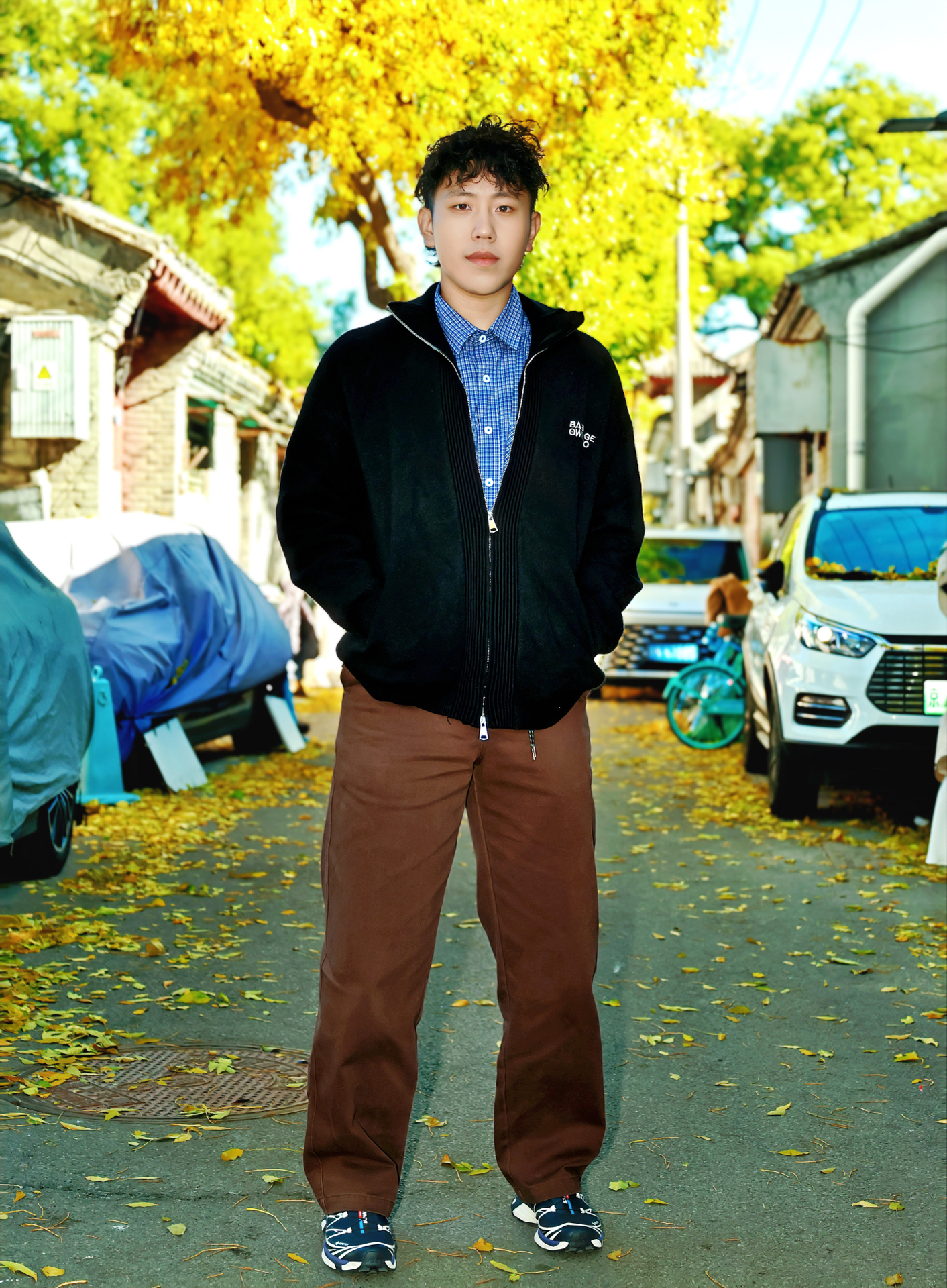 深蓝格纹衬衫打底,学院风拉满🎓 外搭黑色拉链毛衣,层次感up✨ 棕色阔腿裤复古回潮,慵懒随性🍂 搭配同色系XT6收尾,潮酷平衡拿捏👟 京城银杏树下,秋日氛围感满分🍁 日常出街,轻松出片📸 #好穿舒适的户外鞋 #男大学生早秋OOTD #一双鞋拿捏街头 #秋天cozyft穿搭 #拿捏复古松弛感