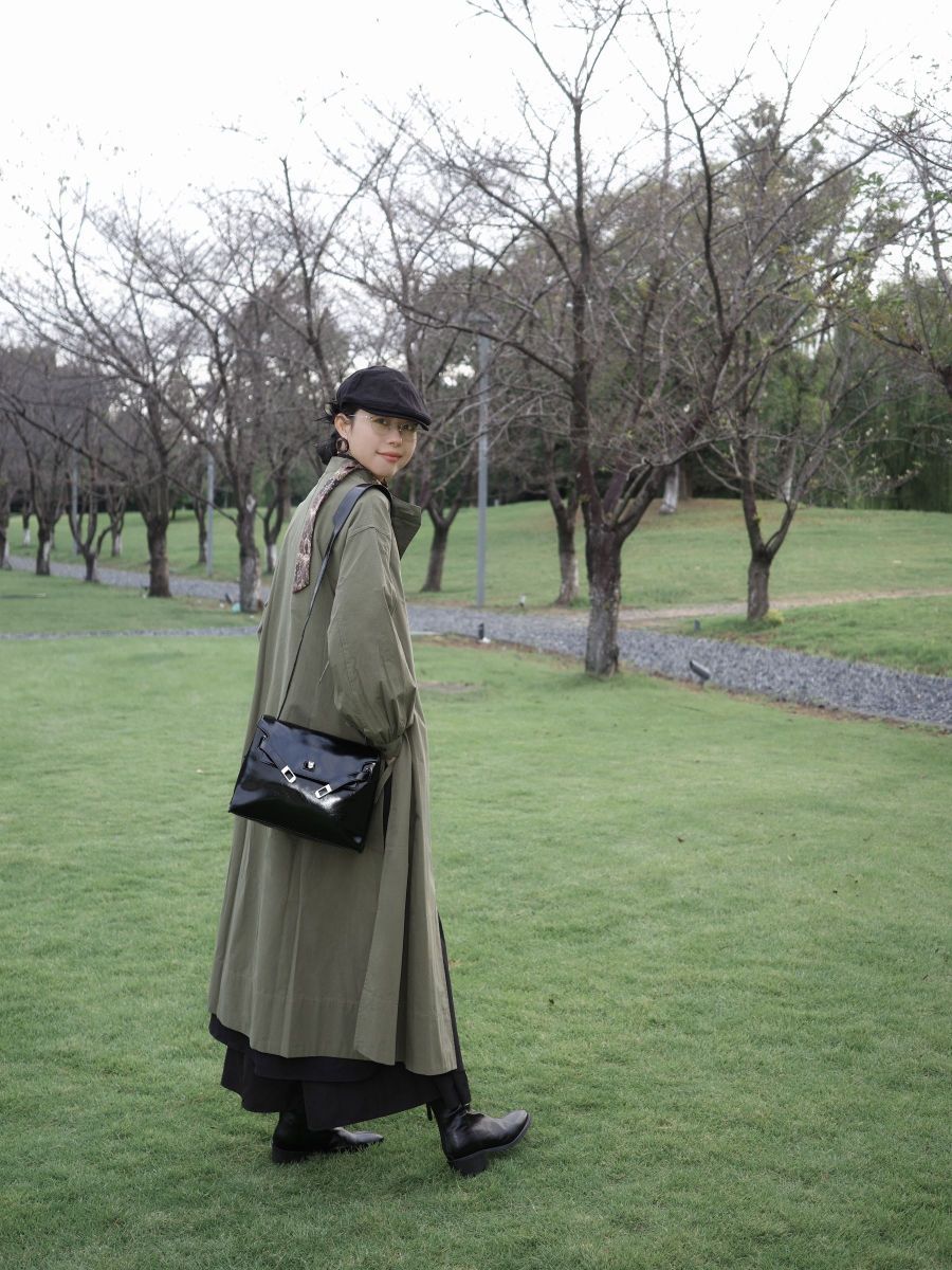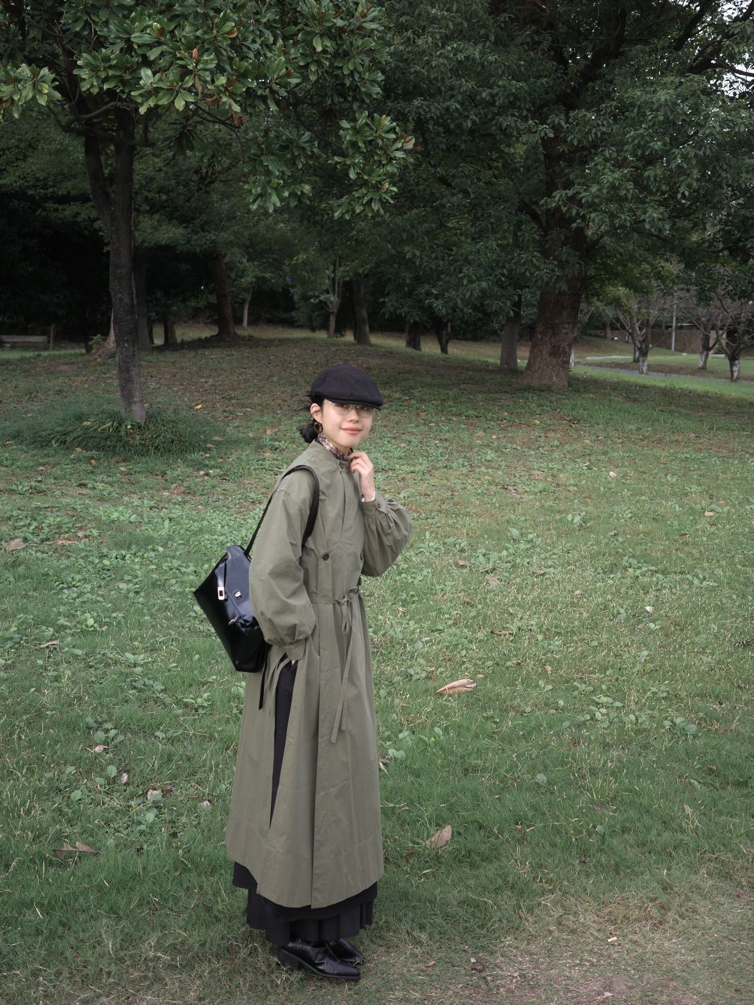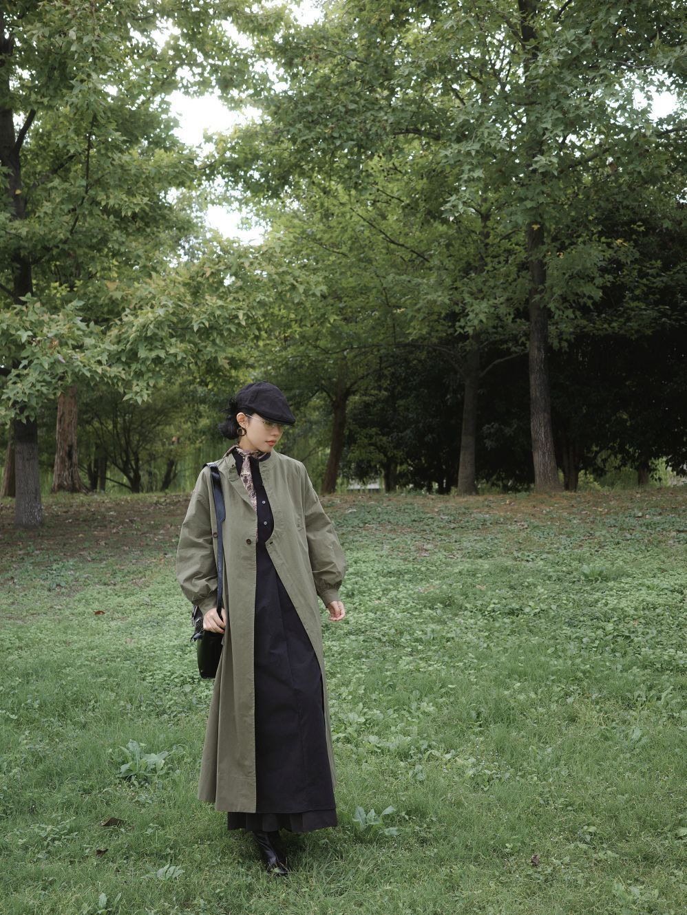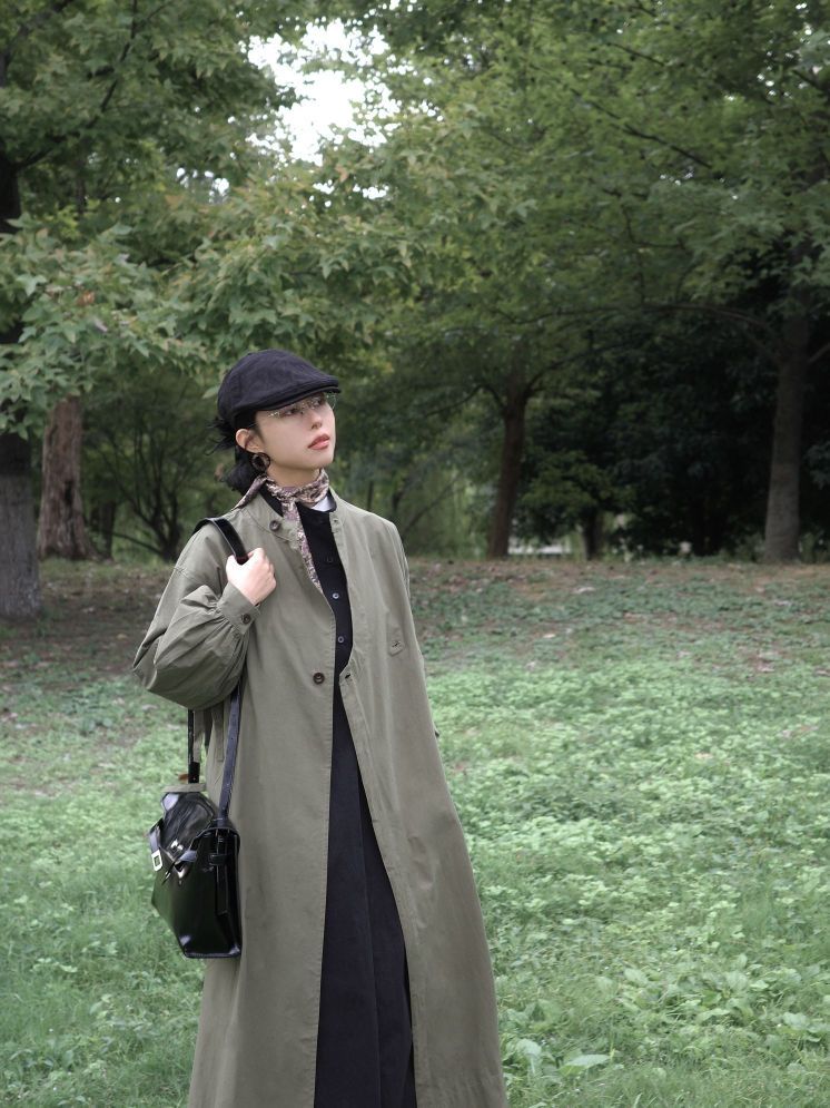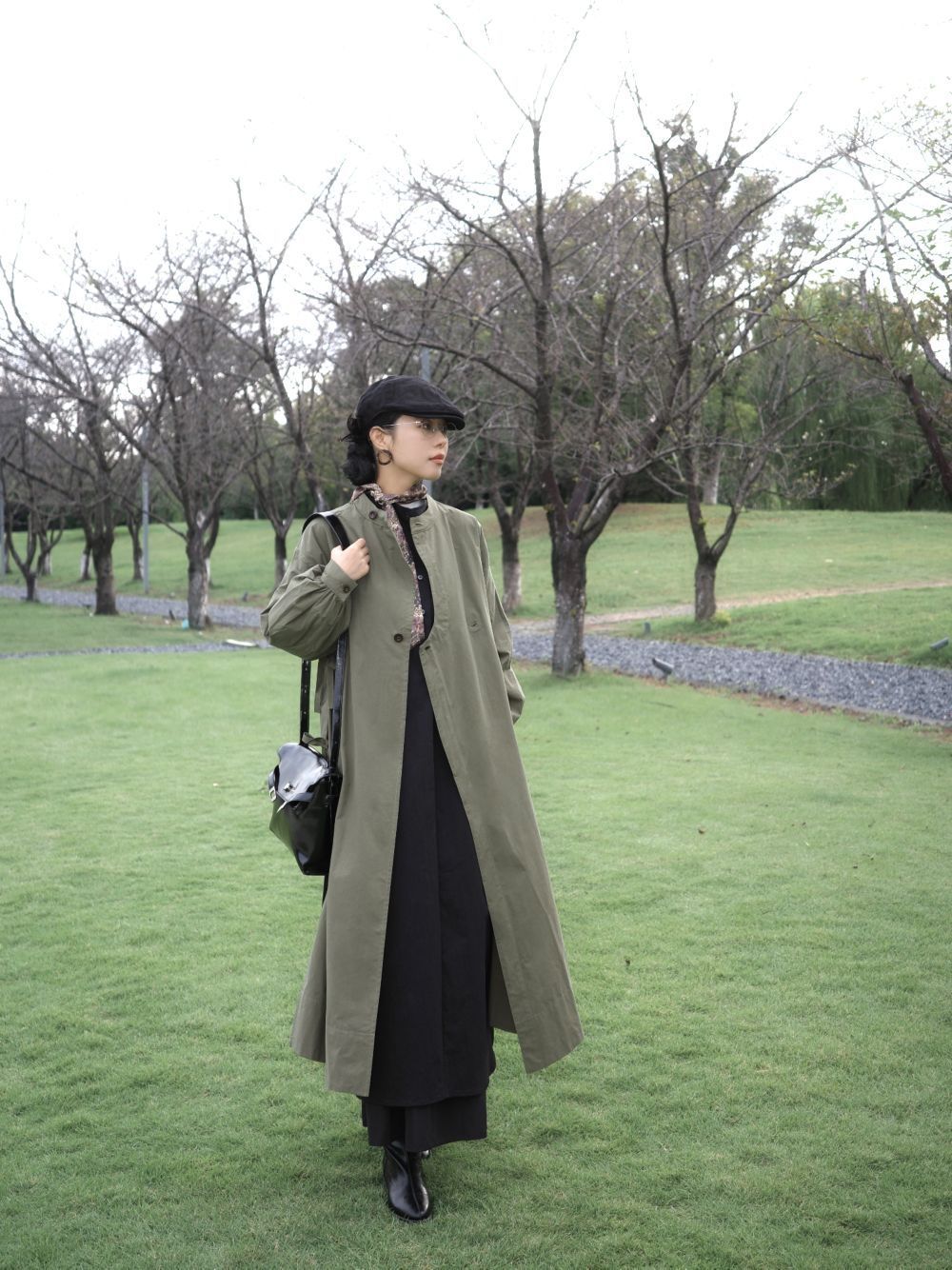 秋天不穿风衣什么时候穿!风裹着草地的软乎气儿,裹件长风衣出门才是这季节该有的样子。 自次的搭配思路是:橄榄绿风衣➕黑色连衣裙作为内搭,搭配黑色帽皮包和帽子。橄榄绿搭全黑,低饱和的绿像沾了点草地的潮气,和沉下来的黑裹一起,舒服地融进自然中去。