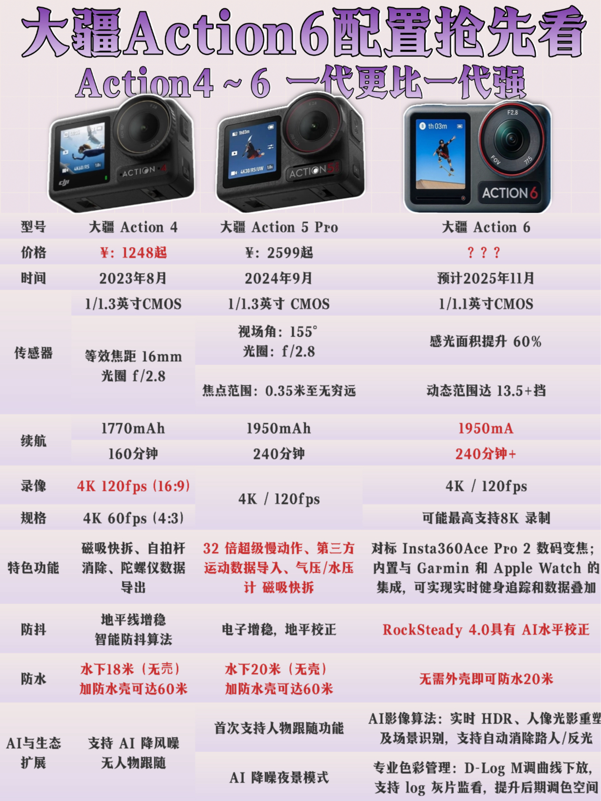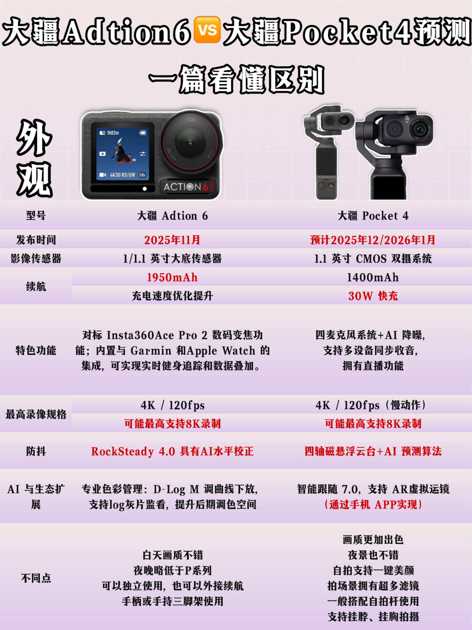 家人们!大疆年末放大招——Action6和Pocket4这俩新机配置直接卷到天花板!看完对比我已经纠结到抠手指了🤌 🆚先看Pocket家族的「进化暴击」 从Pocket2→3→4,每代都是质的飞跃: • 屏幕:1英寸LCD→2英寸OLED→1000nit高亮屏(大太阳下终于能看清了!) • 画质:1/1.7英寸→1英寸→1.1英寸双摄+8K视频,夜景直接起飞 • 防抖:三轴→三轴跟随→四...