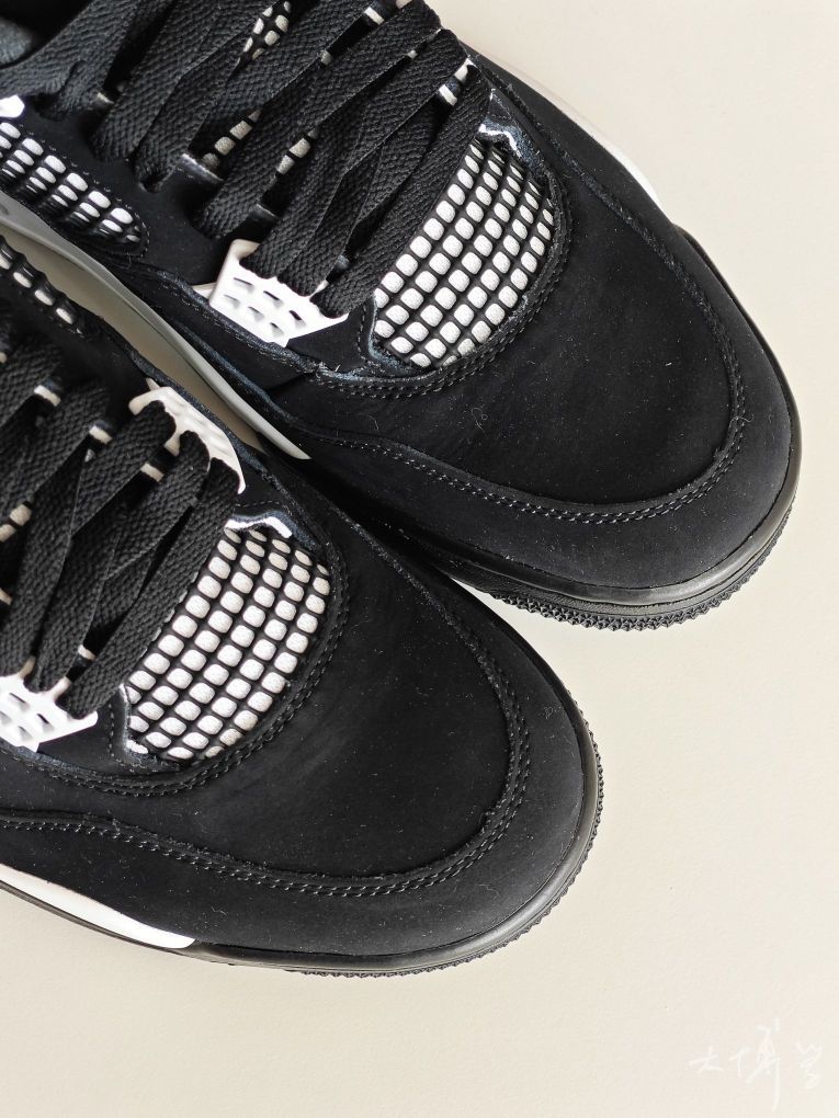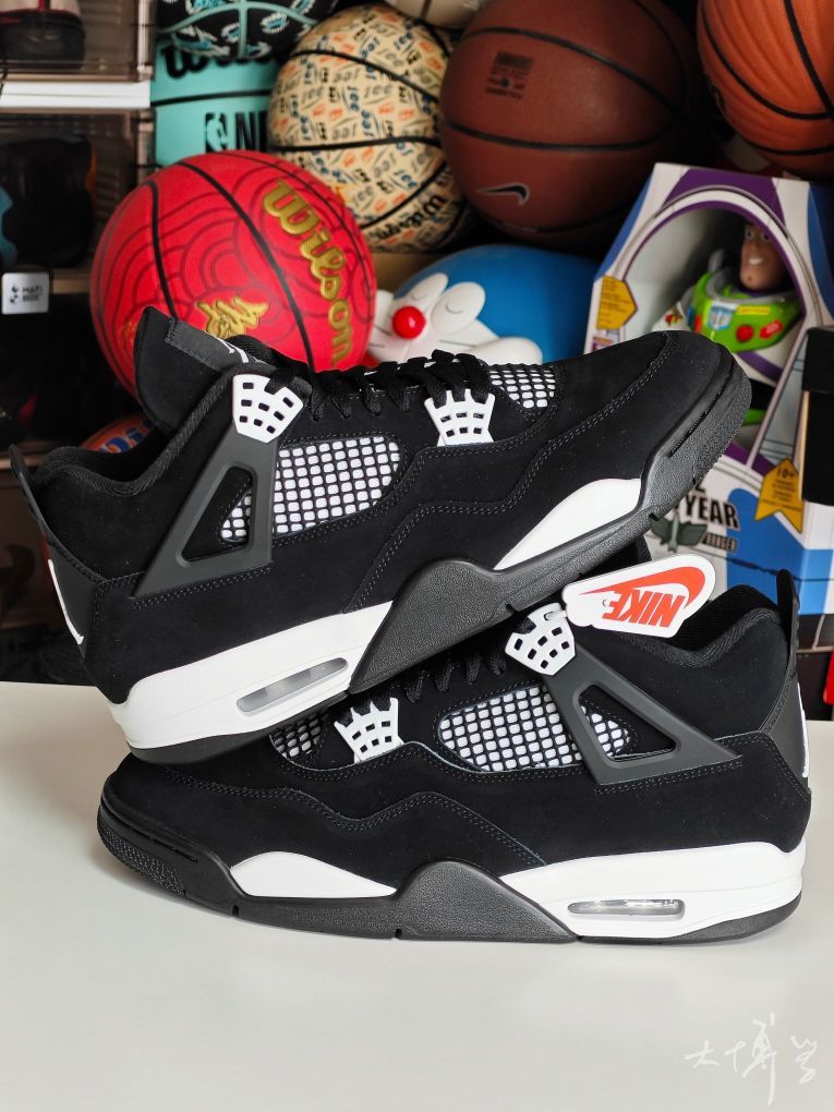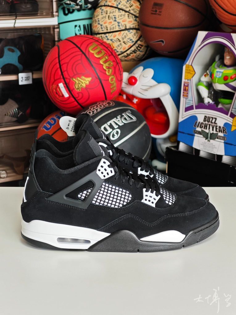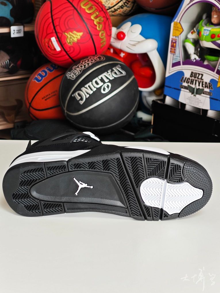 一双黑白配色的AJ4 鞋面以磨砂皮为主(有点爱吸灰) 鞋身网格、鞋带扣等部位为白色 中底和后跟细节融入灰色 整体风格简约,穿搭方面包容度很高 鞋跟开窗Sole气垫,脚感偏硬 后跟是jumpman logo 我个人比较倾向这个logo 简单的黑白配色 厚度很适合秋冬季节