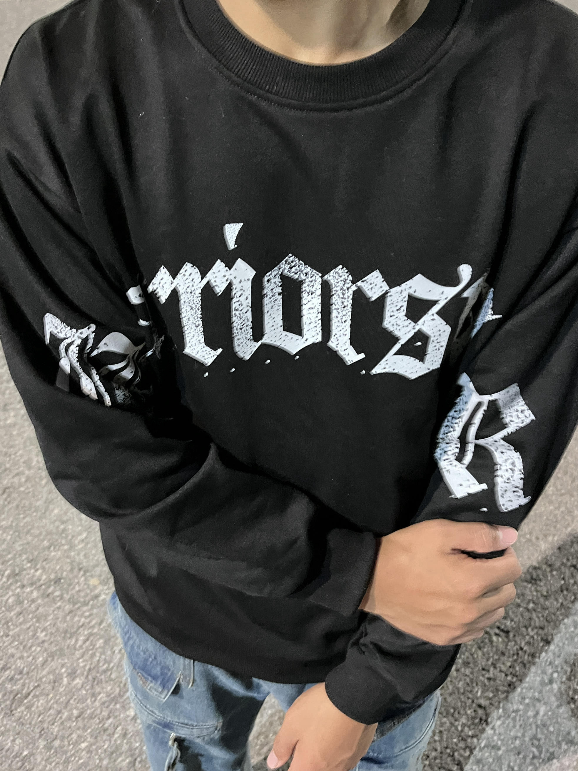 Warrior/回力 这款黑色印花卫衣 纯棉材质柔软舒适,宽松版型超显瘦 春秋穿刚刚好! 正面复古哥特字体+袖部印花, 美式街头感满满,随性又有个性✨ 圆领设计经典百搭 日常出街、居家、运动都能轻松驾驭 搭配牛仔裤或工装裤,轻松get高街痞帅风! 超喜欢这件宝藏T恤 好有设计感!! 你们觉得这件卫衣搭配工装裤还是牛仔裤更有街头感? 评论区告诉我@识货穿搭君