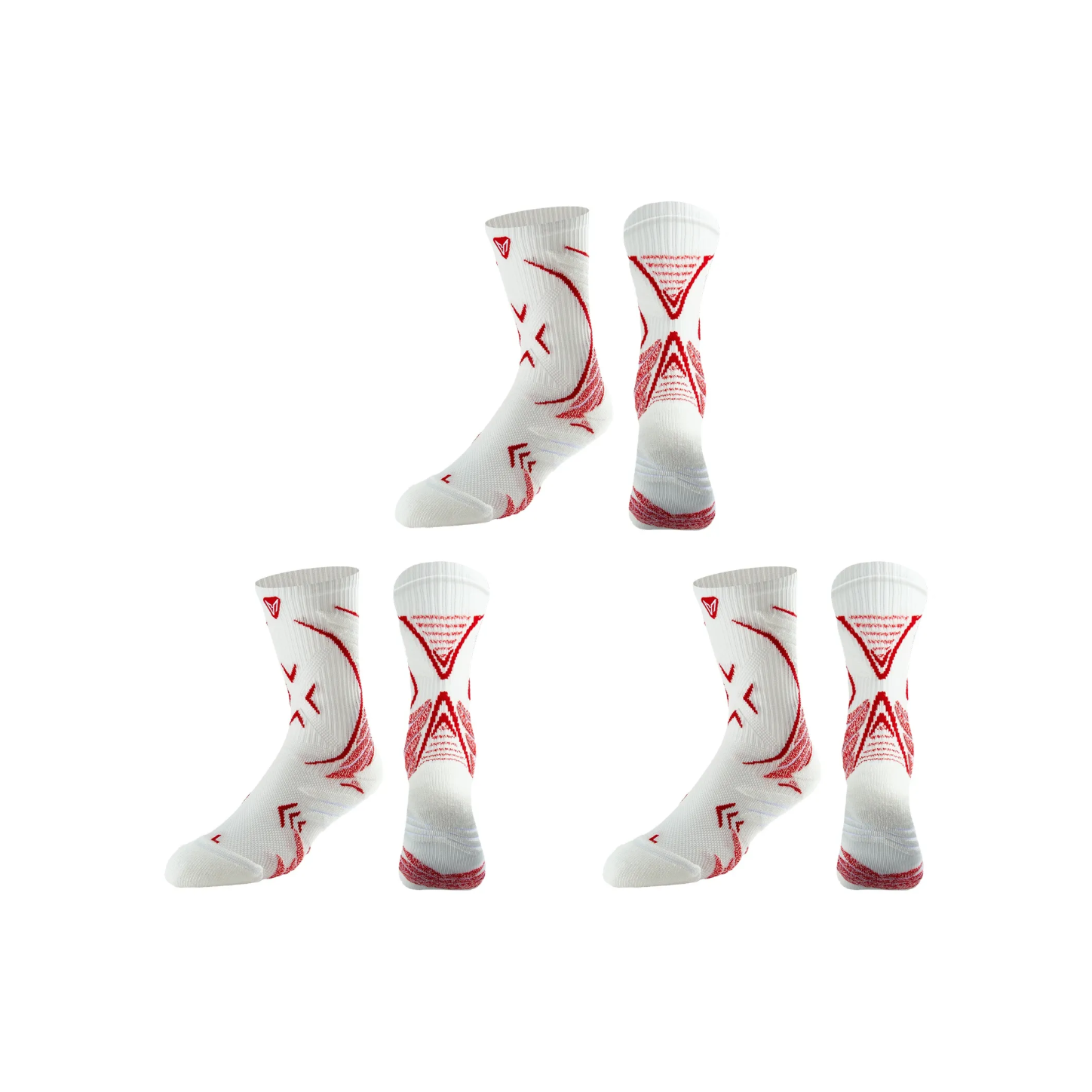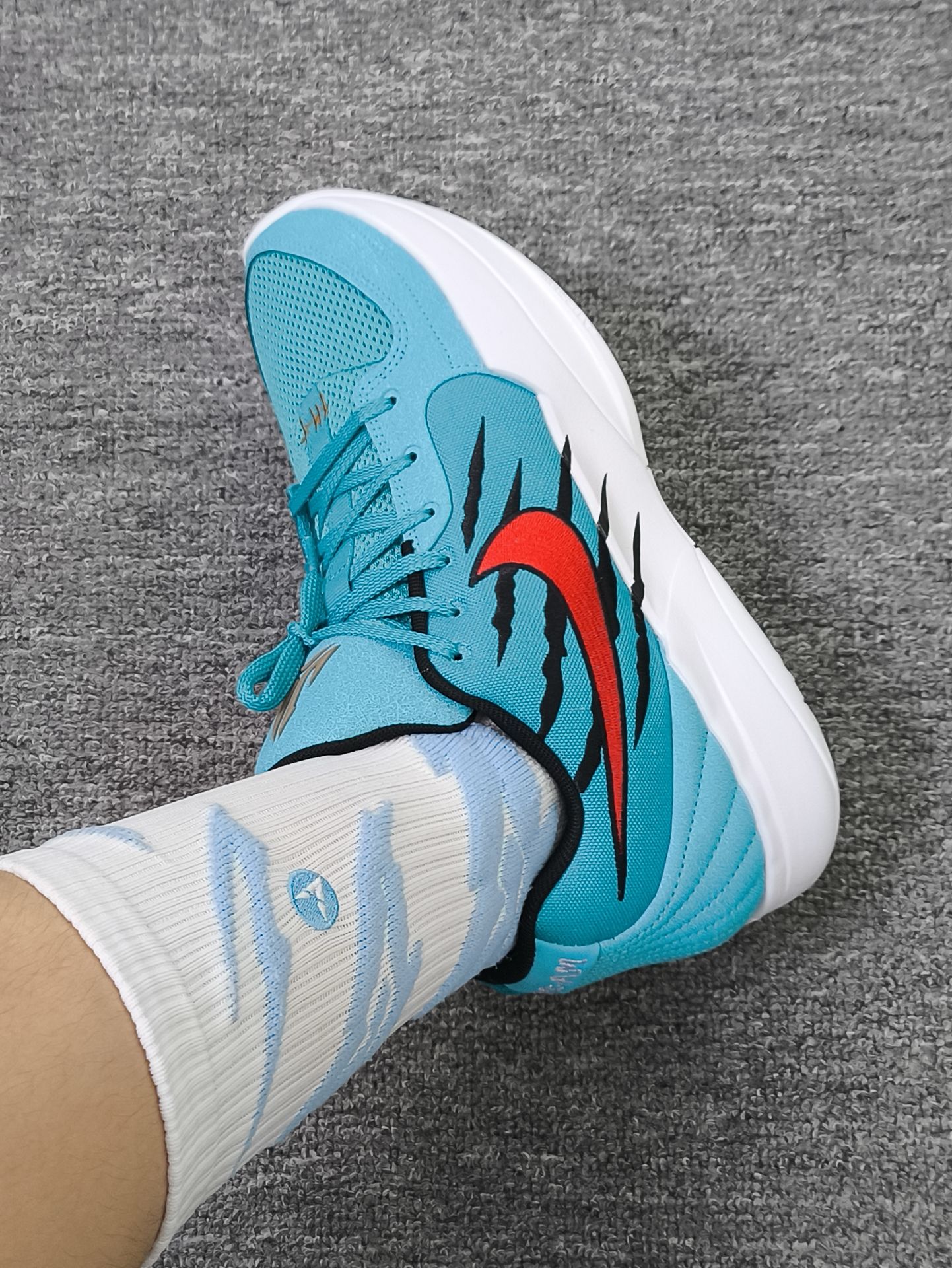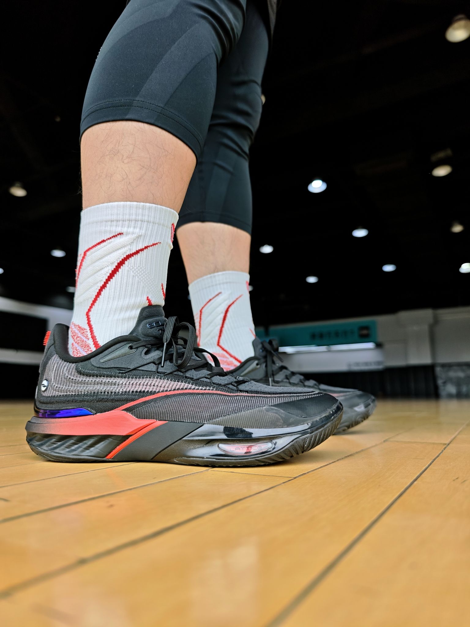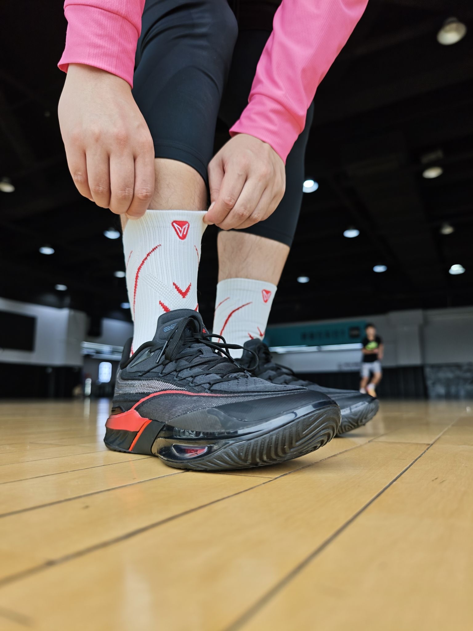这赛博红几何纹太懂穿搭了!搭type2的黑红鞋身,袜身纹路刚好和鞋侧线条呼应,热身时裤脚一撩,脚踝那圈设计直接把“潮酷专业感”焊在腿上,队友都追着问链接😎。 突破变向时脚踝被裹得稳稳的,以前晃脚的隐患直接没了;蹬地发力脚像粘在鞋里,落地时足底缓冲能卸大半震感,打满3小时足弓都不酸💨。 夏天打完球袜子还能保持干爽,袜头裹得舒服不挤脚趾,现在这袜就是我打球的“刚需装备”,没它总觉得少了点能打的底气...