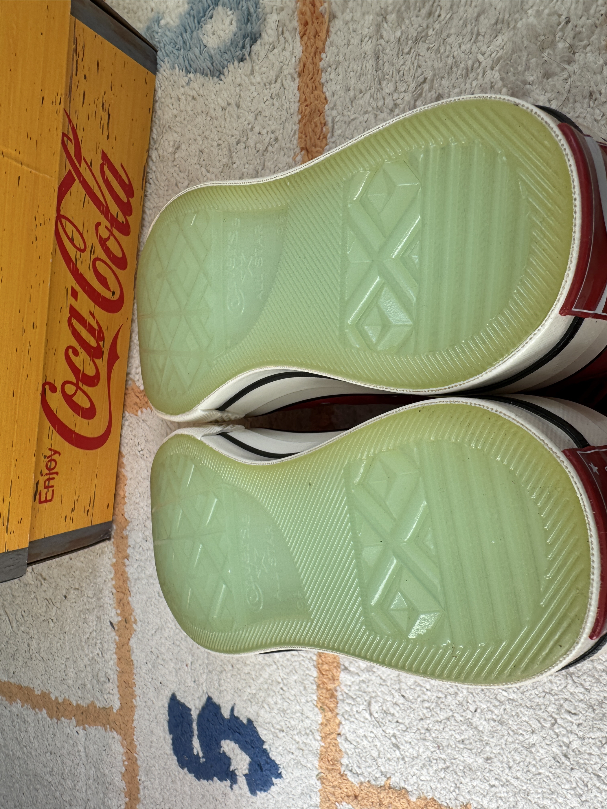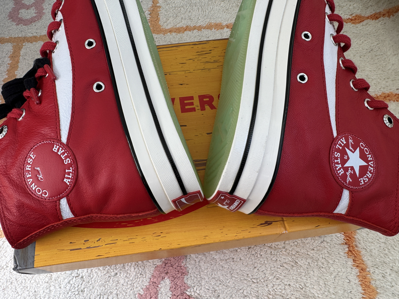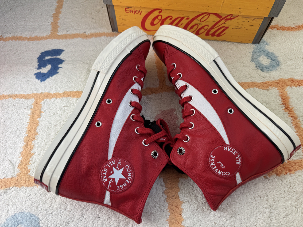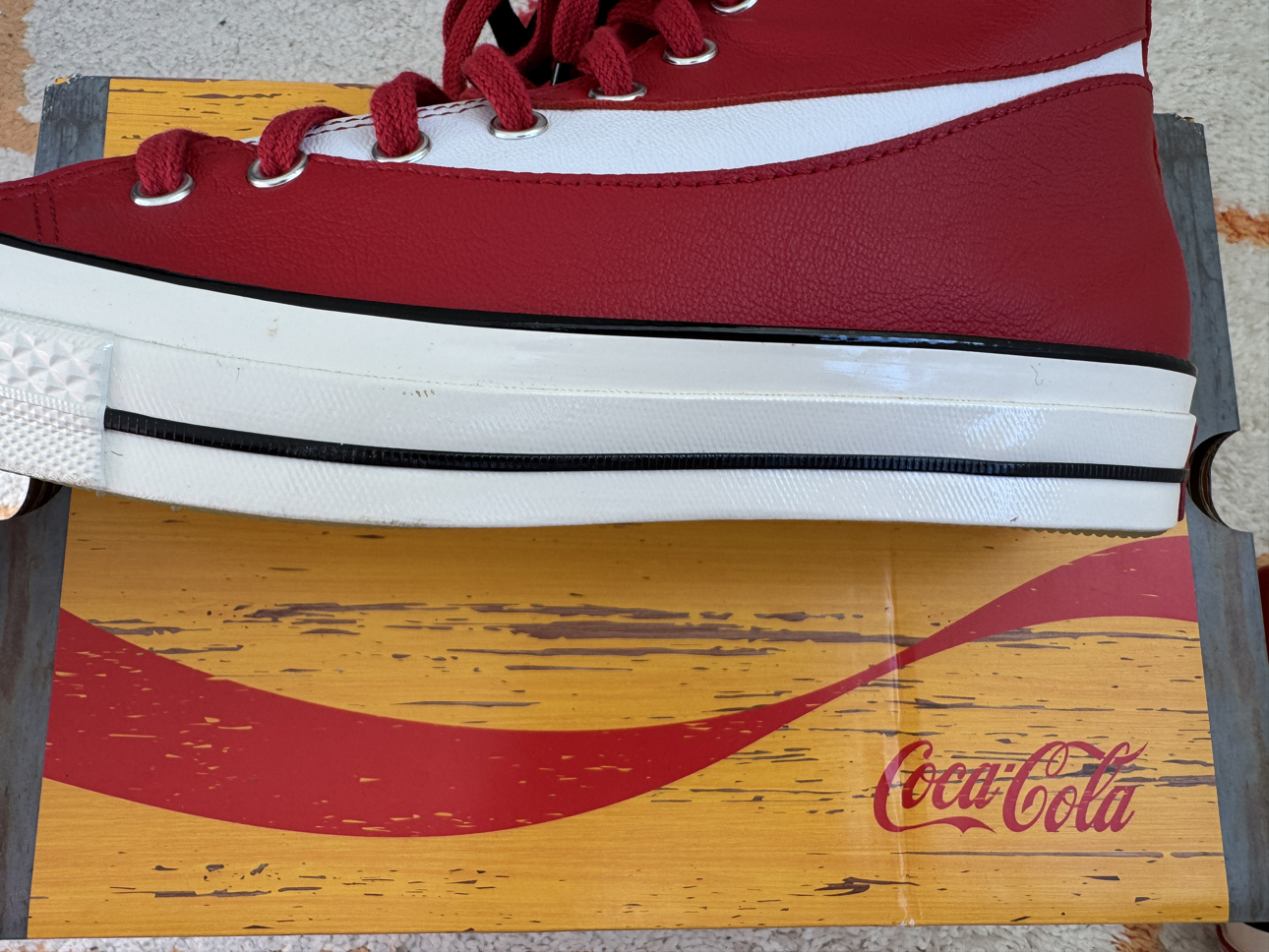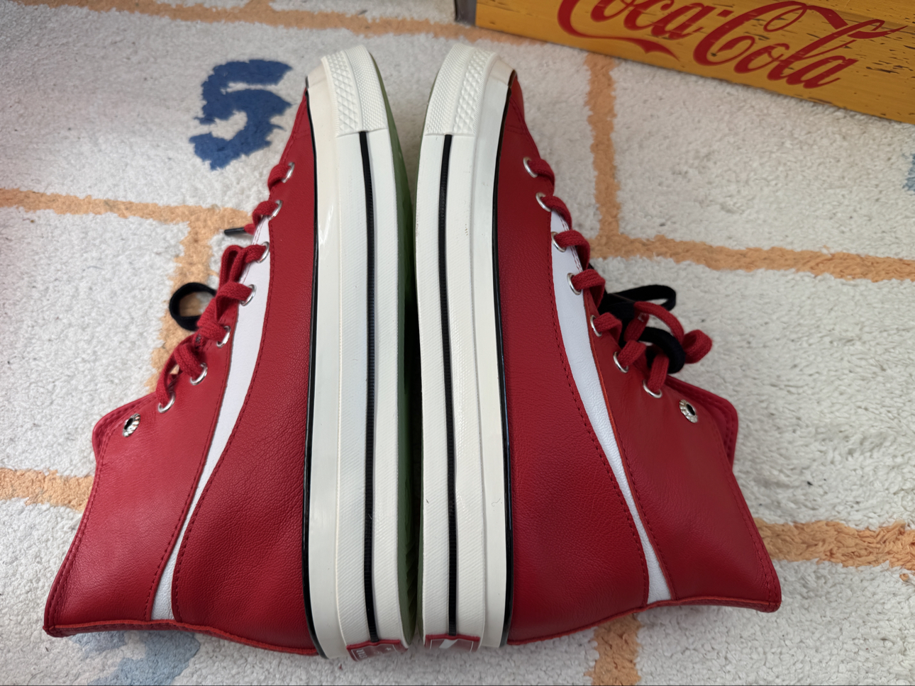 入手最近被吹爆的匡威1970s联名可口可乐红色! 到手实物并没有那么惊艳,明显气儿不足!皮质感还可以,但是穿上会感觉不一般的沉重感,红色搭配也比较难! 水晶大底颜色调的却是很呼应玻璃瓶儿,算是点睛之笔! 陆续黑白灰等配色出炉,上脚应该更好! 另外这波皮质操作完,匡威又迟迟上了帆布材质的同款,这波操作……