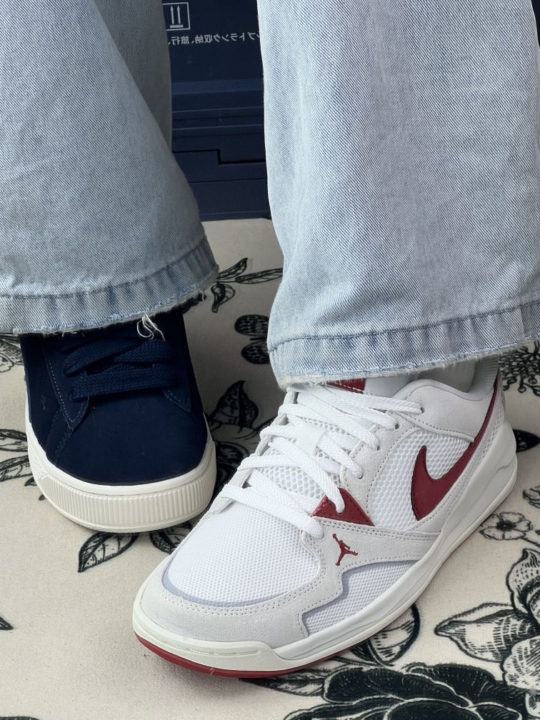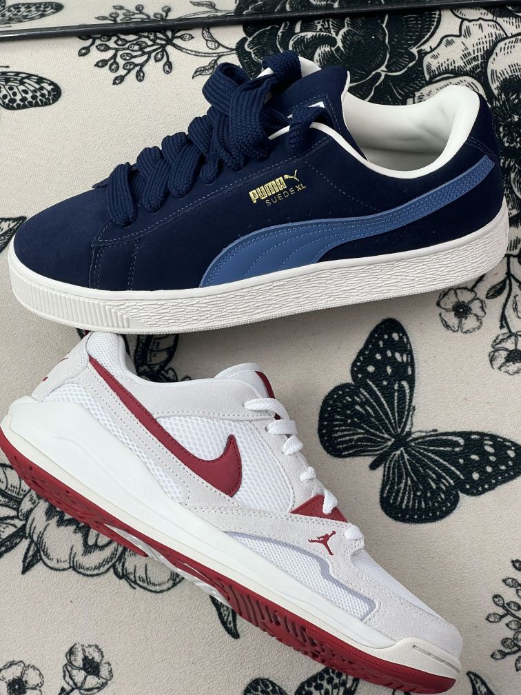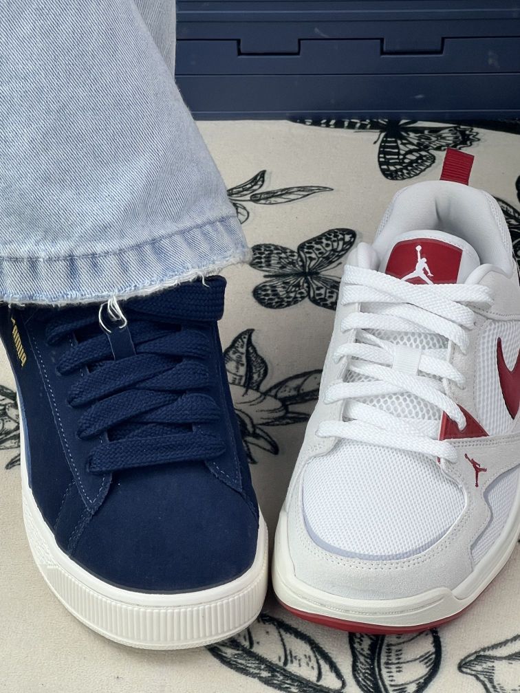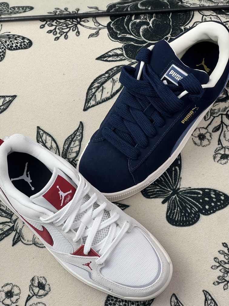 这两双鞋我穿了有一阵子,先说说PUMA Suede。它的翻毛皮质感很舒服,但也真的不耐脏,尤其是这种深蓝色,稍微蹭一下就明显,打理起来有点麻烦。鞋型偏瘦,脚背高的人会觉得有点挤,我第一次穿的时候走久了脚背有点紧。 另一双Jordan鞋,网面透气是真的不错,夏天不闷脚,但鞋底偏硬,长时间走路会有点累。白色鞋面虽然好看,但也容易脏,尤其是红色部分,稍微沾水就有点印子。 两双鞋的尺码都比较准,但Jo...