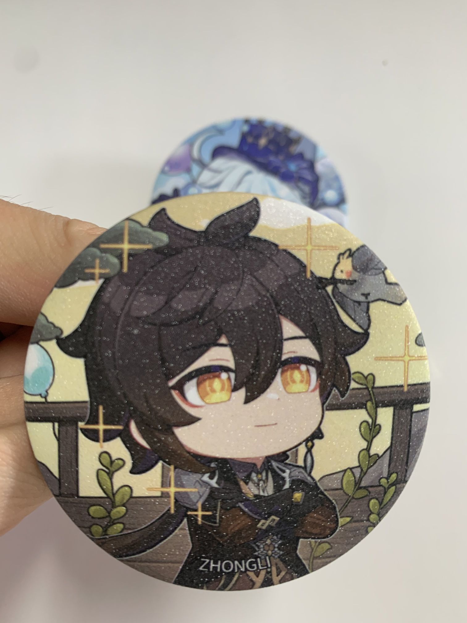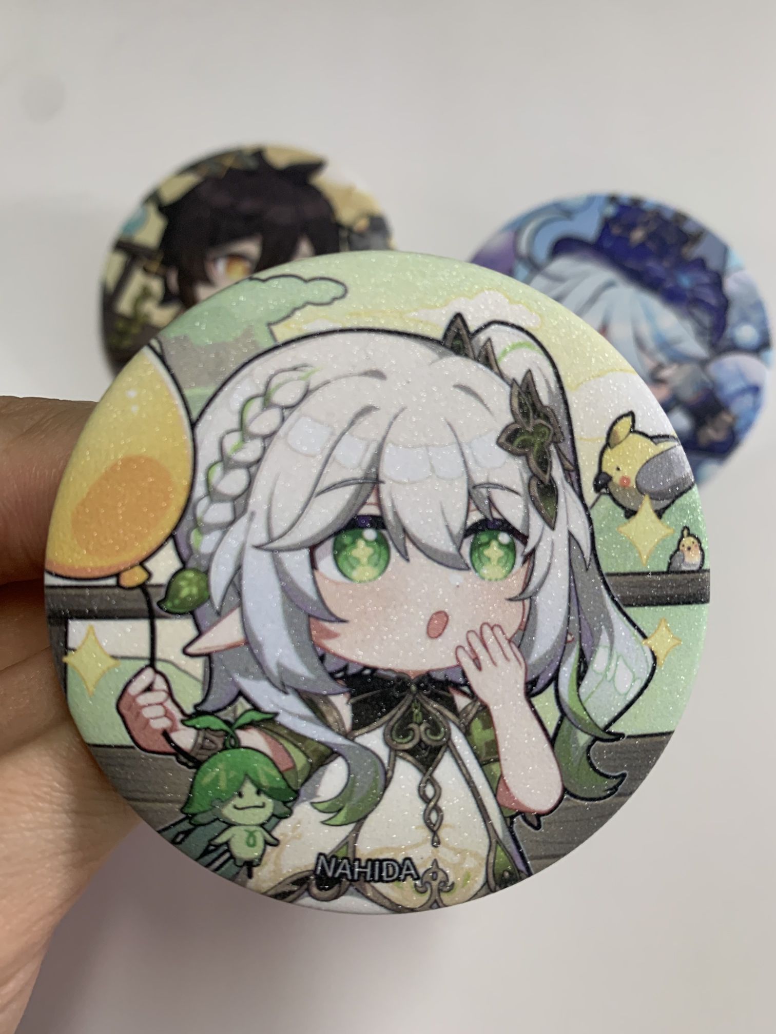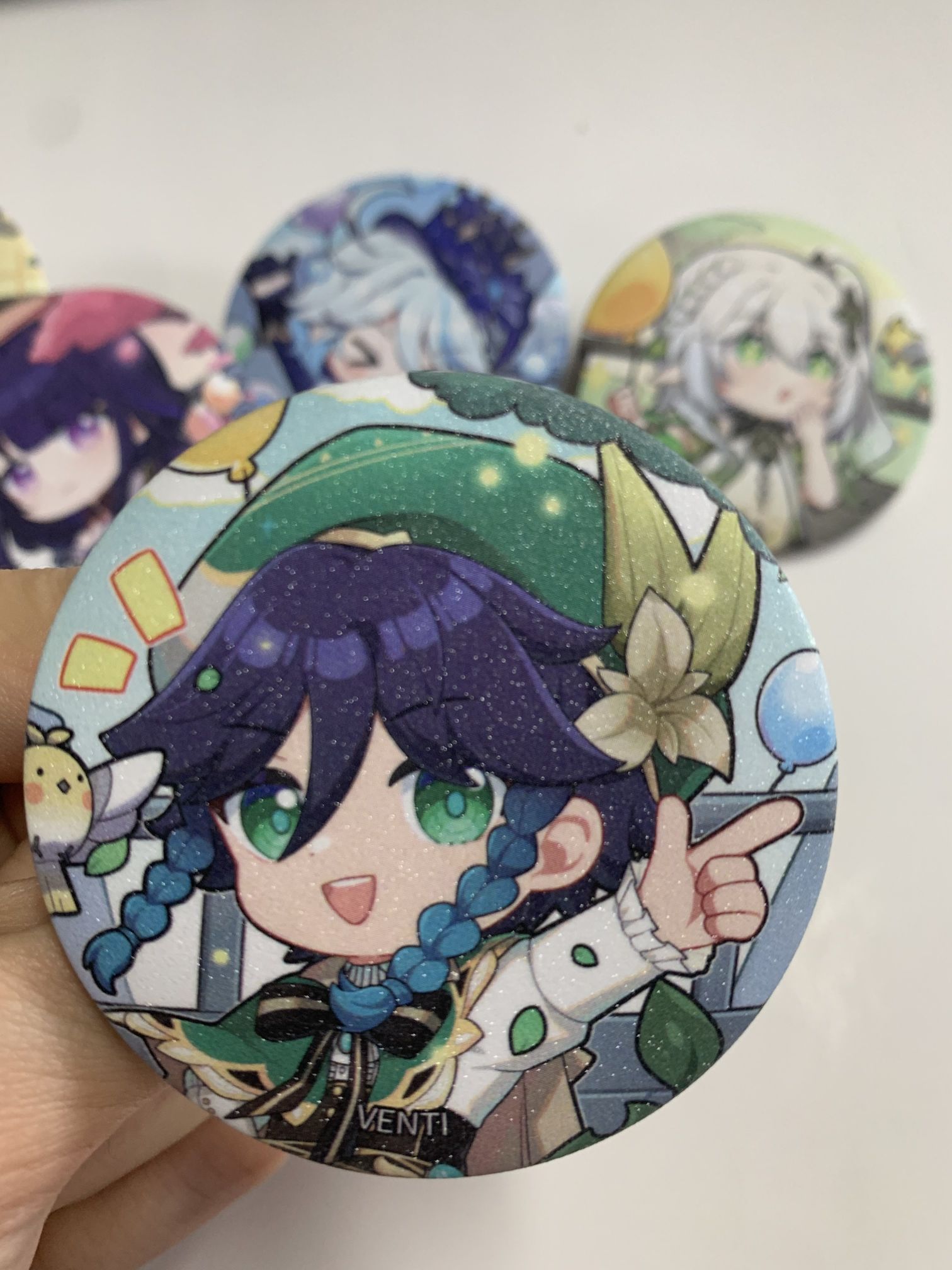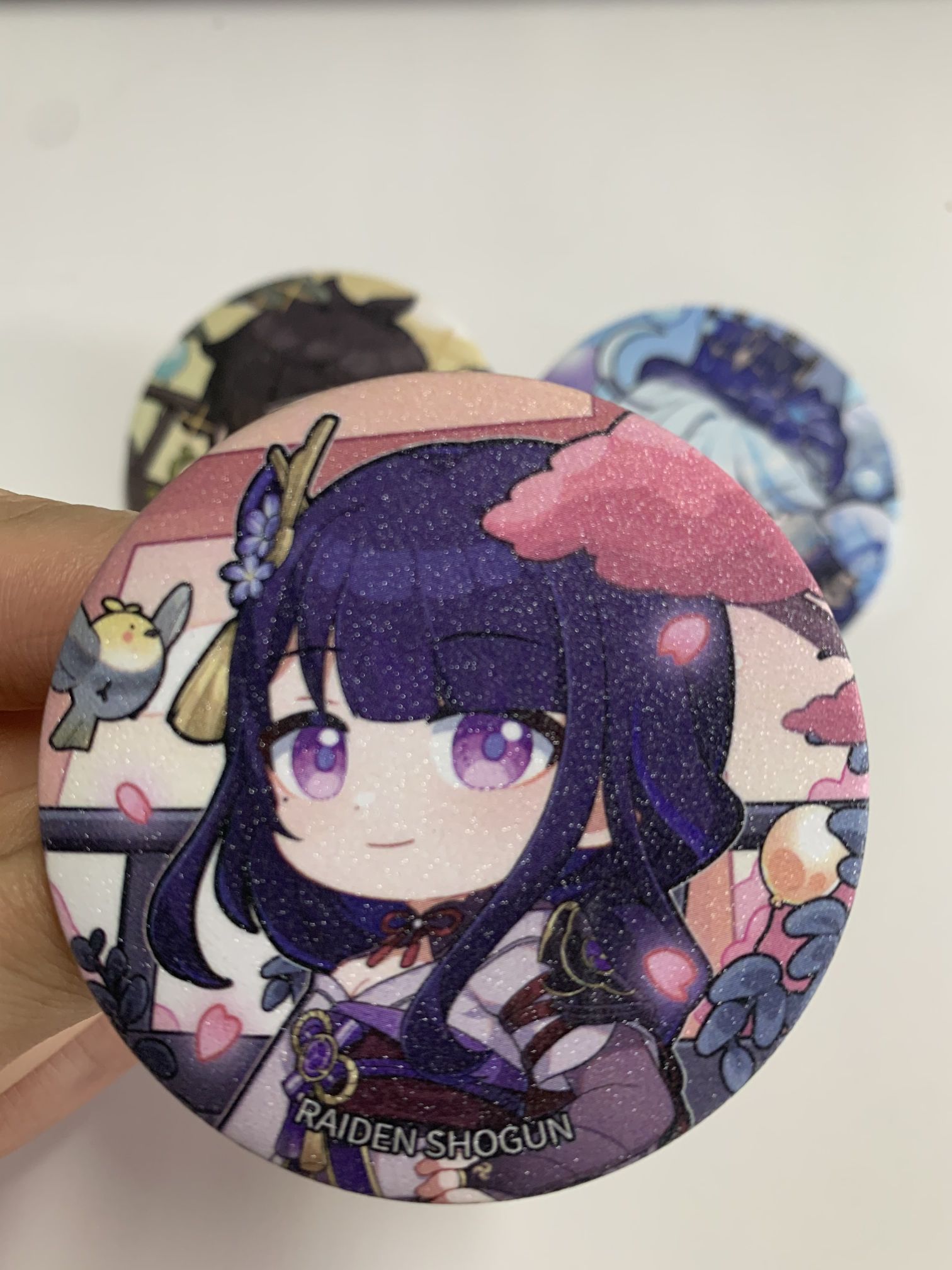 原神Q版角色吧唧盲盒,58mm大小,闪亮镭射效果。有芙宁娜、八重神子、雷电将军。每个徽章都带闪粉,画面清晰精美。