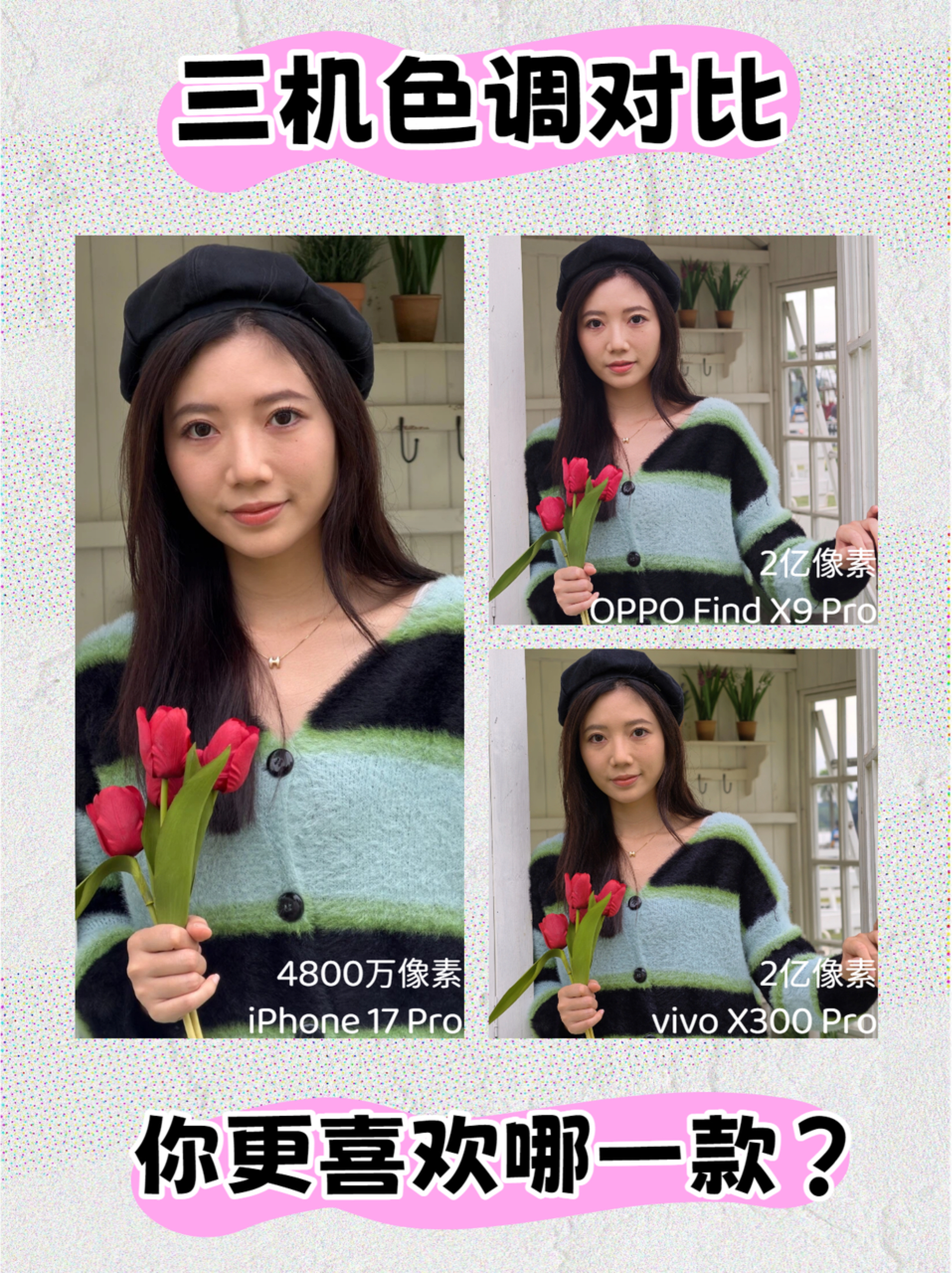 不同的手机镜头下拍出的画面差别有多大—— 这回就掏出了自带2亿像素的OPPO Find X9 Pro和vivo X300 Pro 以及4800万像素的iPhone 17 Pro - 看P2就知道 原来现在的手机已经能把细节拍得这么清楚了!! 这下修图想拉多大就拉多大,完全不怕糊成一团✔ - 而且三款机型的原相机色调也很不同 iPhone 17 Pro偏日常 OPPO Find X9 Pro能把画面...