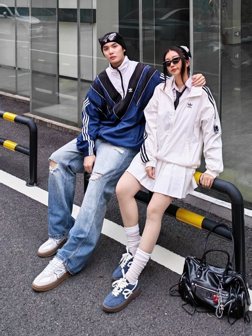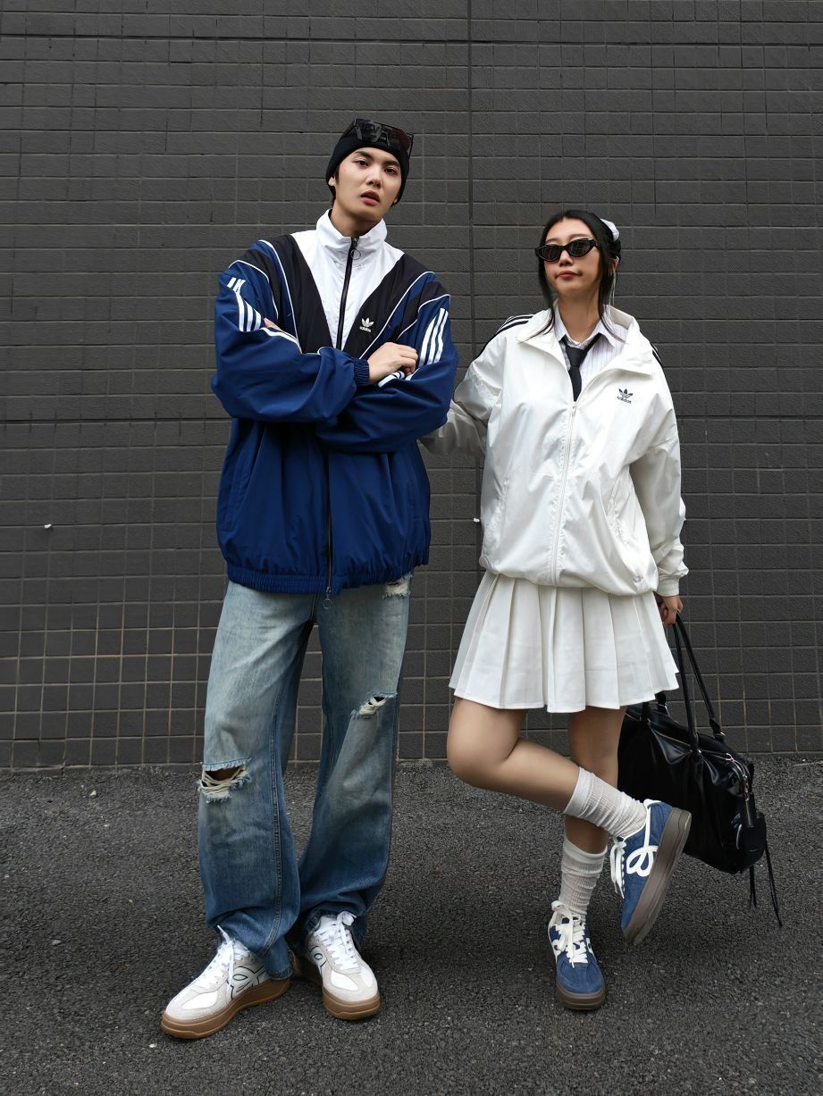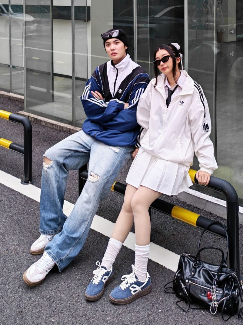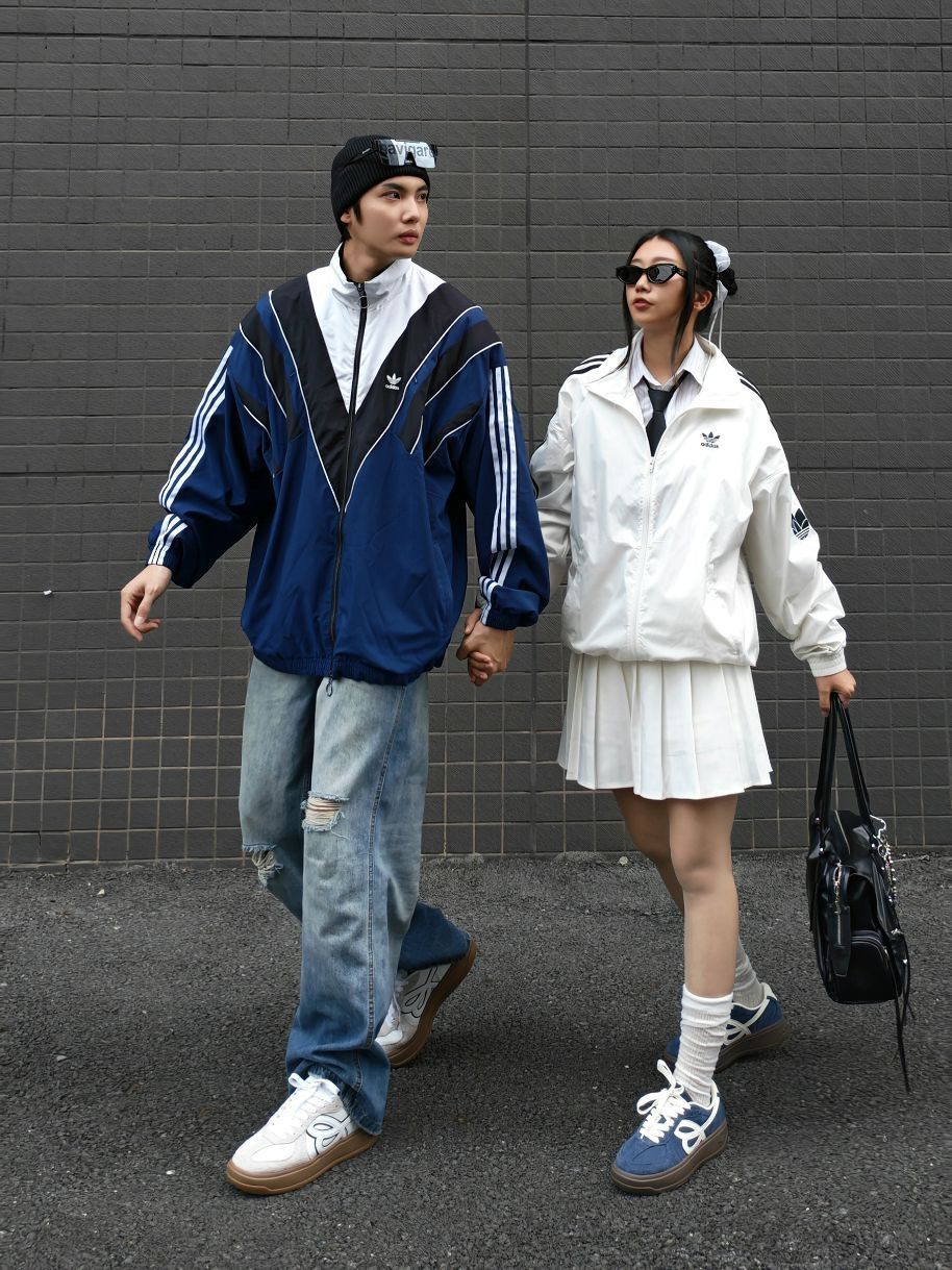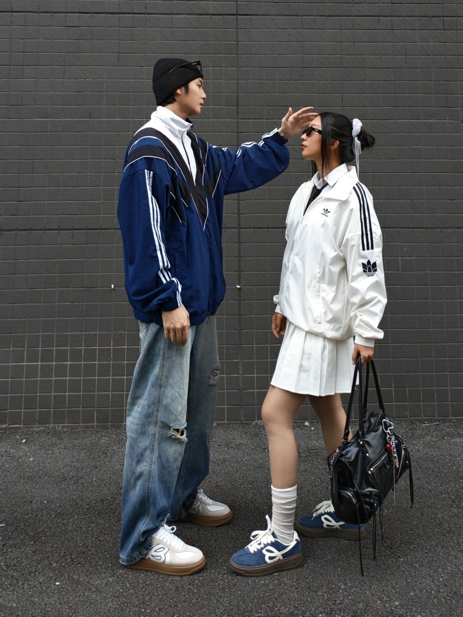 今天跟女朋友出街穿搭分享👩❤️👨 我是蓝白拼色运动夹克外套+破洞牛仔裤,脚穿HAPPY BIRDS DAY 厚底松糕鞋,这套look很有街头感,配上冷帽和眼镜,痞帅痞帅的~ 女朋友白色运动外套+百褶裙,脚穿HAPPY BIRDS DAY 蓝白撞色复古德训鞋,甜酷甜酷的,厚底偷偷增高,小个子表示爱了😻! 蓝色和白色👟搭配在一起敲有CP感,日常通勤上学还是约会穿都舒适百搭呢~