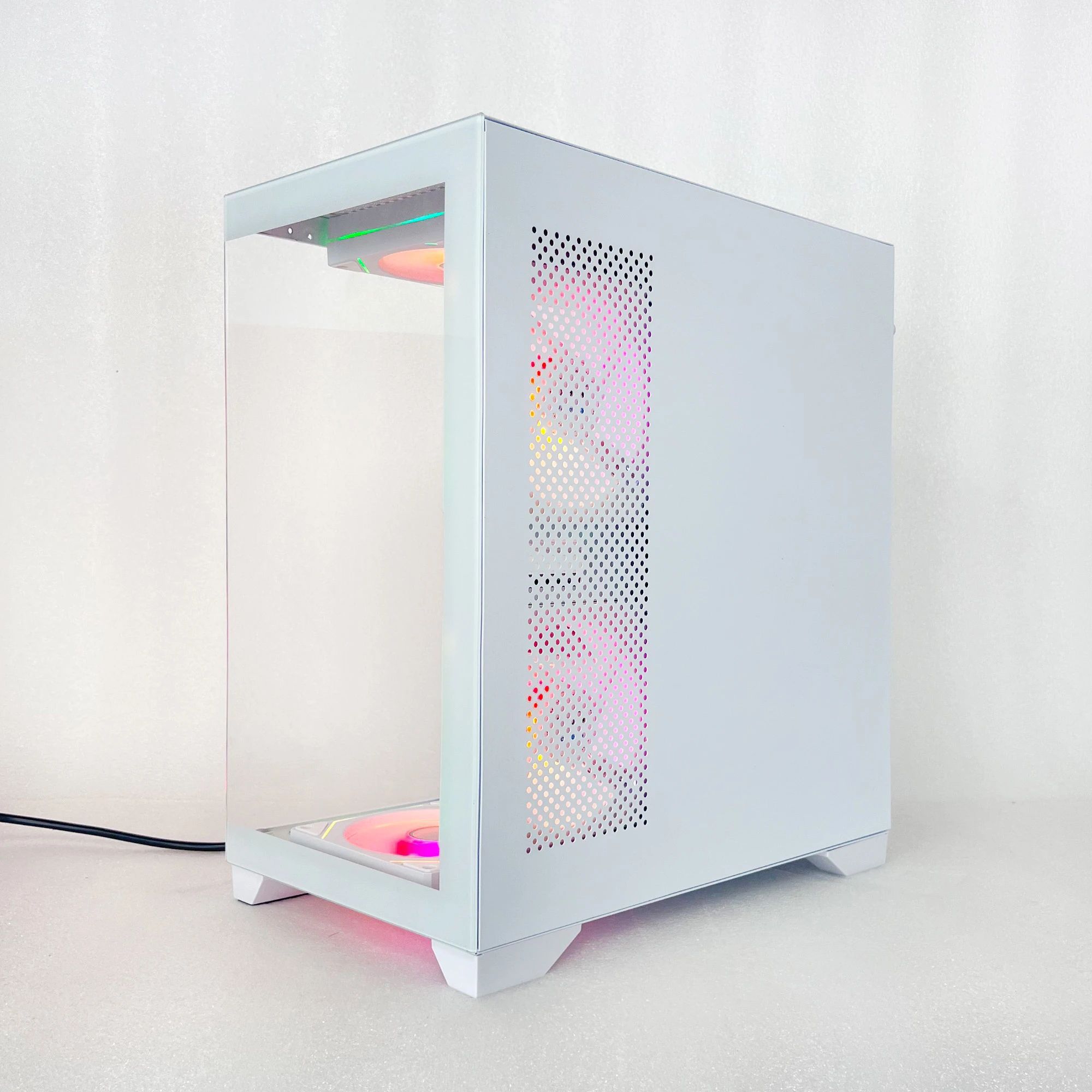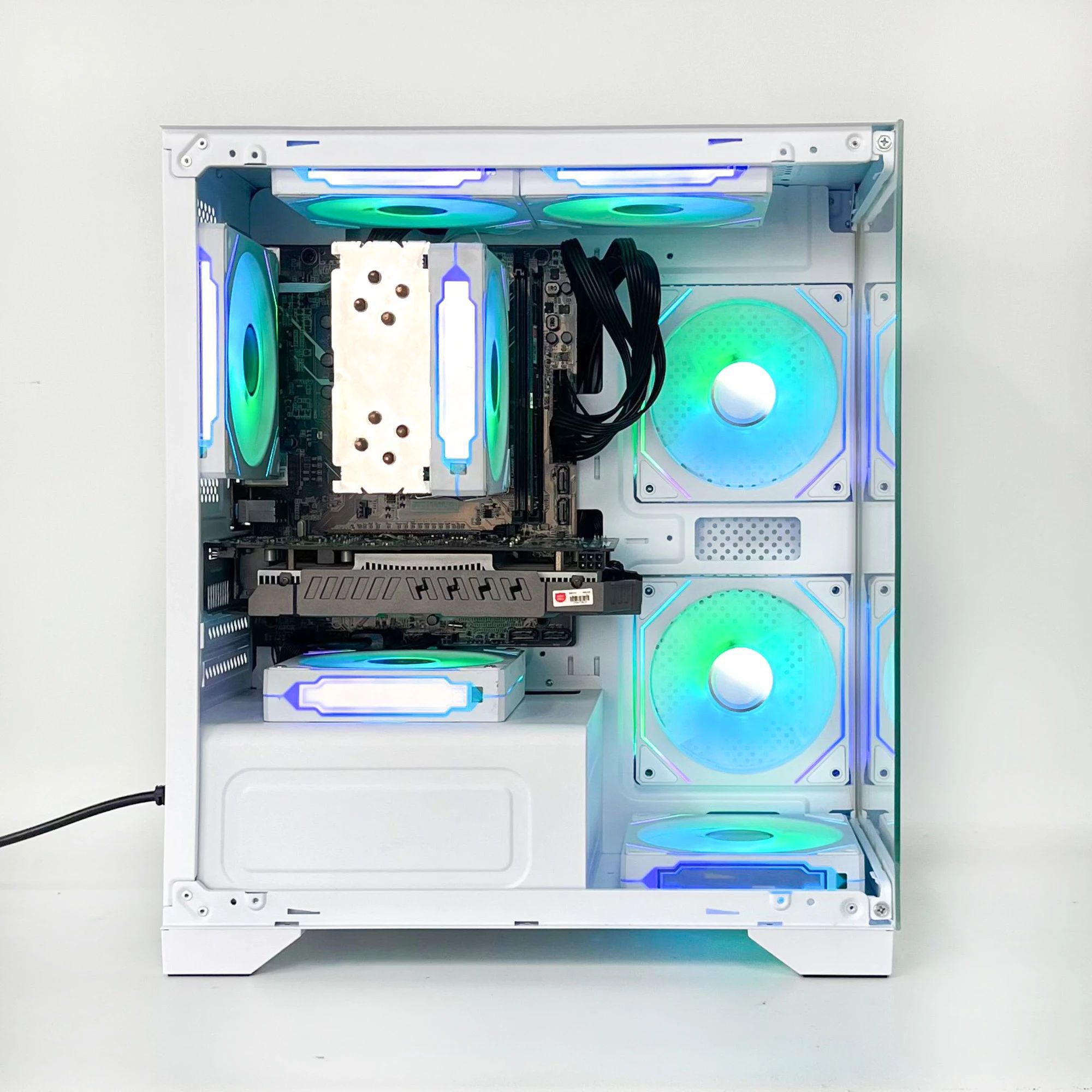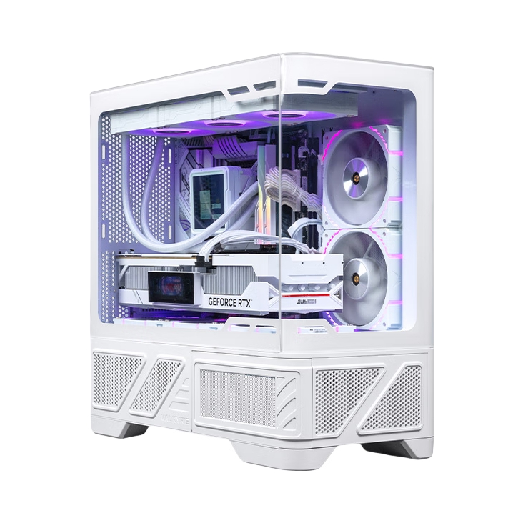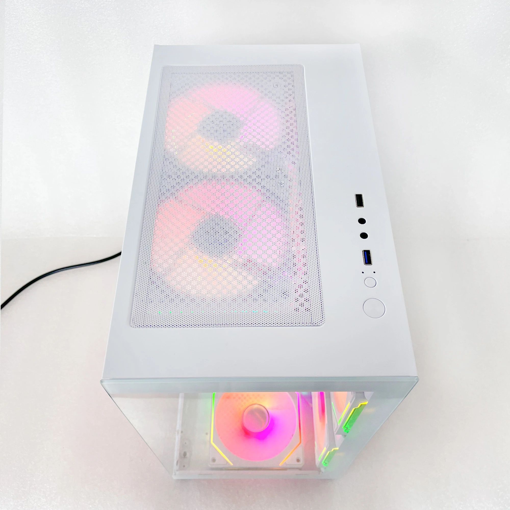 外观贼干净,白透机箱+渐变RGB风扇,摆桌上颜值直接拉满。 配置是十核E5-2680v2+GTX960 2G,16G内存+256G固态,办公多开、玩个《LOL》《CF》啥的都流畅,7把风扇散热够够的,电源也是3C认证的600W。