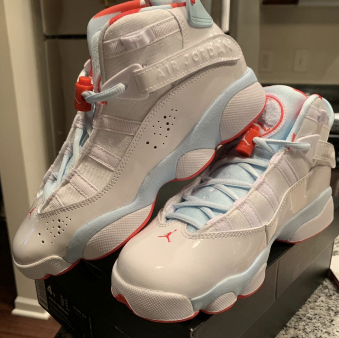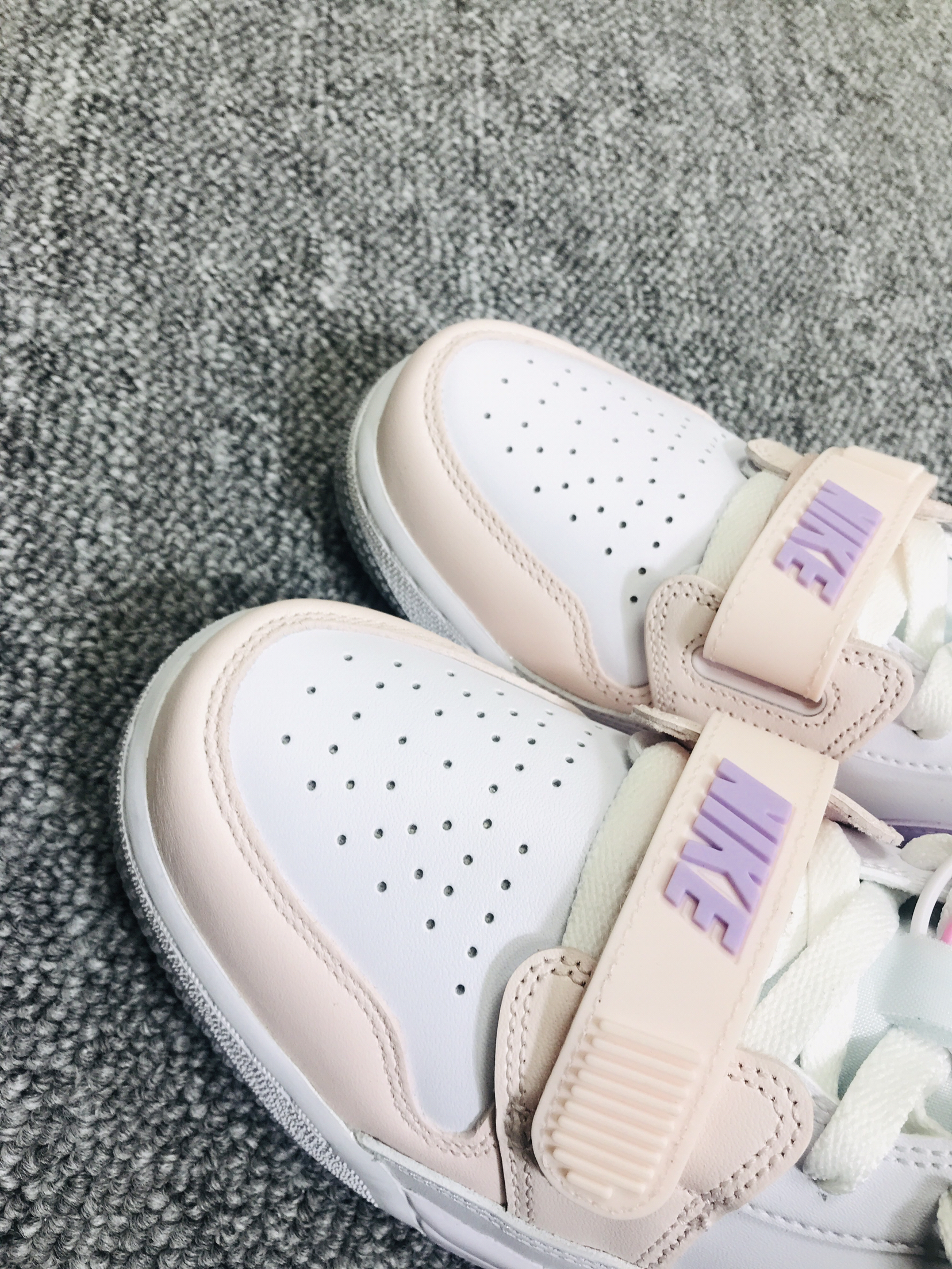耐克AJ312粉紫,学生党的冬日穿搭 上脚挺舒服的,就说鞋底有点硬 白色部分容易脏,颜值没话说