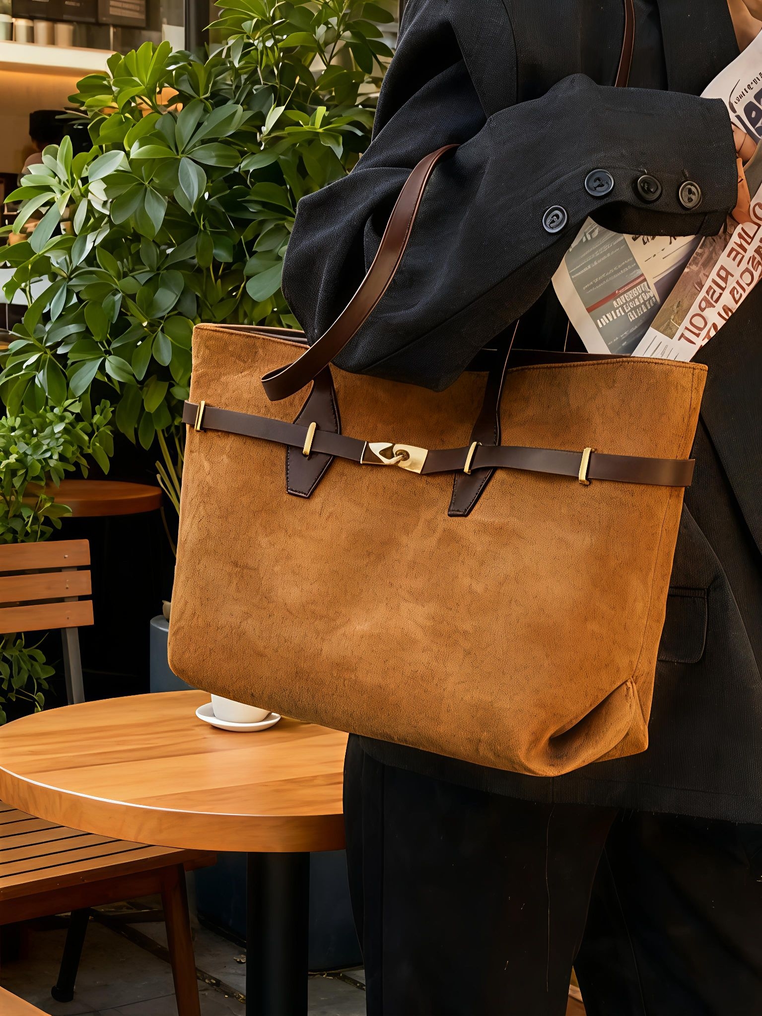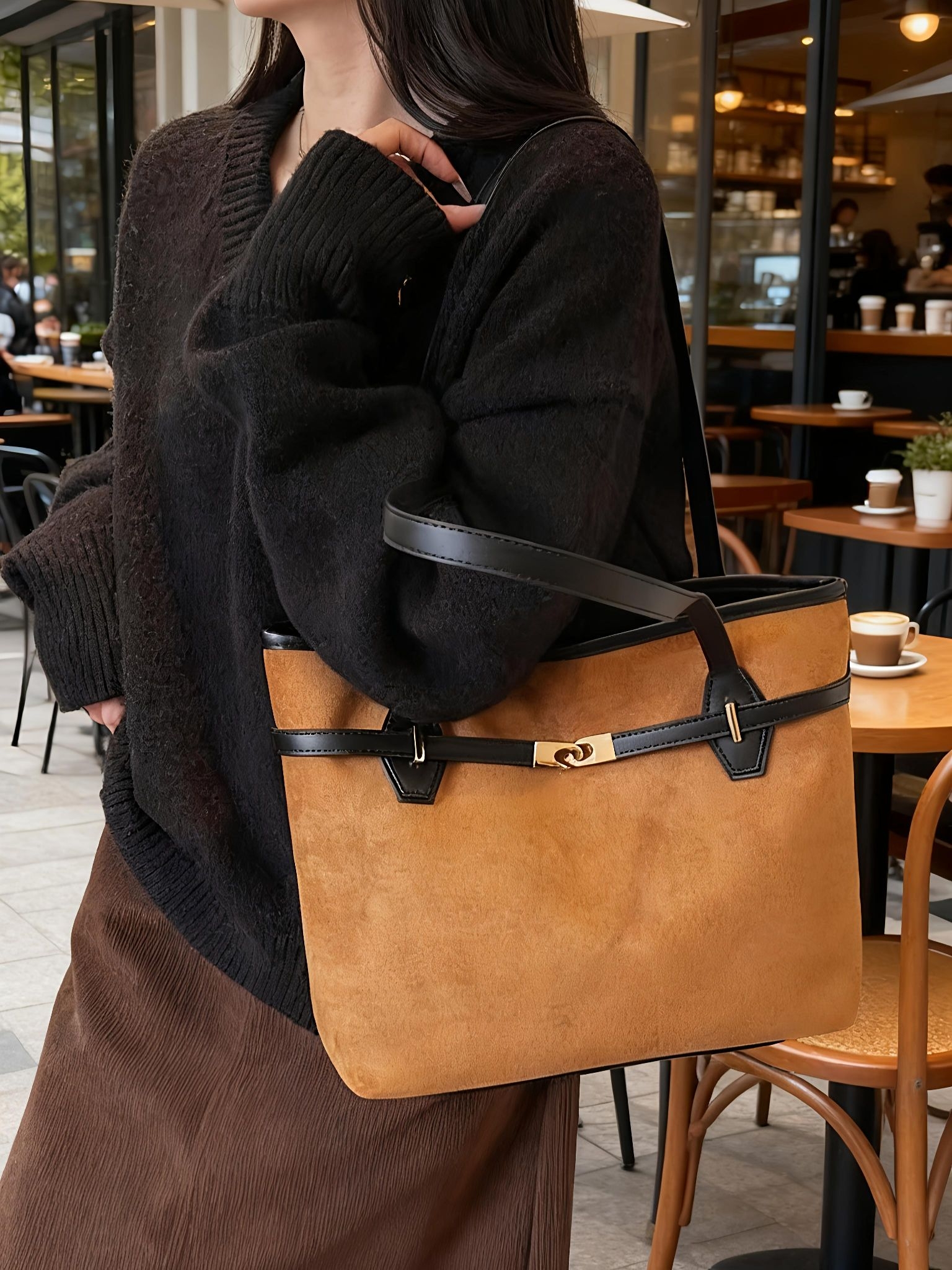谁懂啊家人们一入秋就被这款小CK托特包锁住审美! 暖棕麂皮质感高级到犯规,金属扣设计又A又飒容量大到能装下笔记本、雨伞和补妆全套配oversize西装是清冷职场姐姐,搭毛衣牛仔裤又成休闲氛围感美女秋冬背它出门,回头率直接拉满100咱就是说,这包请锁死在我的秋冬搭配清单里!