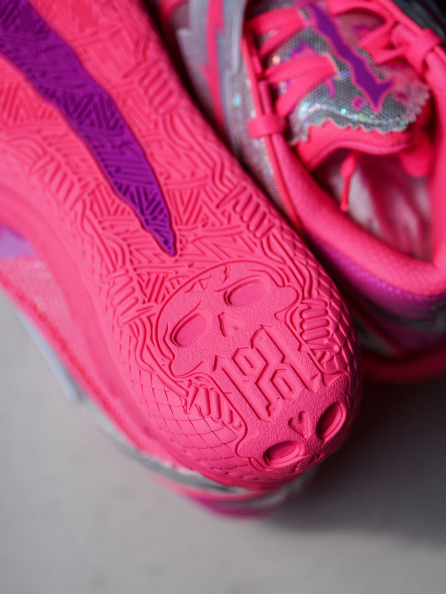 球场即是舞台。当拉梅洛·鲍尔(LaMelo Ball)的签名战靴MB.05 World Tour一亮相,仿佛让人见到了一件天赋具象化的艺术品。 鞋身幻彩立体铁丝网纹理绝非普通装饰,它直接汲取自拉梅洛身上的刺青图案,光影流转间仿佛将三球的态度移植于鞋面。反复出现的“1”数字暗藏玄机,既是球衣背号,更宣示着“1-of-1”的不可复制性。就像三球的球场创造力,永远拒绝模板化。外底立体骷髅雕刻则需要翻...