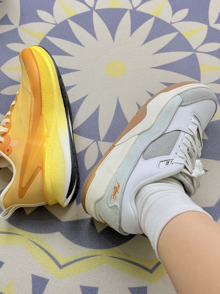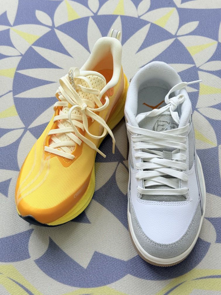 左边李宁赤兔8pro的黄橙渐变很亮眼,针织鞋面透气,夏天穿脚不容易闷,中底软弹感明显,短距离跑步脚感挺舒服;右边Jordan这双灰白款是皮质+帆布拼接,质感柔和,配浅色系穿搭很干净😊 不过小缺点也有:赤兔8pro的针织面容易勾丝,穿的时候得避开尖锐物品;Jordan的帆布部分沾了污渍不好擦,得用软毛刷轻打理。脚感上,赤兔8pro的中底偏软,长时间快走脚踝会有点没支撑;Jordan的鞋底稍硬,逛...