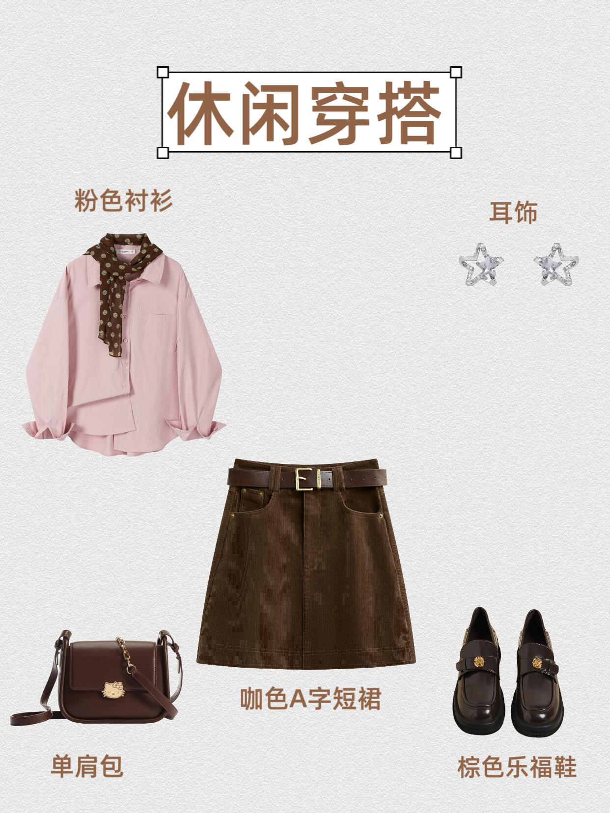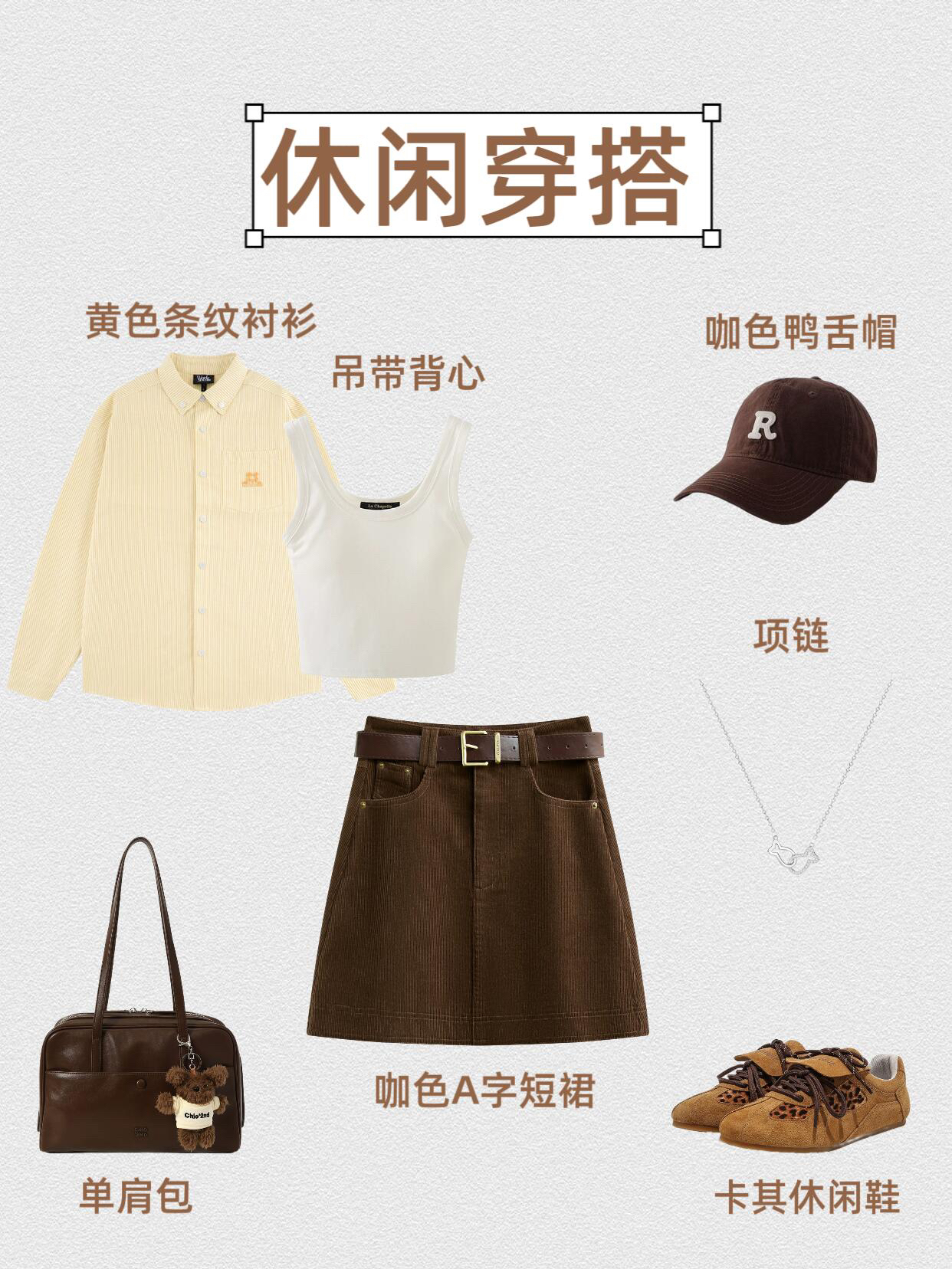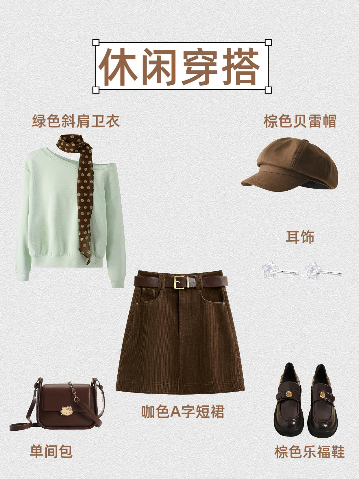 第1⃣套:甜酷小性感风 绿色斜肩卫衣+咖色A字短裙+棕色贝雷帽+棕色乐福鞋+单间包+星星耳饰 第2⃣套:温柔知性风 粉色衬衫+咖色A字短裙+棕色乐福鞋+单肩包+星星耳饰 第3⃣套:复古休闲风 黄色条纹衬衫+吊带背心+咖色A字短裙+咖色鸭舌帽+卡其休闲鞋+单肩包+小鸟项链 第4⃣套:温婉气质风 杏色针织开衫+修身白T+咖色A字短裙+棕色乐福鞋+单肩包+珍珠耳饰+简约项链 第5⃣套:酷...