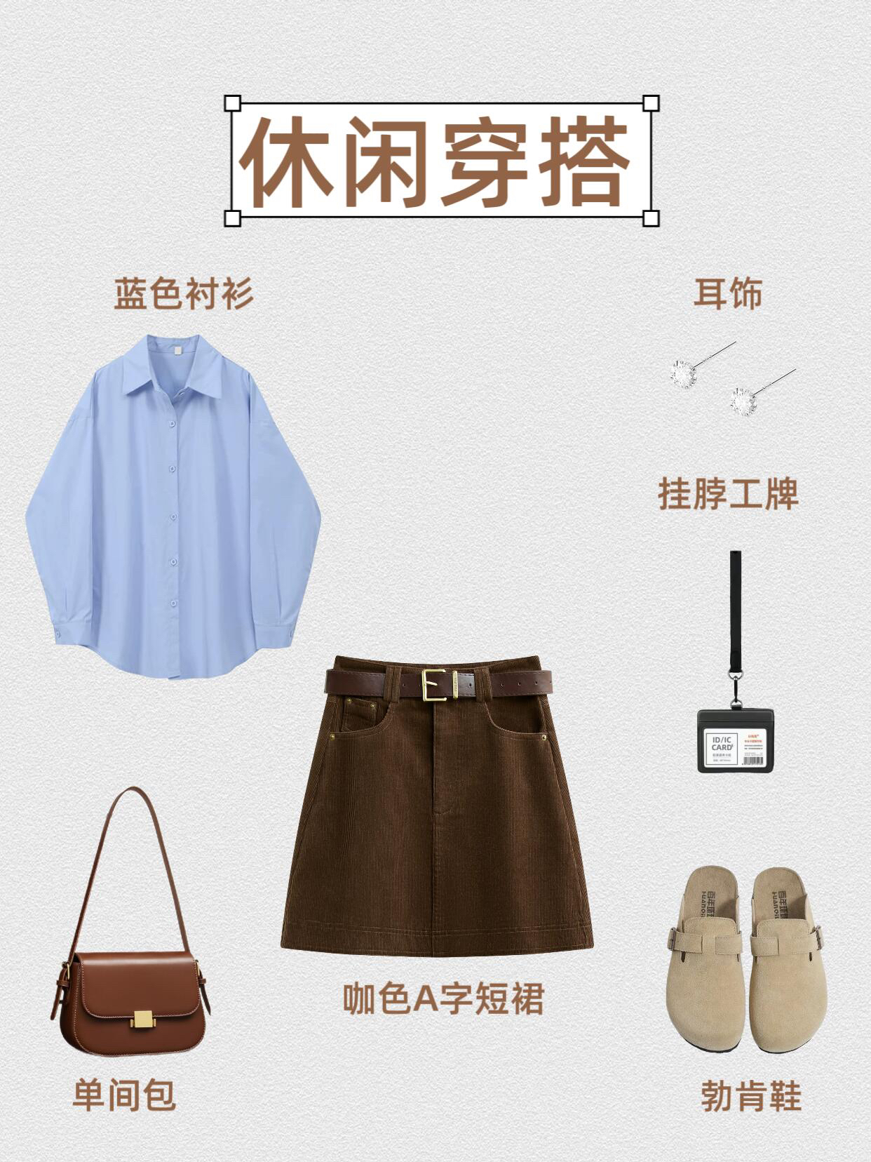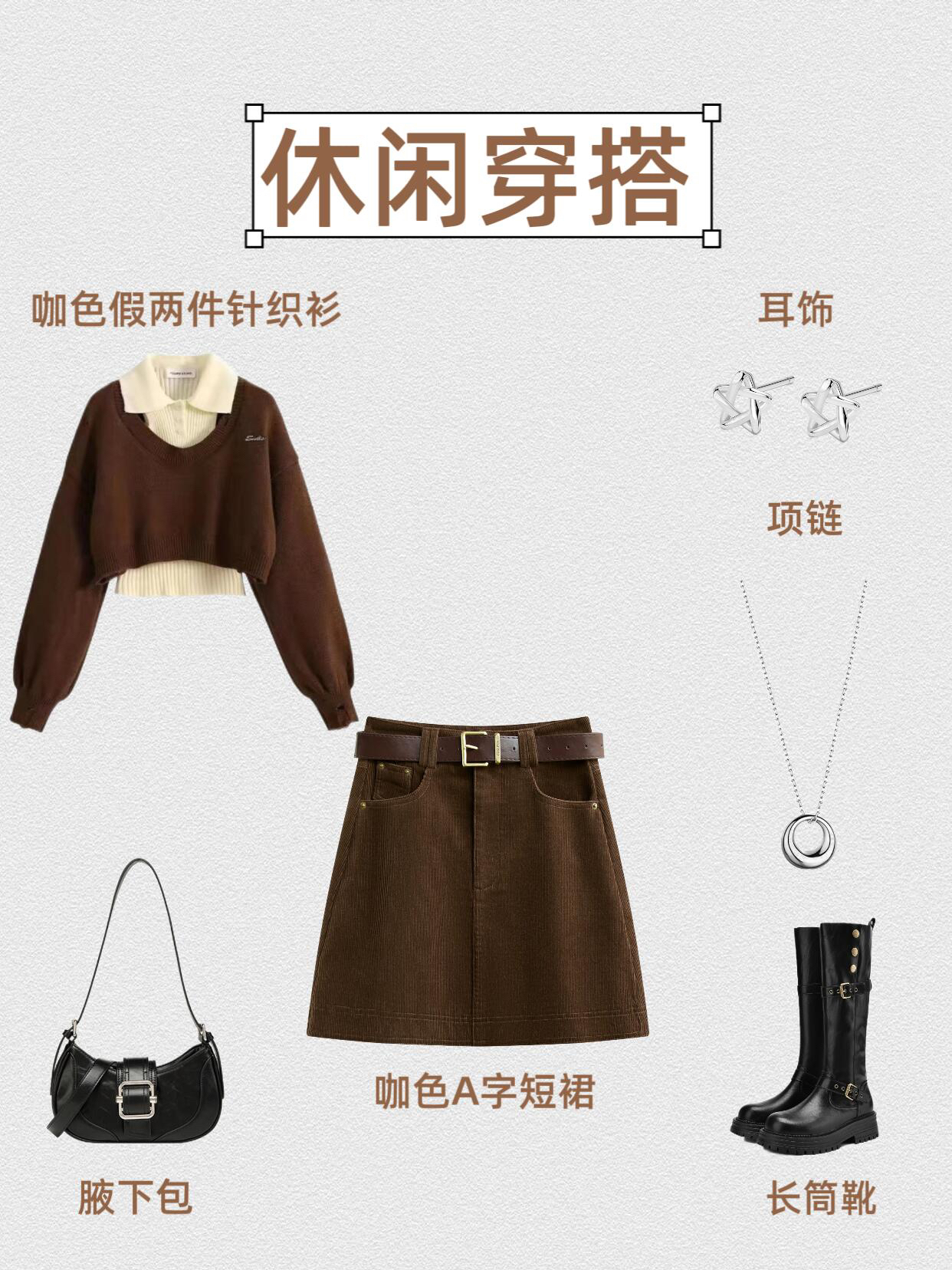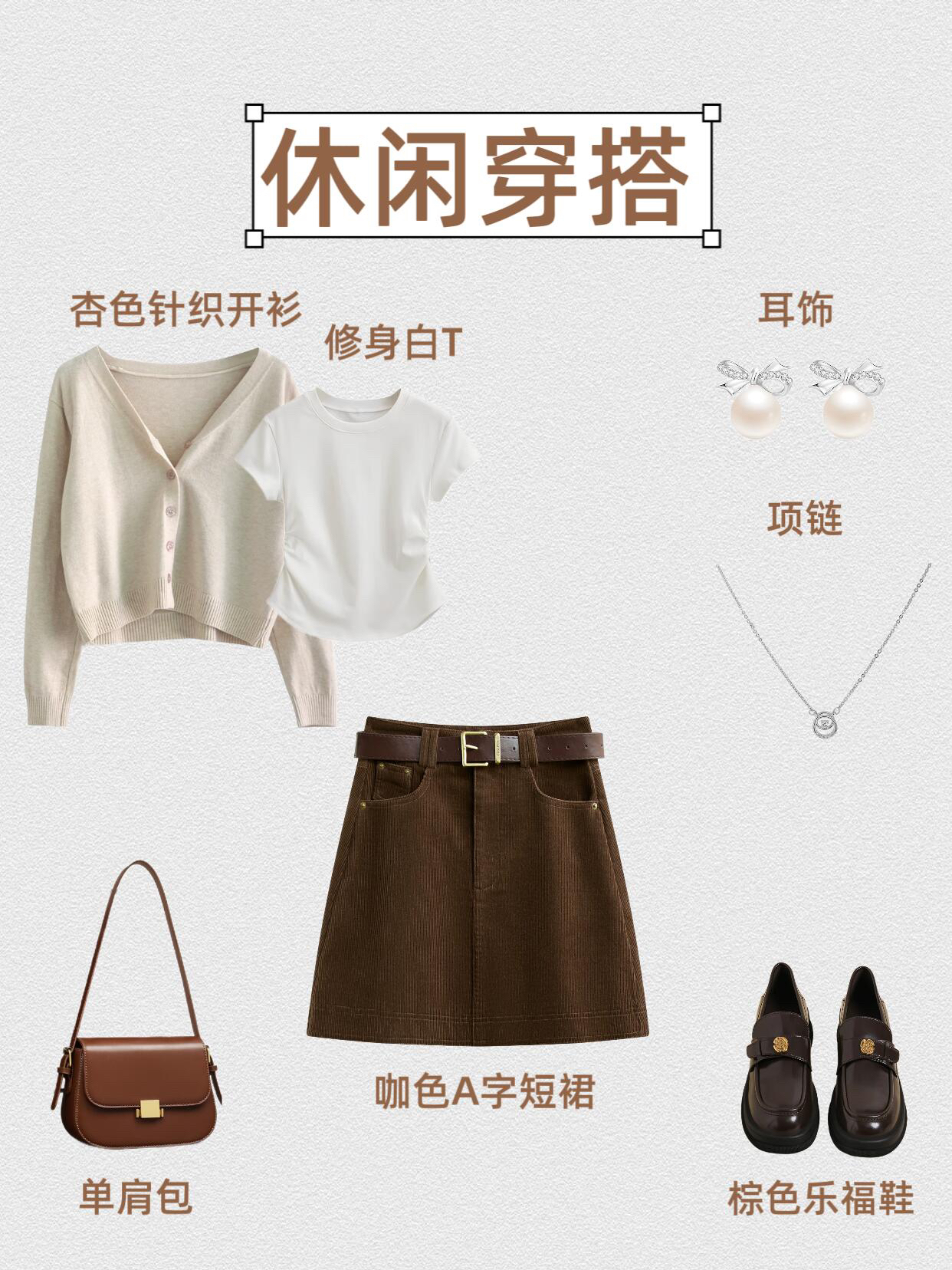 第1⃣套:甜酷小性感风 绿色斜肩卫衣+咖色A字短裙+棕色贝雷帽+棕色乐福鞋+单间包+星星耳饰 第2⃣套:温柔知性风 粉色衬衫+咖色A字短裙+棕色乐福鞋+单肩包+星星耳饰 第3⃣套:复古休闲风 黄色条纹衬衫+吊带背心+咖色A字短裙+咖色鸭舌帽+卡其休闲鞋+单肩包+小鸟项链 第4⃣套:温婉气质风 杏色针织开衫+修身白T+咖色A字短裙+棕色乐福鞋+单肩包+珍珠耳饰+简约项链 第5⃣套:酷...