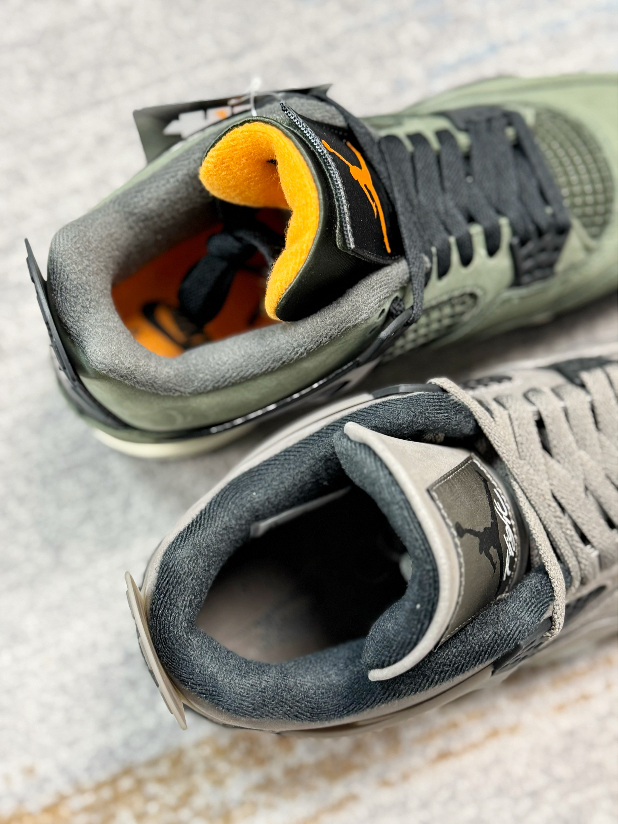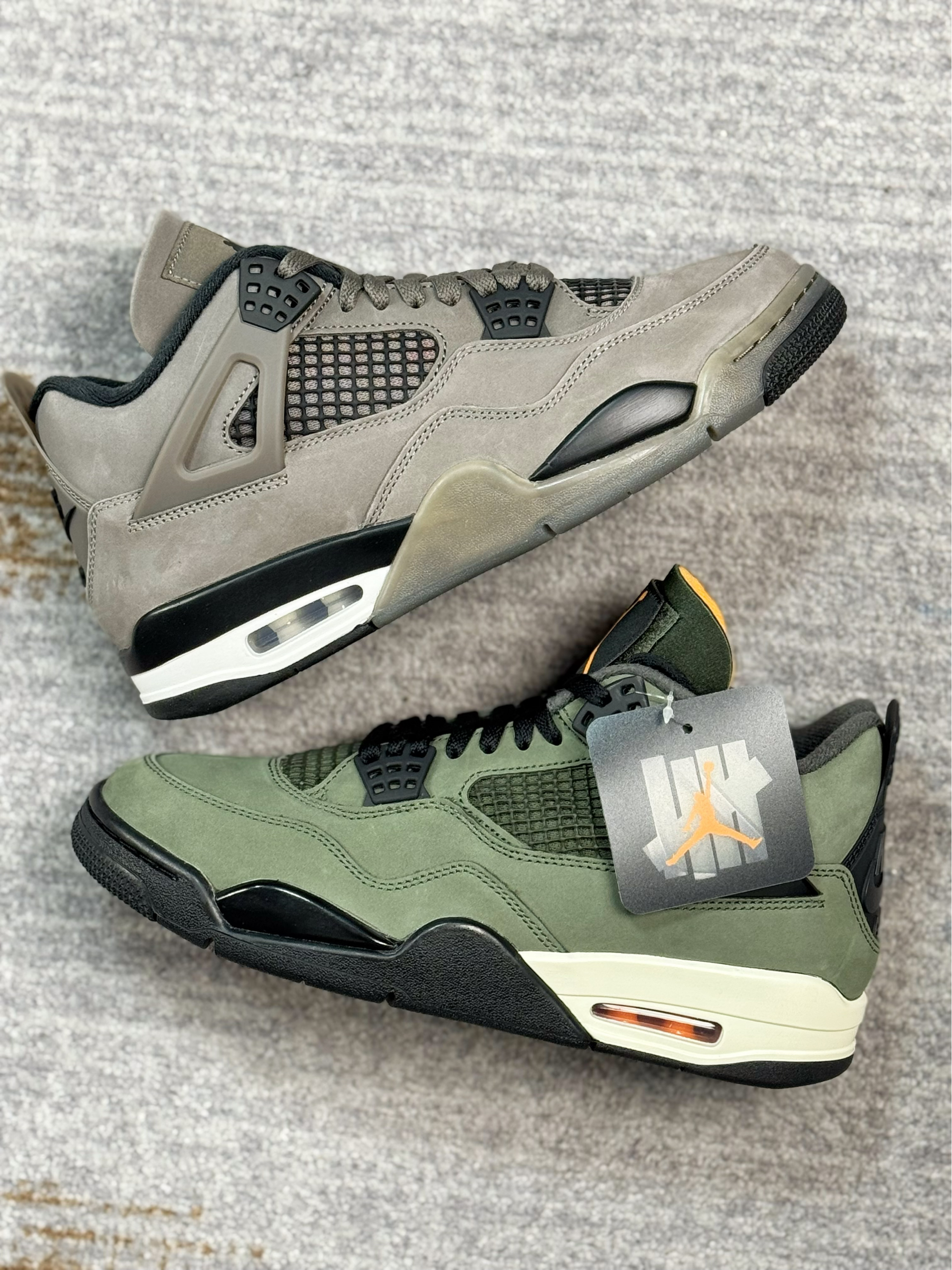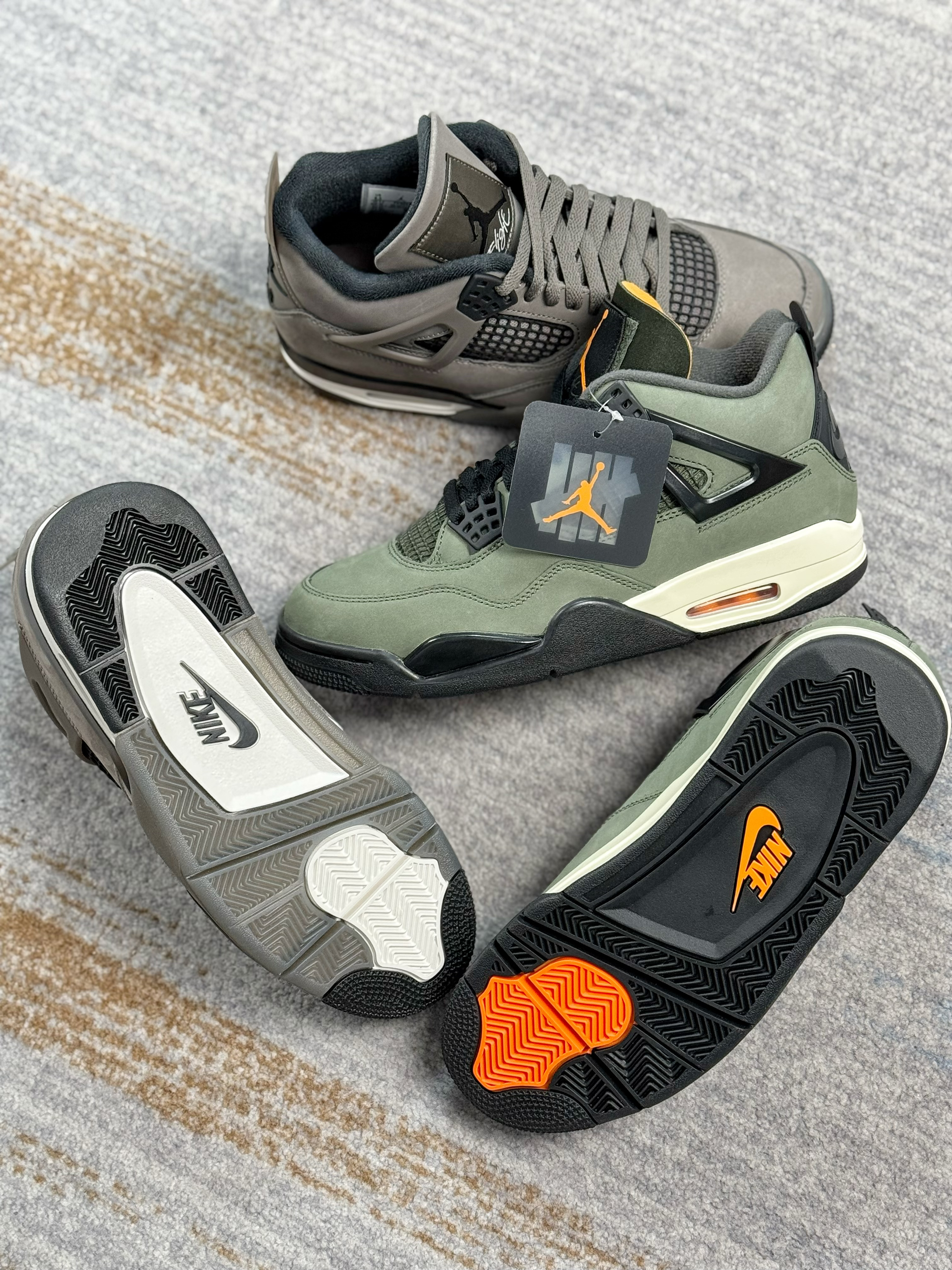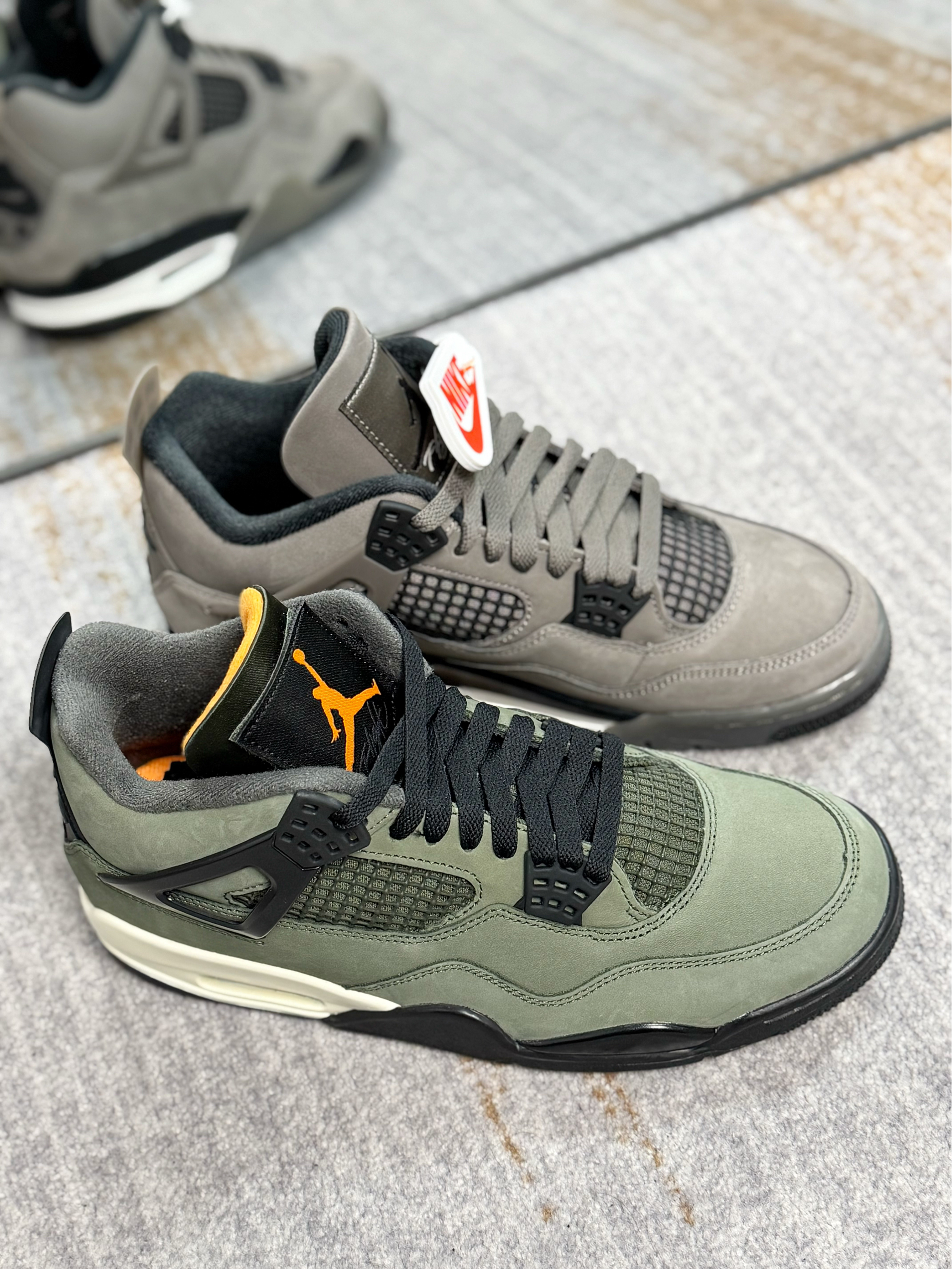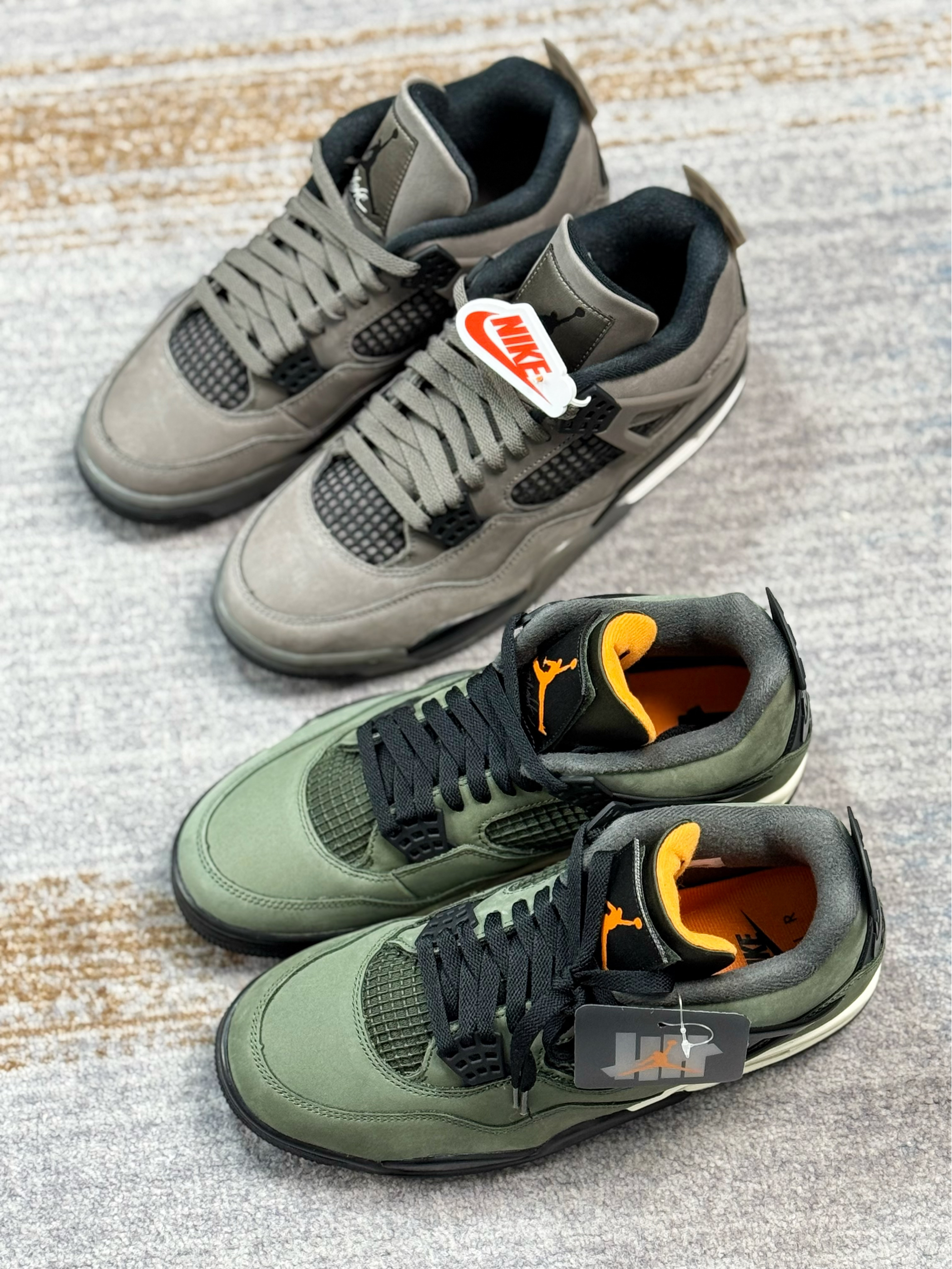 这两双AJ4都是非常有冬季氛围感的配色 一双是UND联名款,一双是棕色普款 UND军绿色比较有户外运动的风格 棕色普款更适合秋冬,复古气息十足 都是麂皮材质打造,质感方面都相当在线 内衬都是有加厚填充,保暖以及包裹感很足 两双上脚都好看,搭配牛仔裤、工装裤都不错 尺码方面偏小,脚宽的朋友建议选大一码 对于这双鞋有疑问,欢迎评论区留言👇