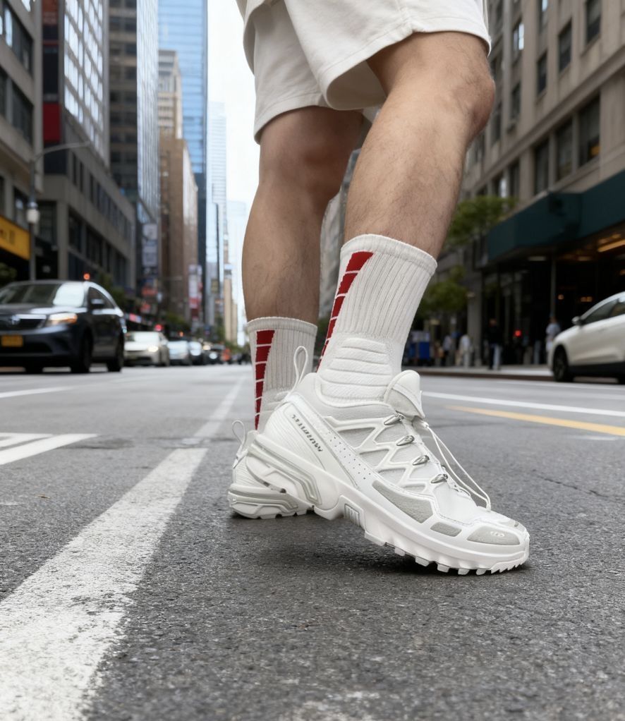 兄弟们!这双纯白机能老爹鞋真的把“城市户外双适配”焊在脚上了! 纯白机能风鞋型潮酷又硬核,搭配红白袜和白短裤,往都市街头一踩,户外潮男的氛围感直接拉满。日常城市通勤、周末轻户外徒步,它都能完美驾驭。 性能方面亮点满满:中底缓震回弹很给力,长时间走路膝盖无压力;鞋面拼接材质耐磨又抗造,应对街头、郊野多种场景都ok;外底大纹路抓地力超强,雨天、砂石路走路都稳稳当当。 如果你想要一双“既能都...