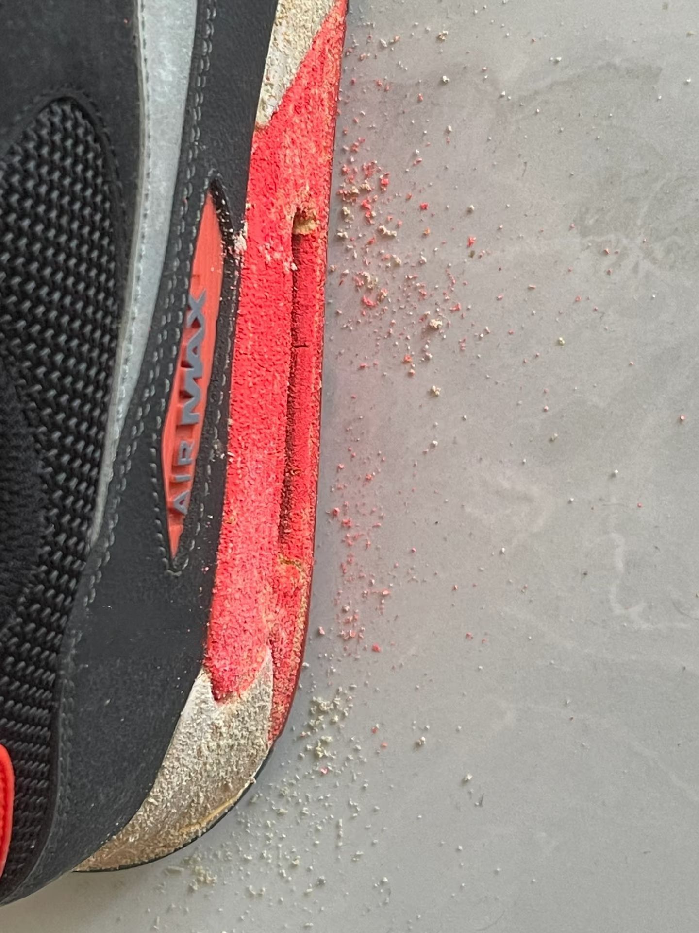 买了好几年了 一年多没拿出来穿过了 擦干净放回了鞋盒 今天想拿出来穿穿AIR MAX垫高一下 拿出来发现表面挺多裂纹了 老化了也正常 结果一上脚...直接碎了