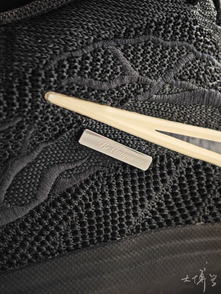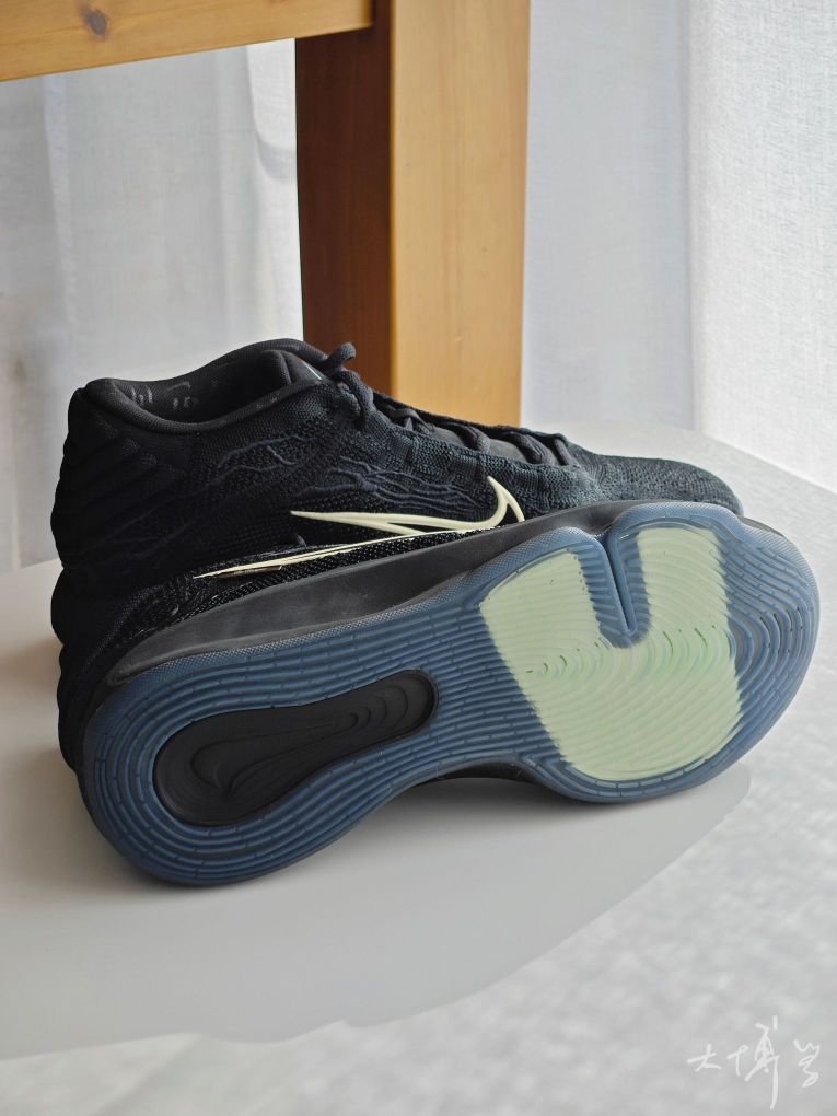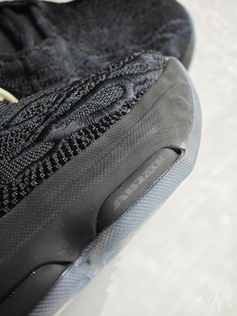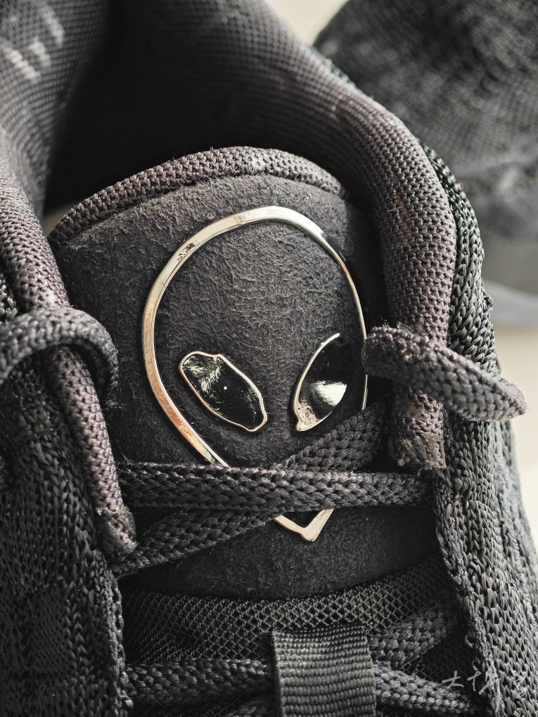 一双全黑配色的G.T. Hustle 3 鞋舌的外星人logo 因为这是文班亚马的战靴 鞋面的复杂车线设计模拟“蛛网”结构 编织鞋面,透气性不错 Zoom气垫,脚感偏软 上脚包裹感紧致,鞋楦适合大多数脚型