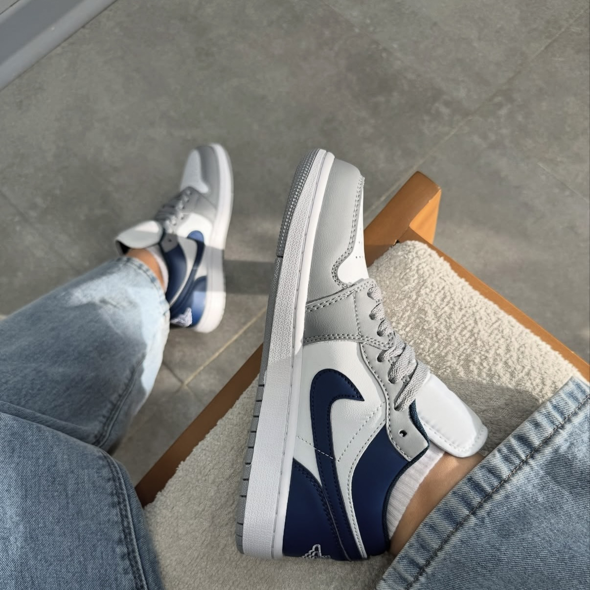 今天这双AJ1 Low一上脚,直接把“日常好穿”焊在鞋上了! 雾霾灰+藏青+奶白的拼色太会了——浅灰像揉开的云,藏青勾边是冷调里的点睛笔,奶白鞋头又中和了锐利感,低帮鞋型裹在牛仔裤脚里,连脚踝露出来的小截袜子都刚好适配。 摸到手才懂质感:鞋头气孔是细密的小圆点,灰皮部分是软乎乎的荔枝纹,藏青区域是亮面皮革,光线下会泛点低调的光泽。鞋舌的飞人标是刺绣的,连鞋帮内侧的走线都齐整得像打印出来的。